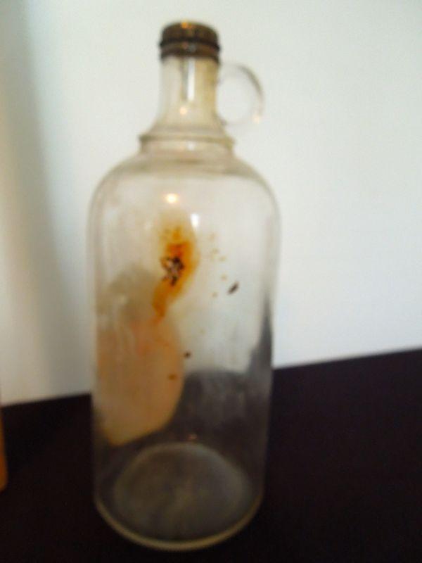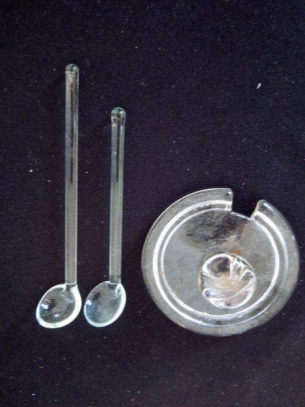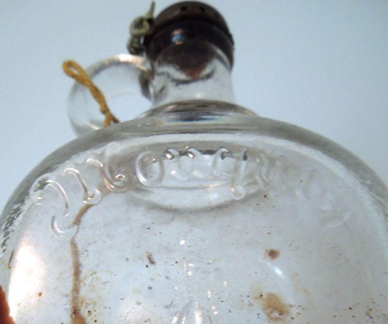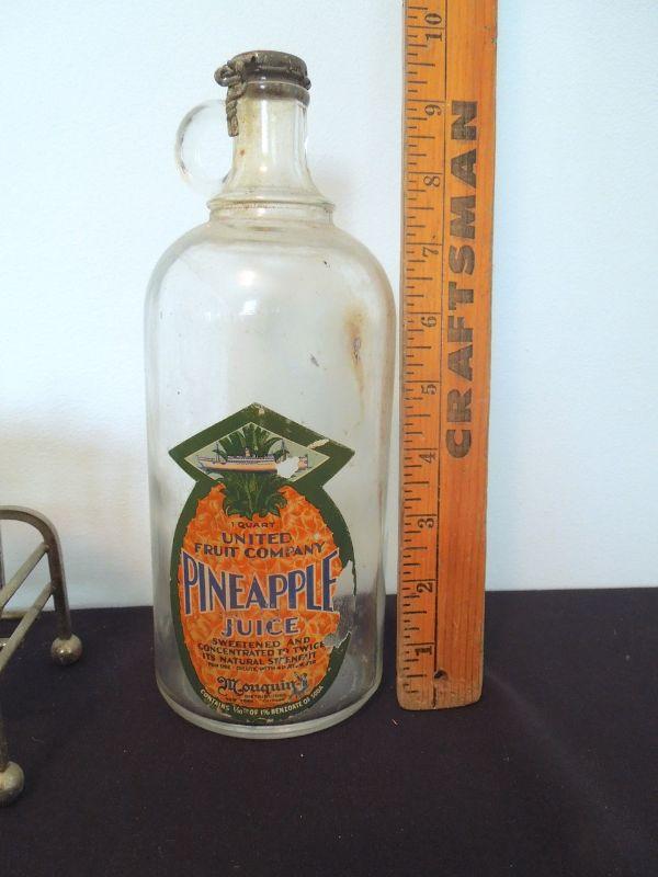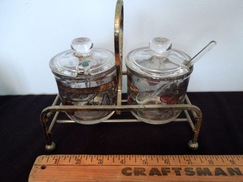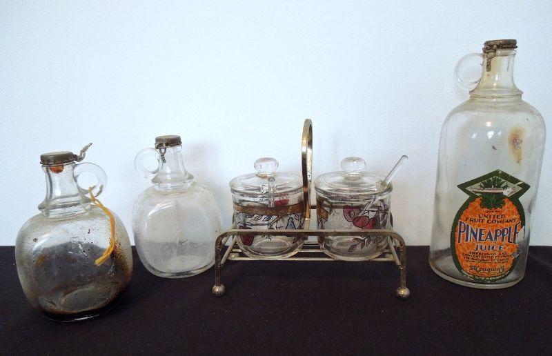Metal caddy with two covered jelly jars with fruit design and glass jelly spoons. A one quart Monquin pineapple juice screw capped jar with paper graphic emblem. Two Monquin screwtop beverage containers. One has a thick dark syrup film in bottom. Glass is embossed with Monquin logo.