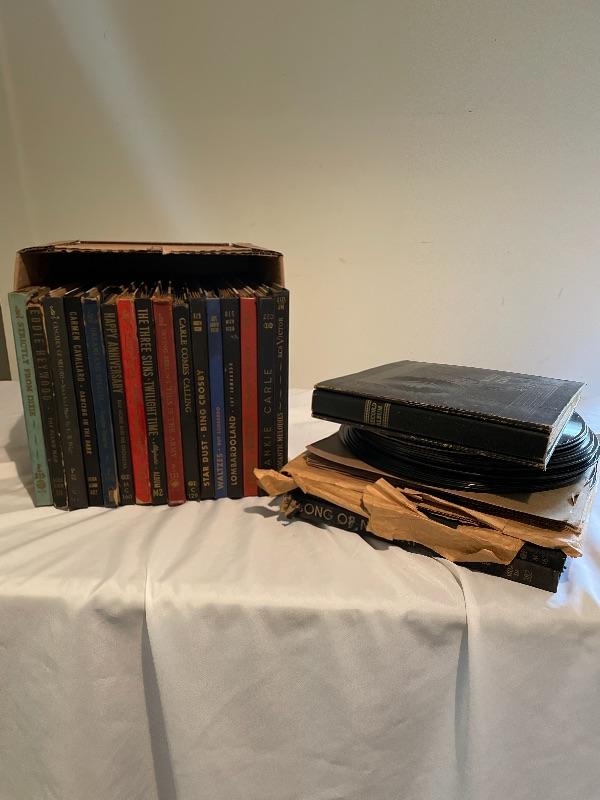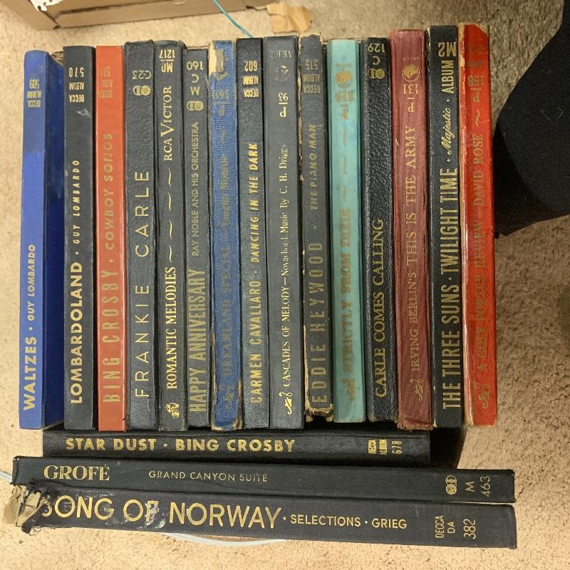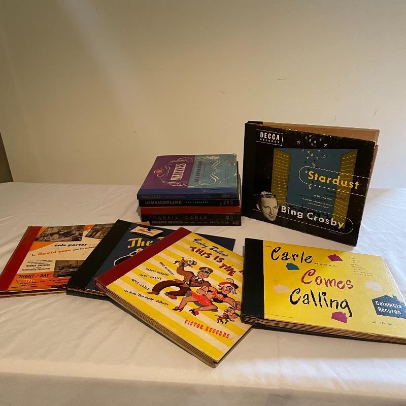 This lot includes various records. Some are sets. Some are single records. Some are 10” and some are 12”. Included are: Stardust by Bing Crosby, Waltzes by Guy Lombardo, Cowboy Songs by Bing Crosby, Romantic Melodies, Irving Berlin’s This is the Army, A Cole Porter Review by David Rose, The Piano Man by Eddie Heywood, Dreamland Special by Vaughn Moore, and more!