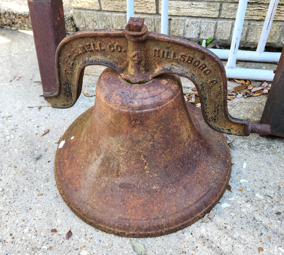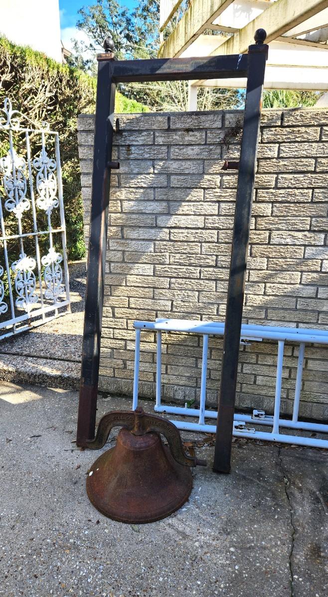Cast Iron Plantation Style Bell with stand - note: one side of bell attachment is broken off in the stand (see photos) - can be repaired. Inscription on bell reads: G.S. Bell Co - Hillsboro - Ohio". Frame is 82" tall, 32.5" wide.