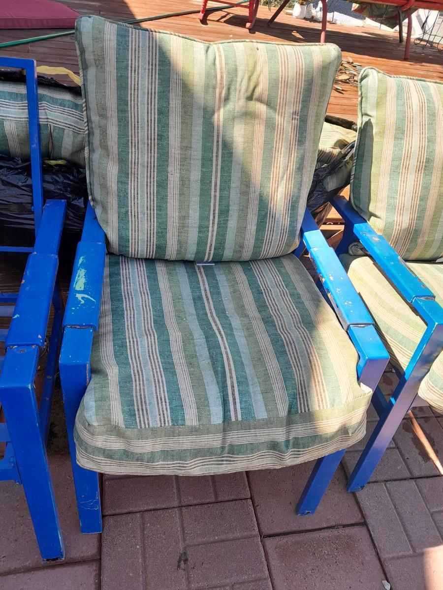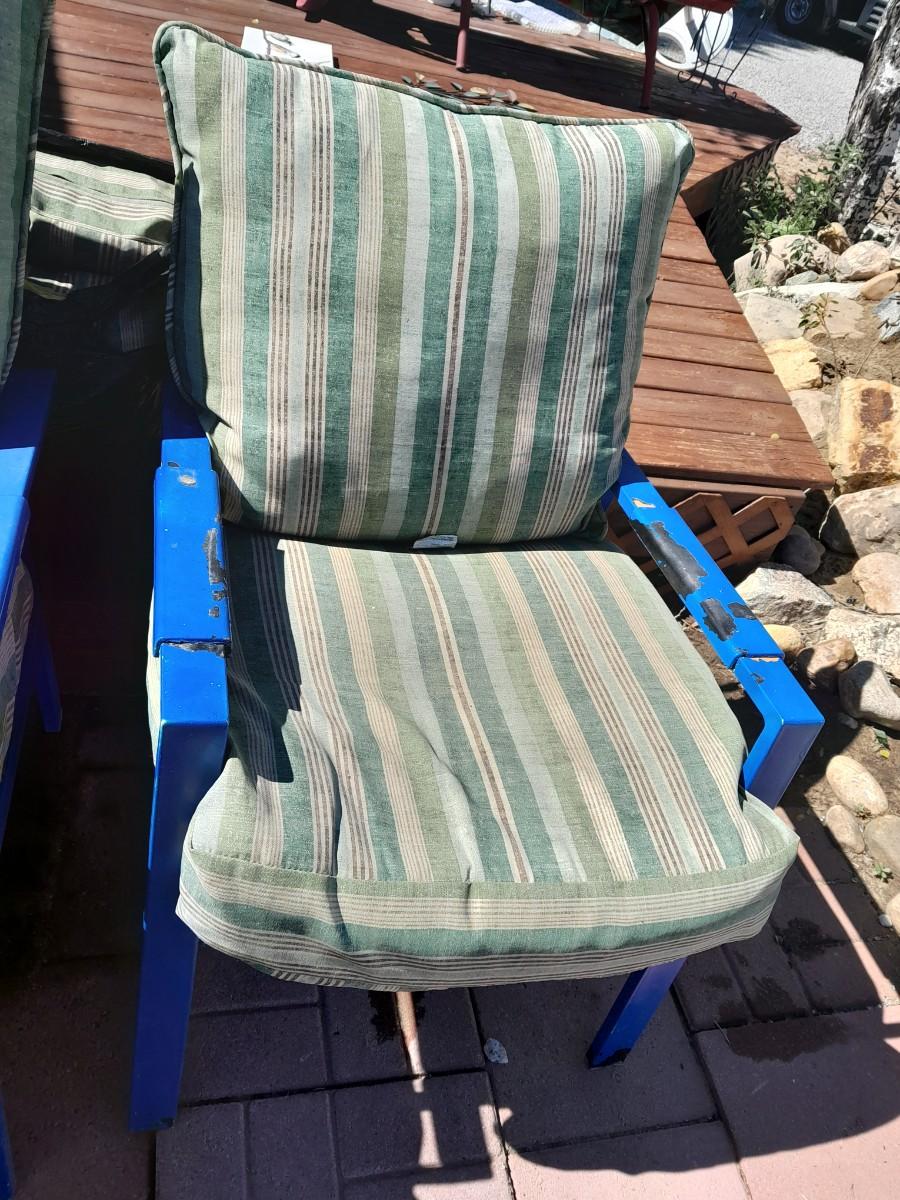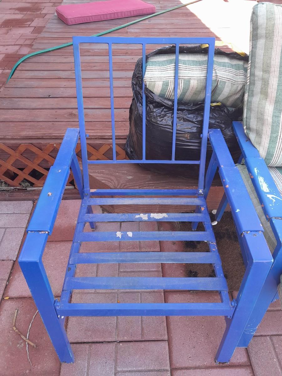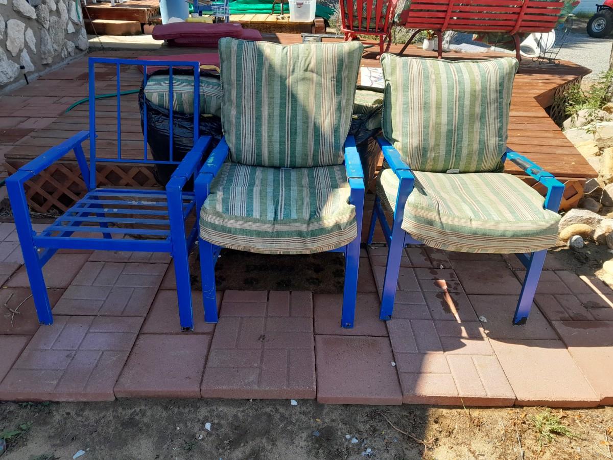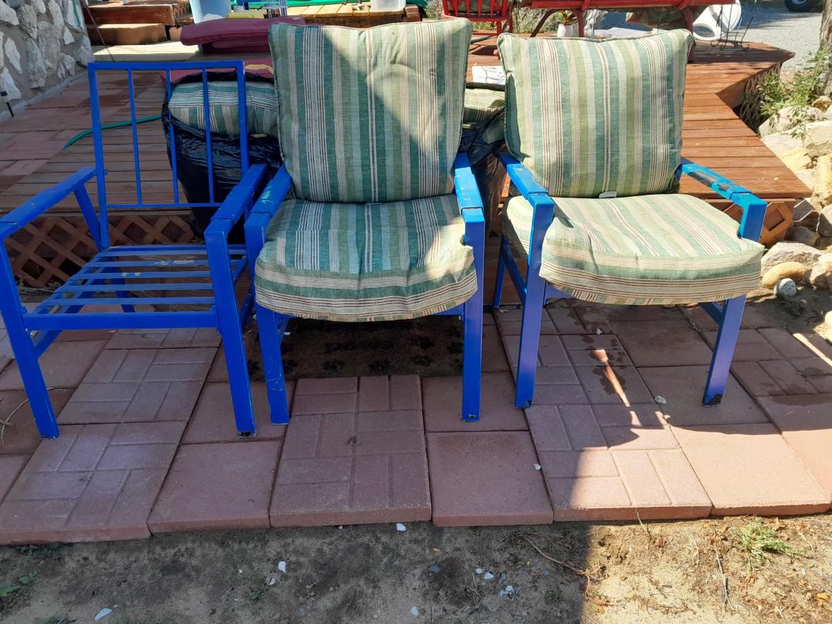 THREE METAL VINTAGE BLUE PATIO CHAIRS WITH CUSHIONS
