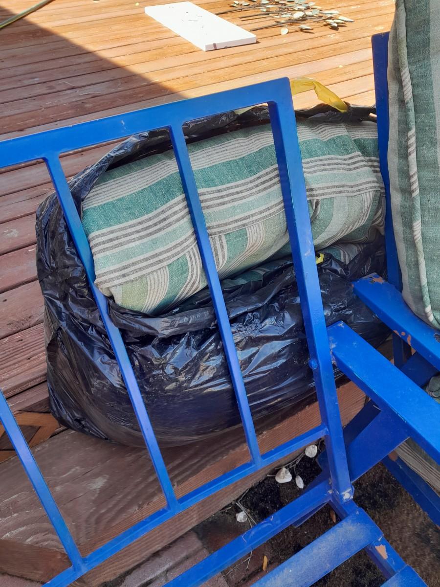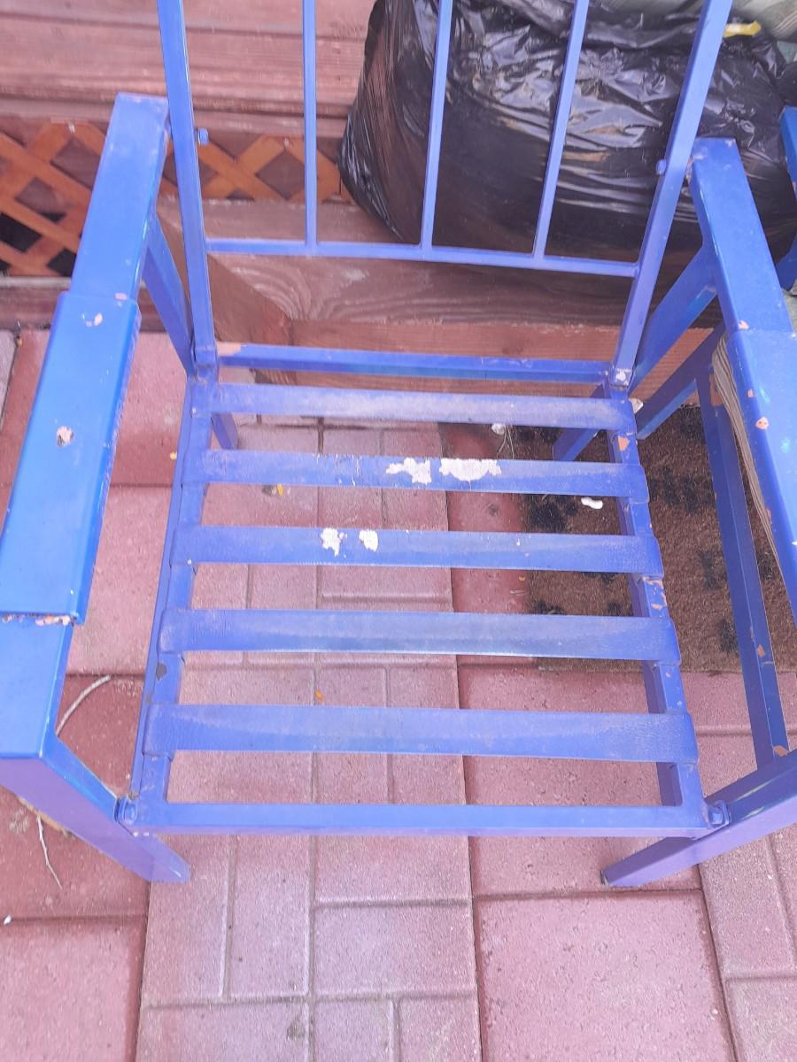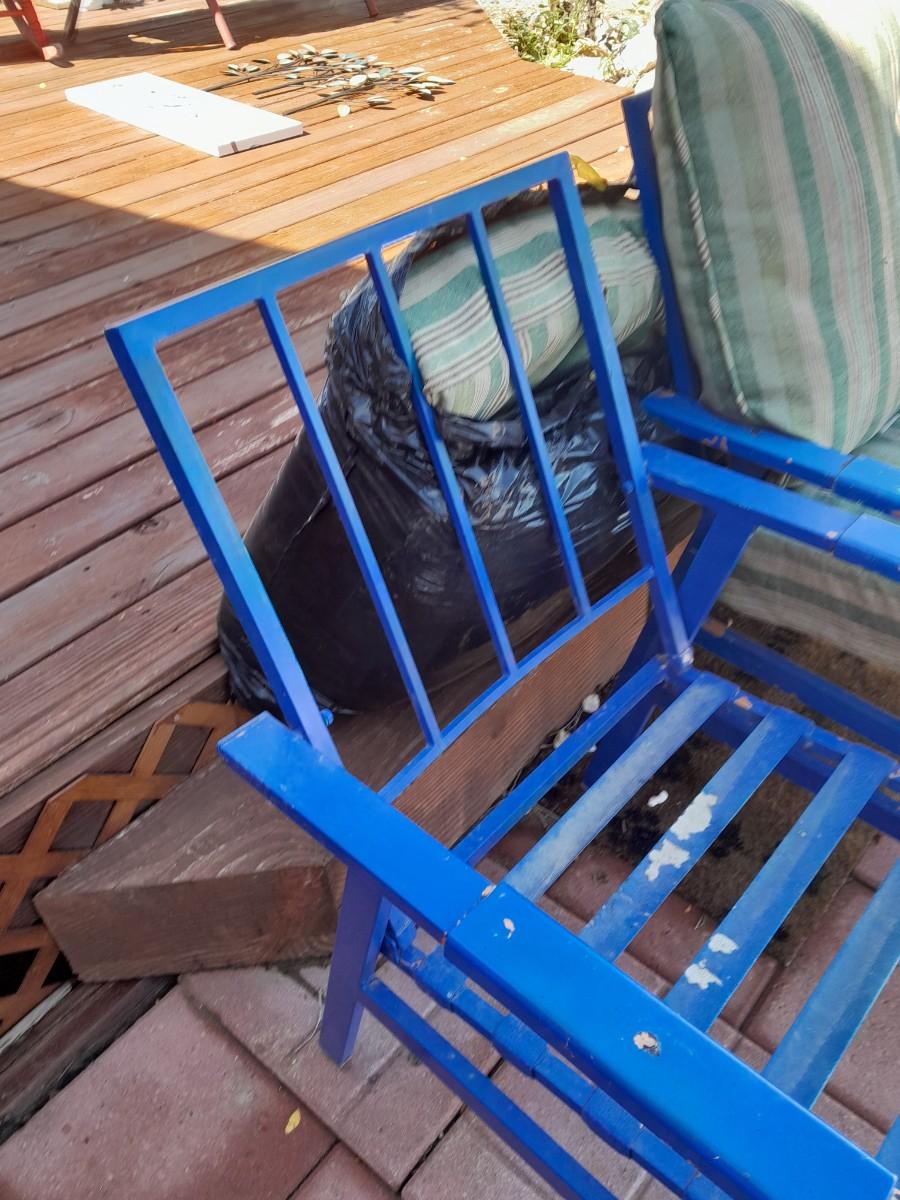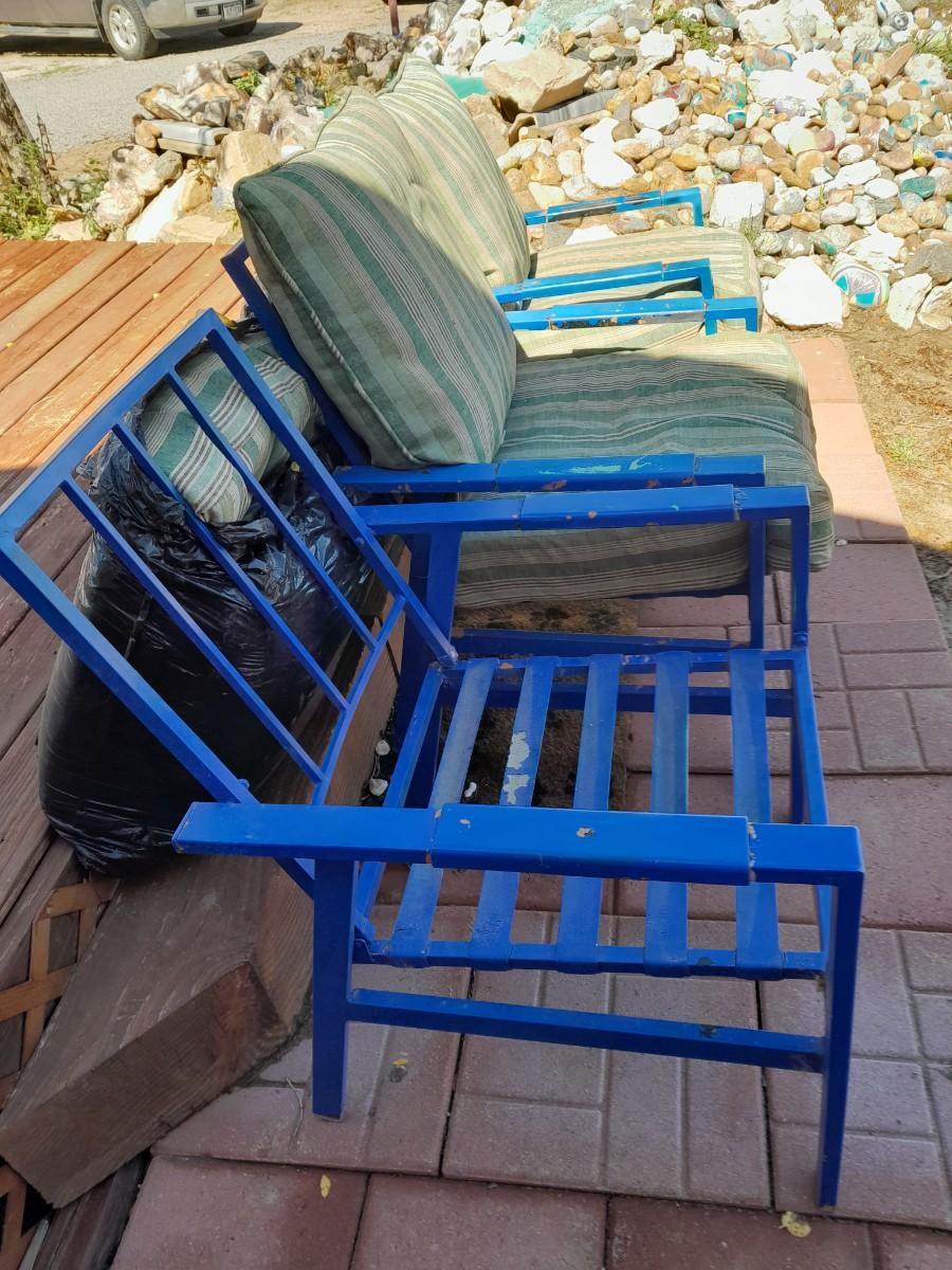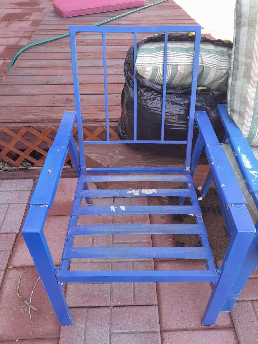 THREE METAL VINTAGE BLUE PATIO CHAIRS WITH CUSHIONS