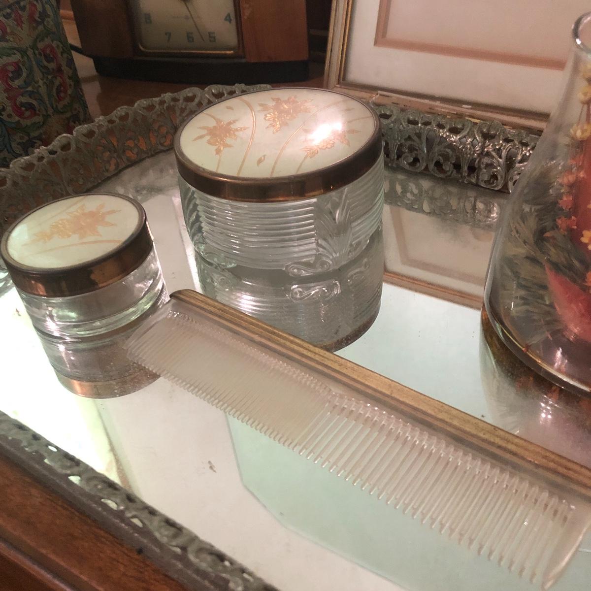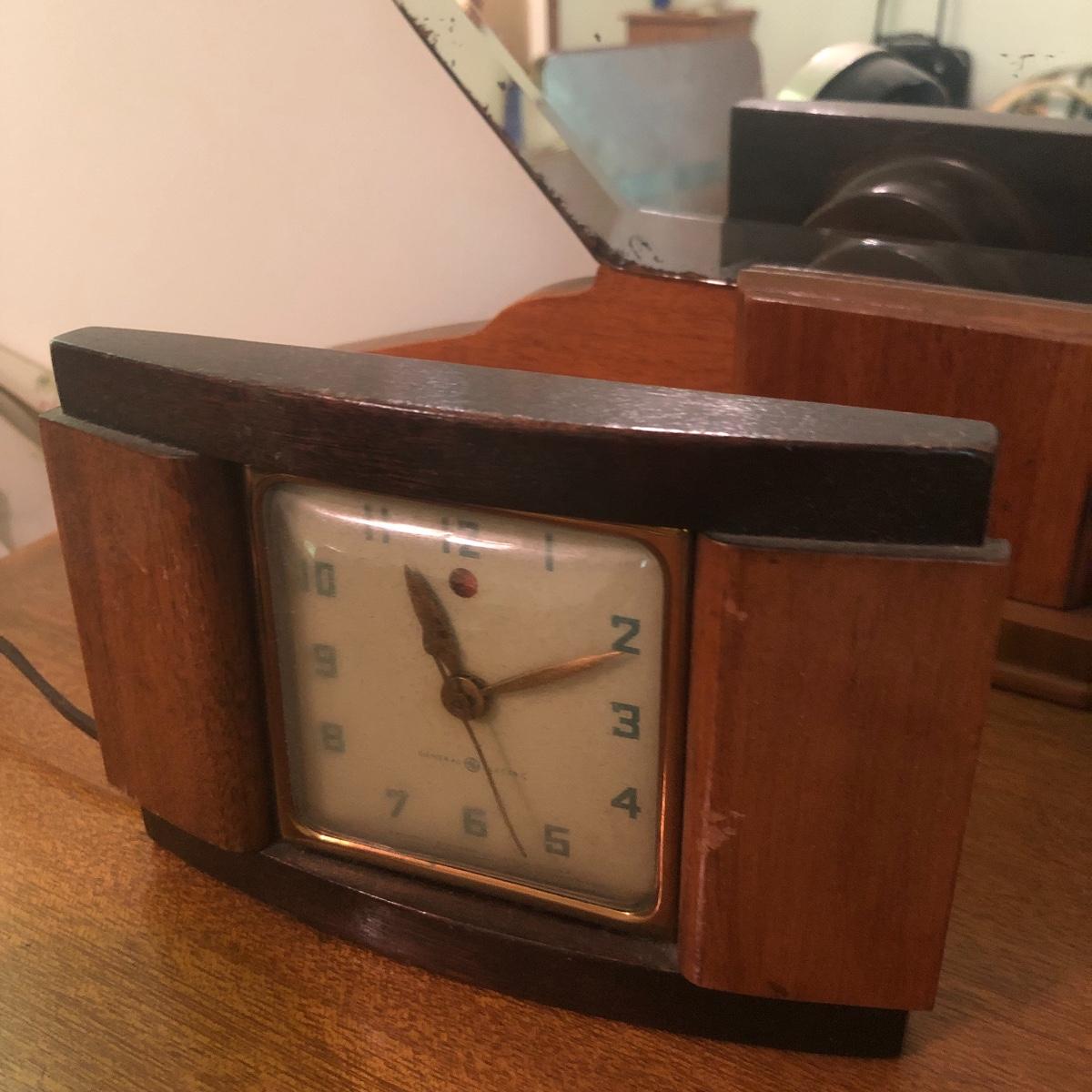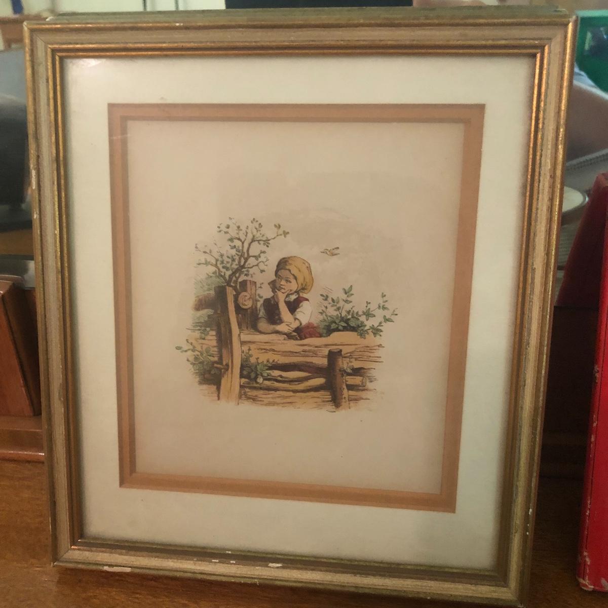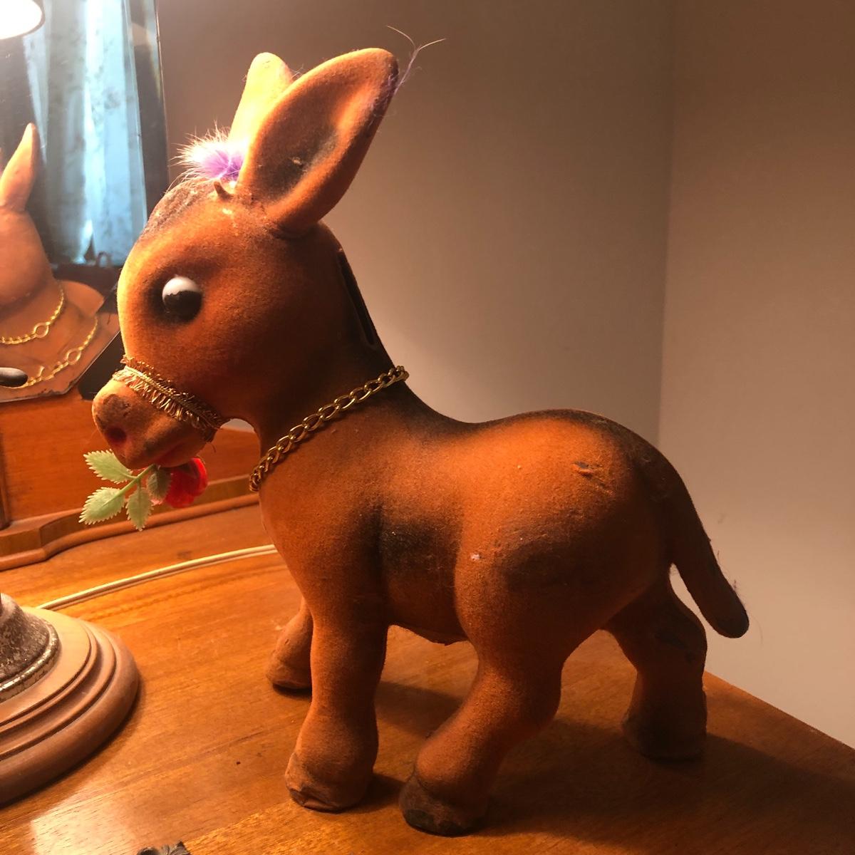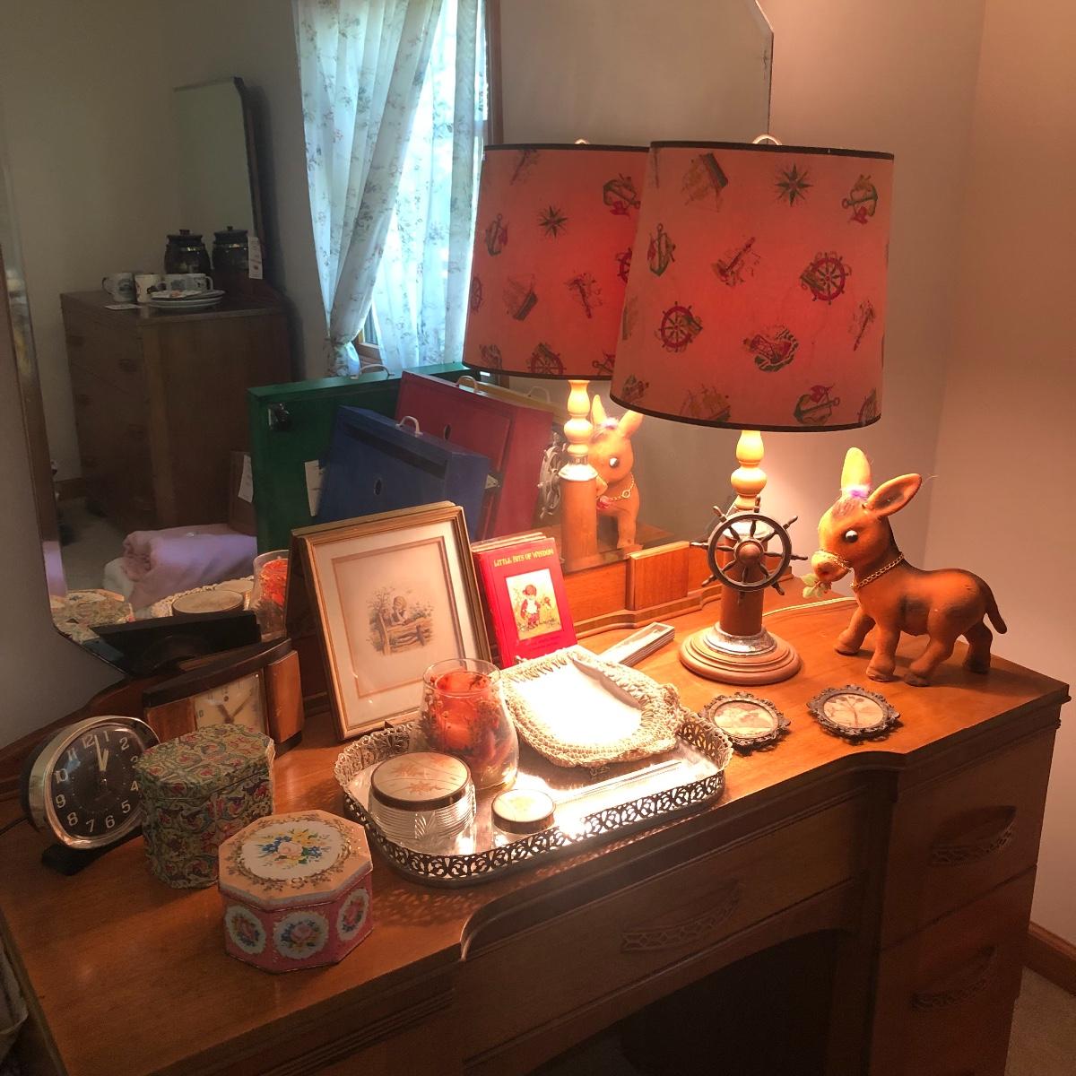 Get nostalgic with this lot! It contains a donkey bank, a Weston wind up clock (it ticks when wound), an electric GE clock (it runs when plugged in), a candle, two framed tree scenes, a leather stitched purse, two metal tins, a book, a framed picture of a girl, a lamp, two fans, a gold lined comb, a mirrored vanity tray and two glass jars with metal lids. The vanity tray measures 14.5” x 10”. The picture of the girl measures 7.5” x 8.5”. The two oval pictures measures 3.5” x 5”. And finally, the lamp stands 24” tall. The leather purse has some faint discoloration and the lamp shade’s seam is unraveling a little. Local pick up only.