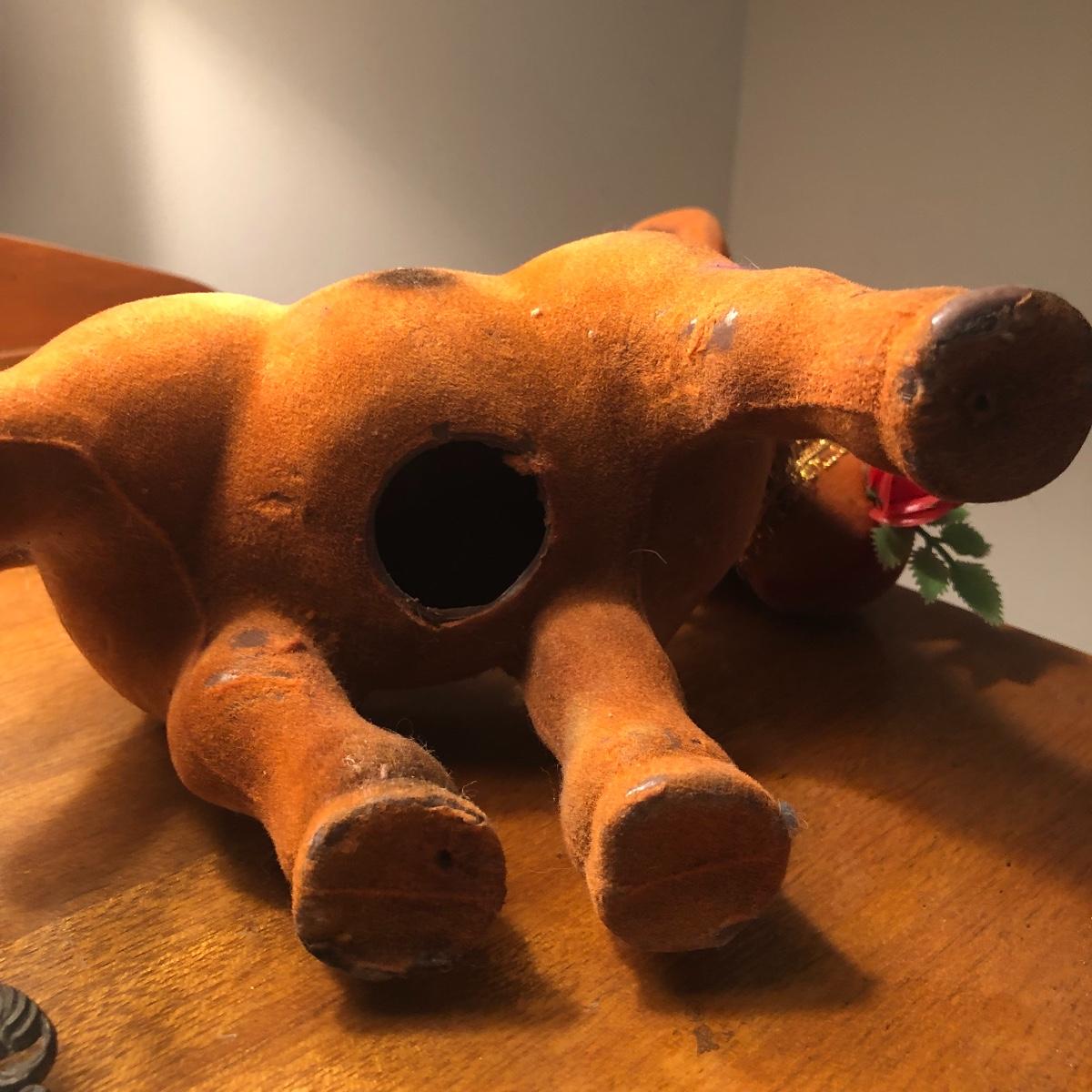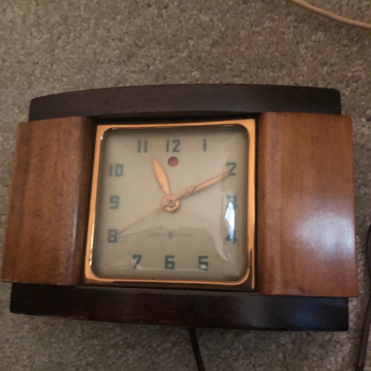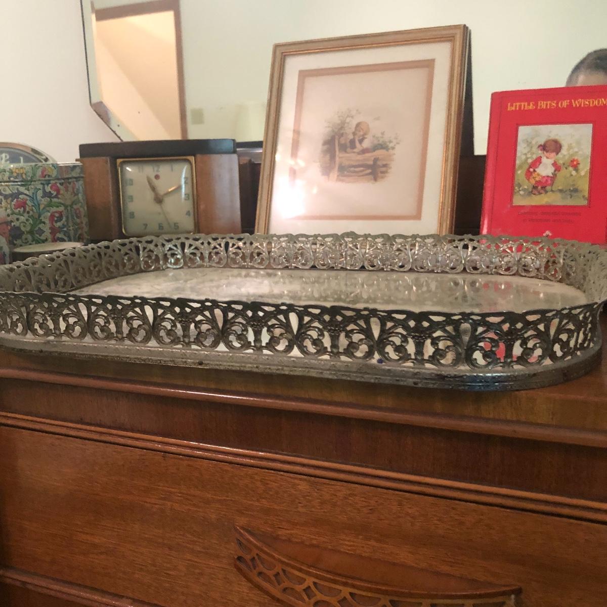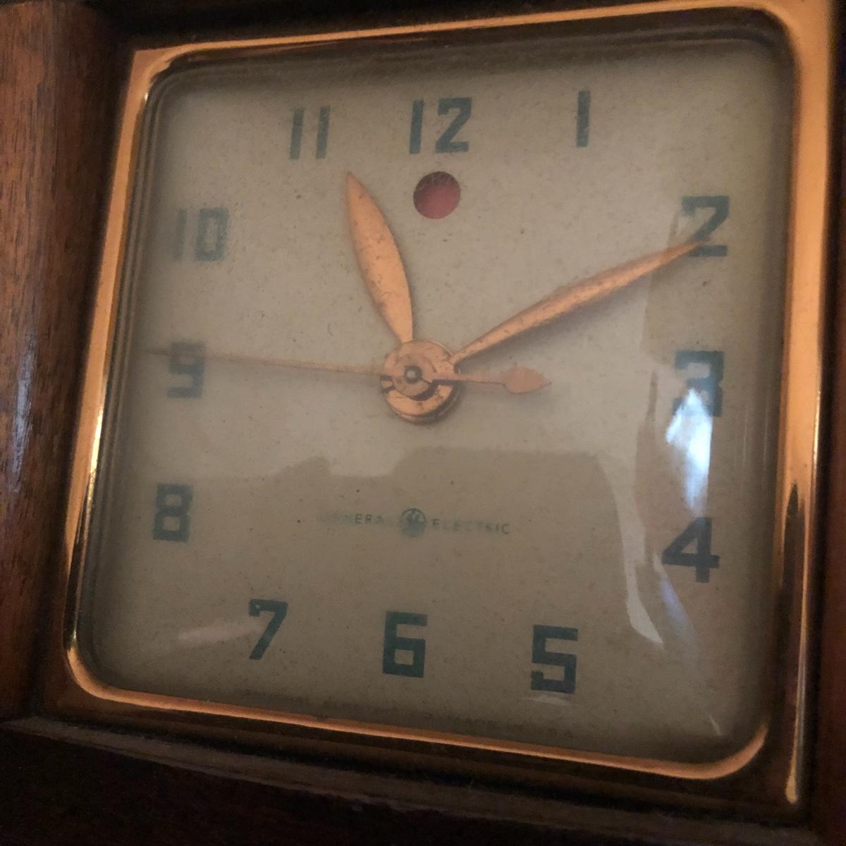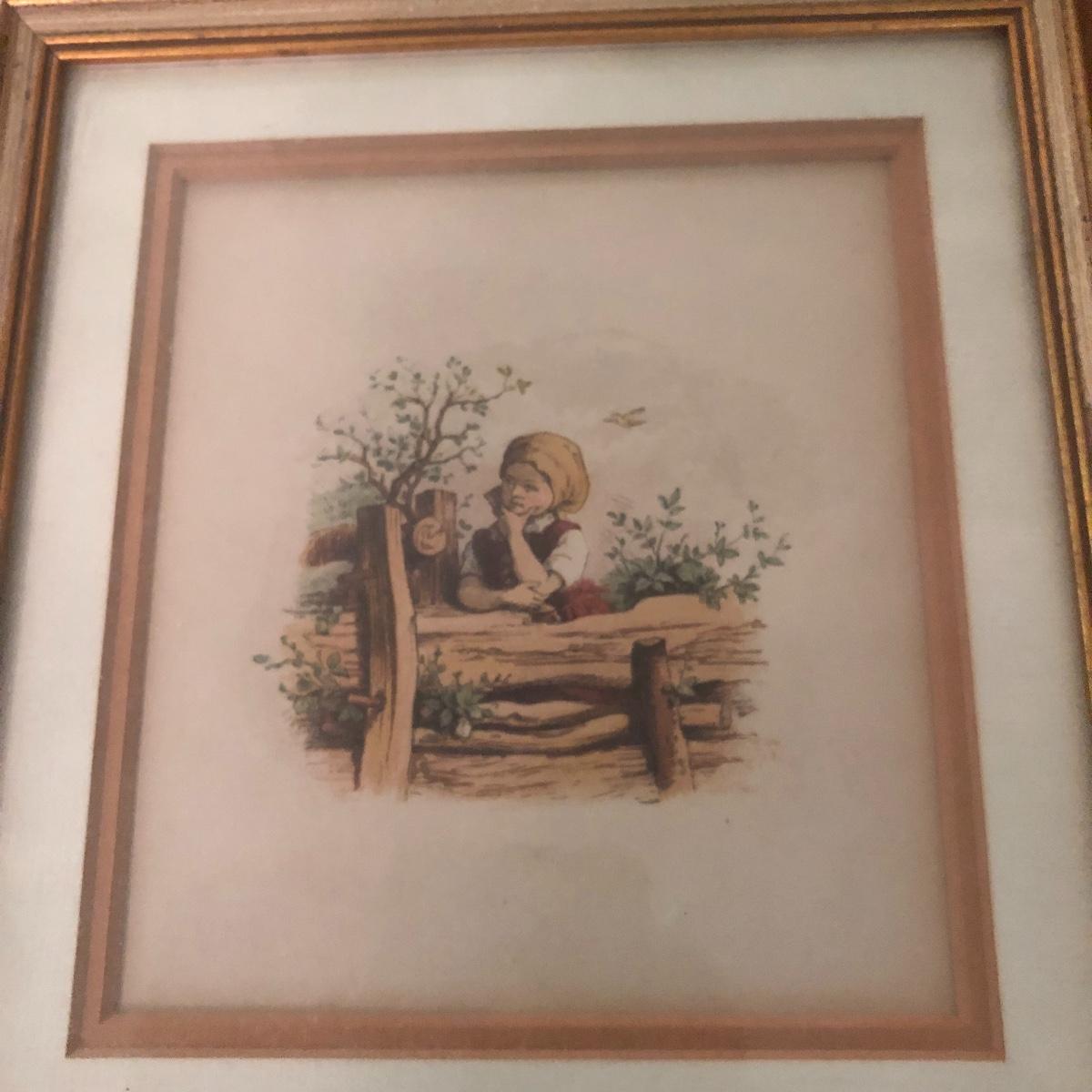 Get nostalgic with this lot! It contains a donkey bank, a Weston wind up clock (it ticks when wound), an electric GE clock (it runs when plugged in), a candle, two framed tree scenes, a leather stitched purse, two metal tins, a book, a framed picture of a girl, a lamp, two fans, a gold lined comb, a mirrored vanity tray and two glass jars with metal lids. The vanity tray measures 14.5” x 10”. The picture of the girl measures 7.5” x 8.5”. The two oval pictures measures 3.5” x 5”. And finally, the lamp stands 24” tall. The leather purse has some faint discoloration and the lamp shade’s seam is unraveling a little. Local pick up only.