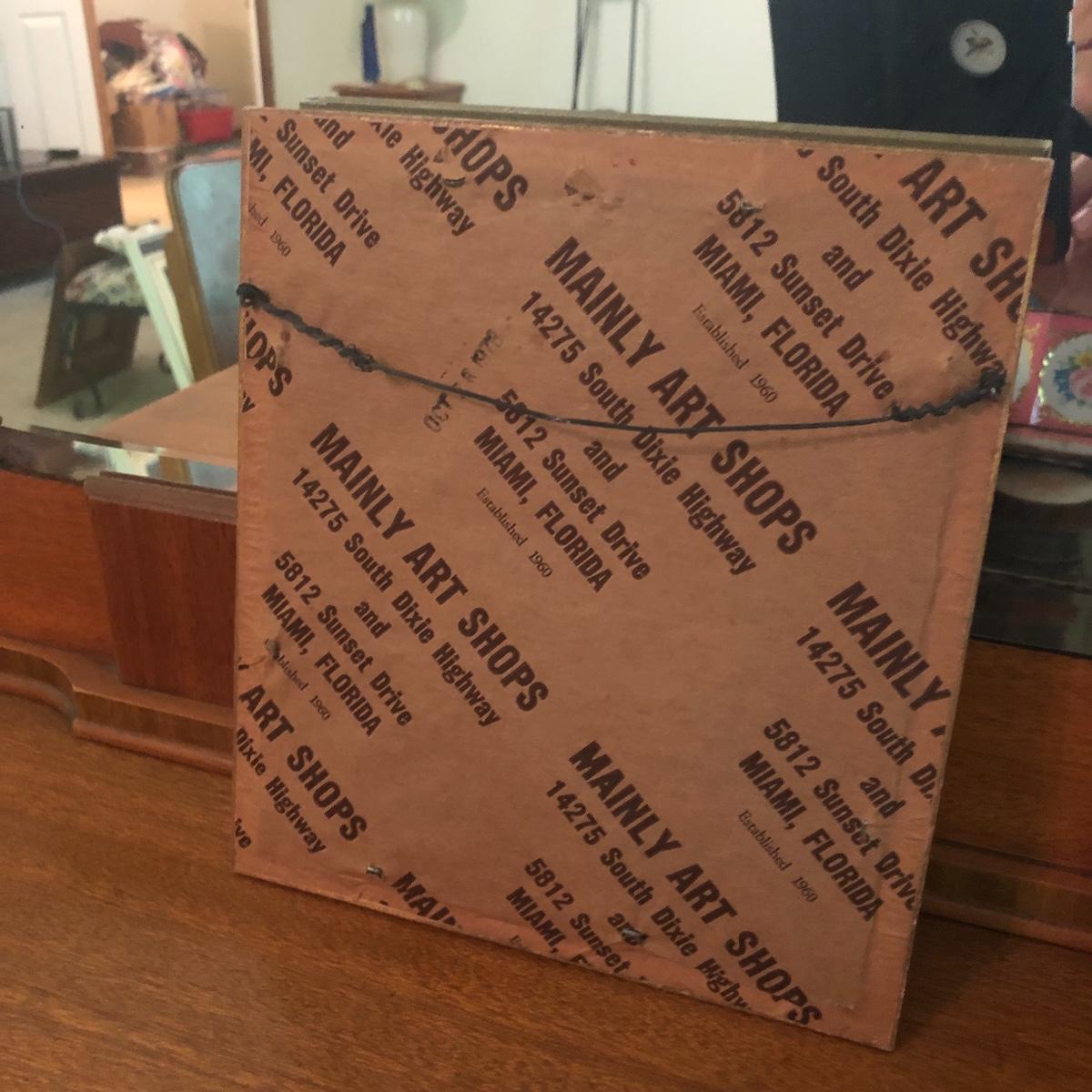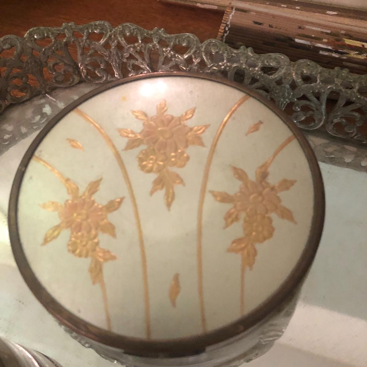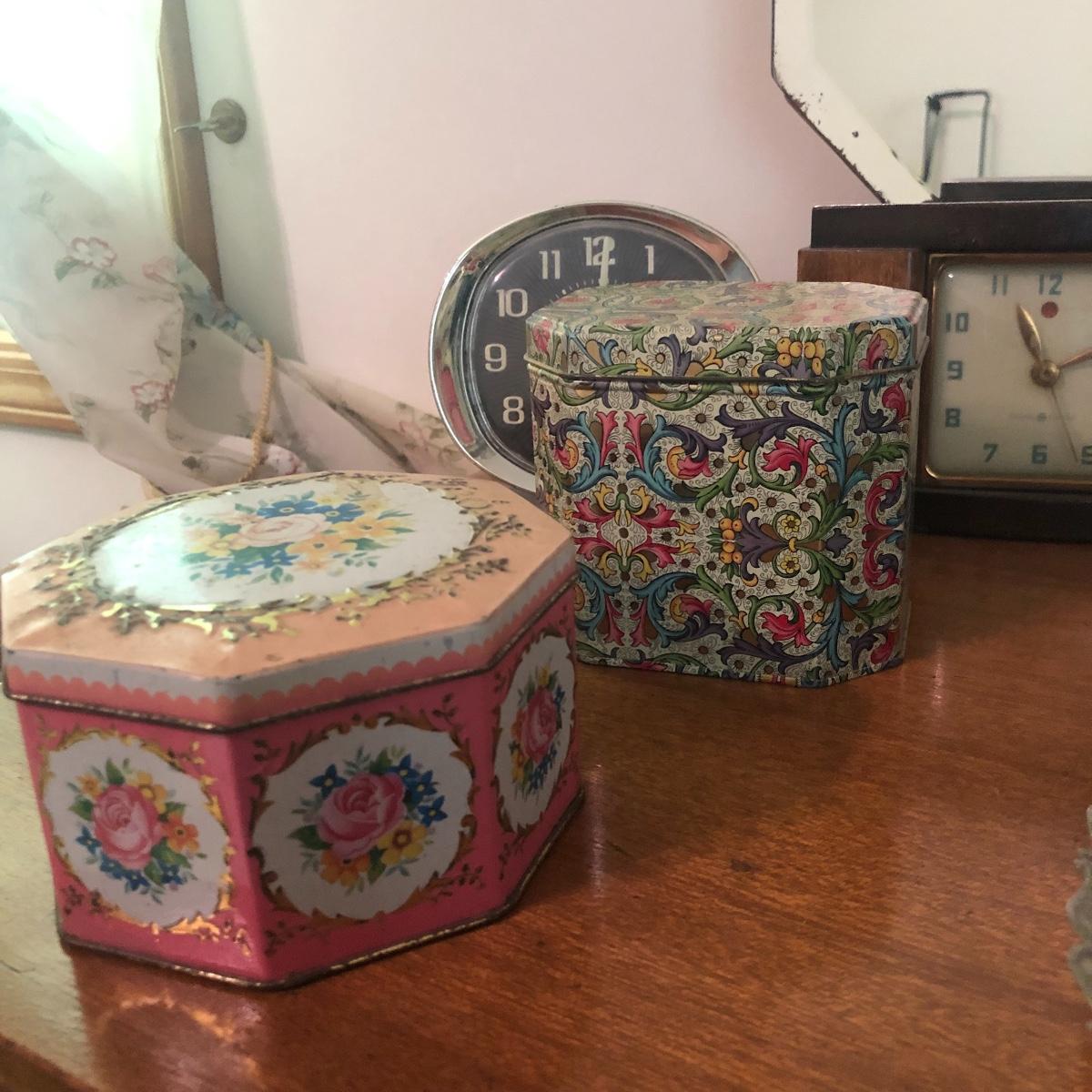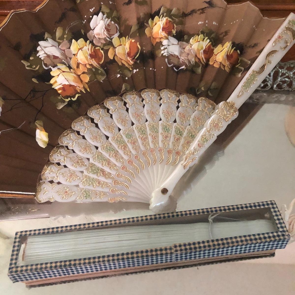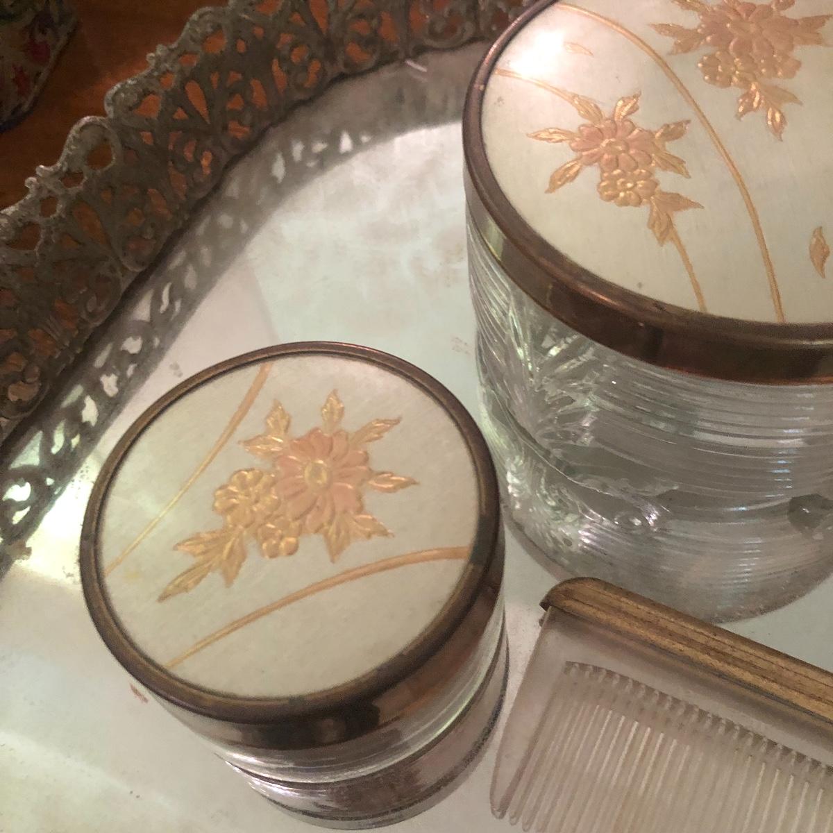 Get nostalgic with this lot! It contains a donkey bank, a Weston wind up clock (it ticks when wound), an electric GE clock (it runs when plugged in), a candle, two framed tree scenes, a leather stitched purse, two metal tins, a book, a framed picture of a girl, a lamp, two fans, a gold lined comb, a mirrored vanity tray and two glass jars with metal lids. The vanity tray measures 14.5” x 10”. The picture of the girl measures 7.5” x 8.5”. The two oval pictures measures 3.5” x 5”. And finally, the lamp stands 24” tall. The leather purse has some faint discoloration and the lamp shade’s seam is unraveling a little. Local pick up only.