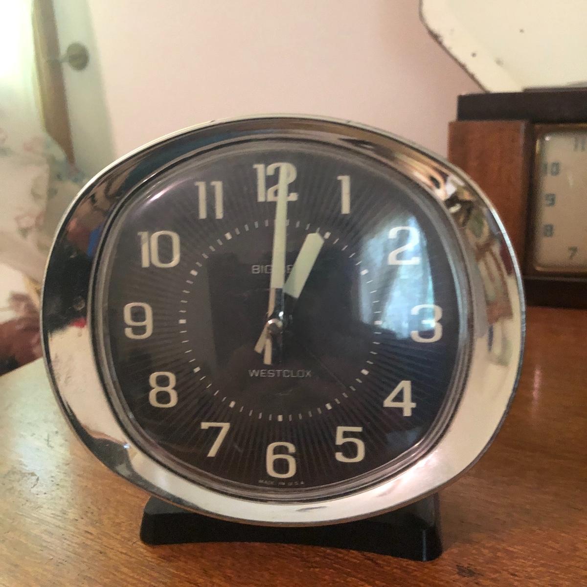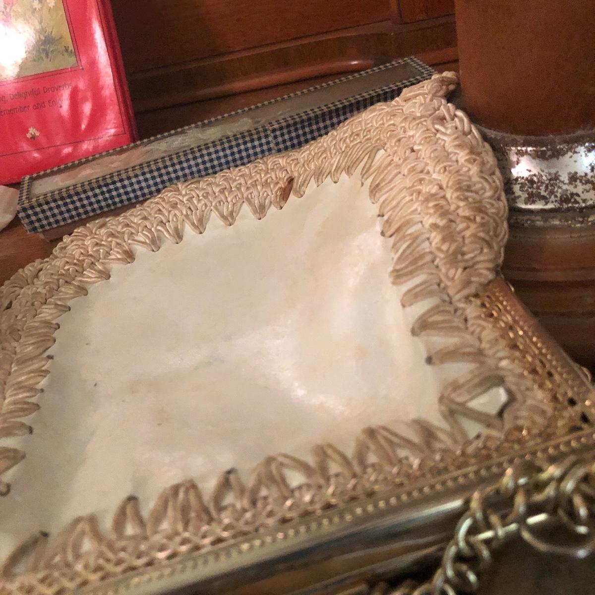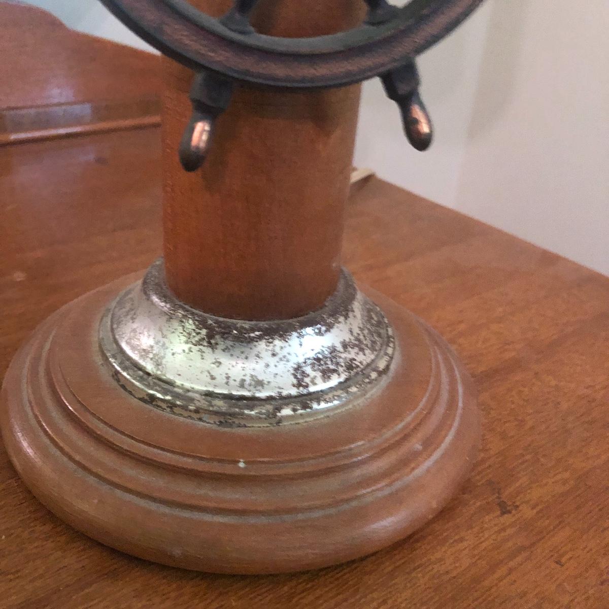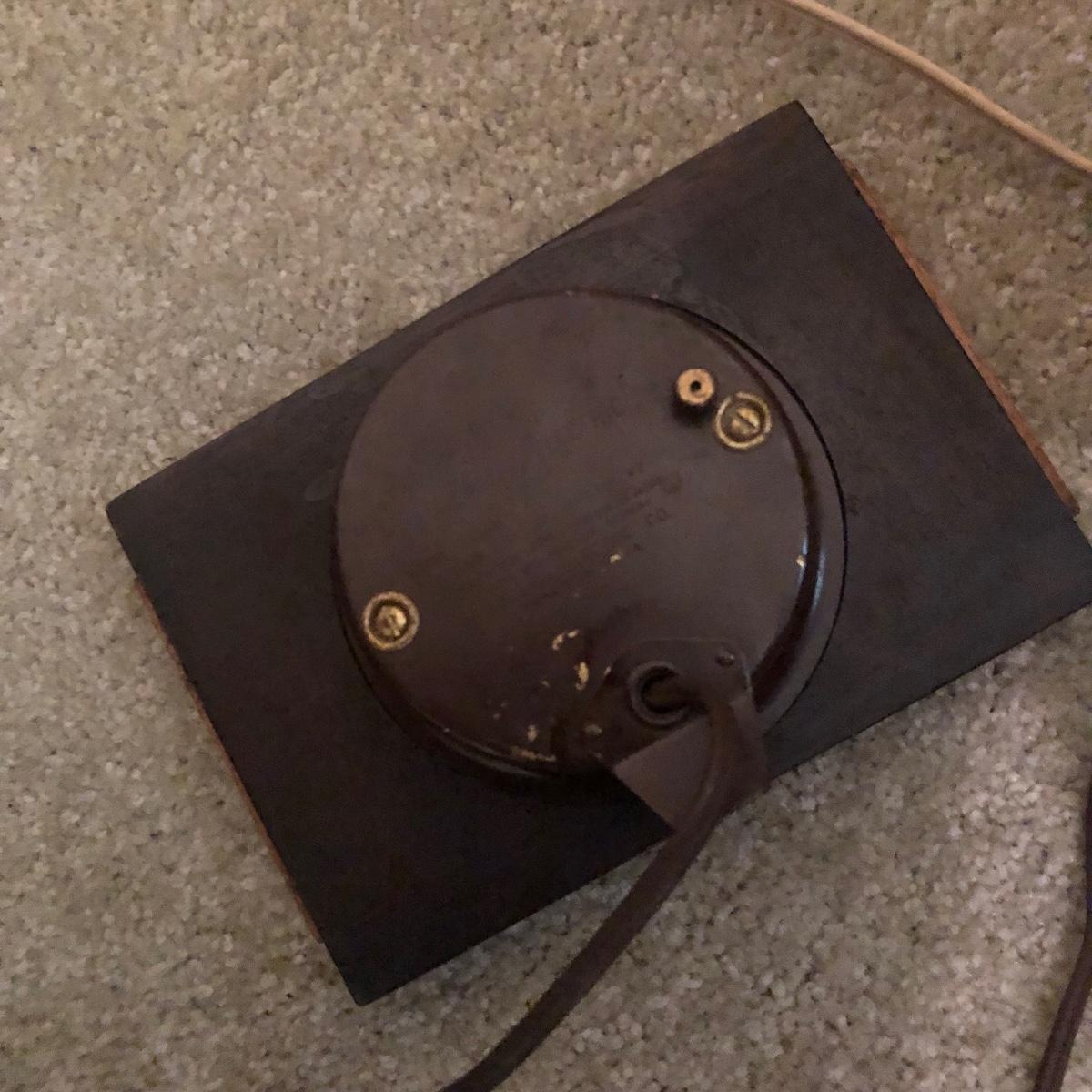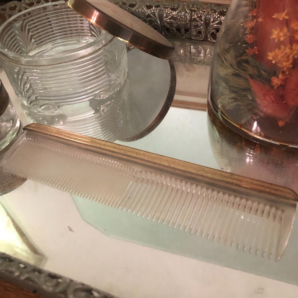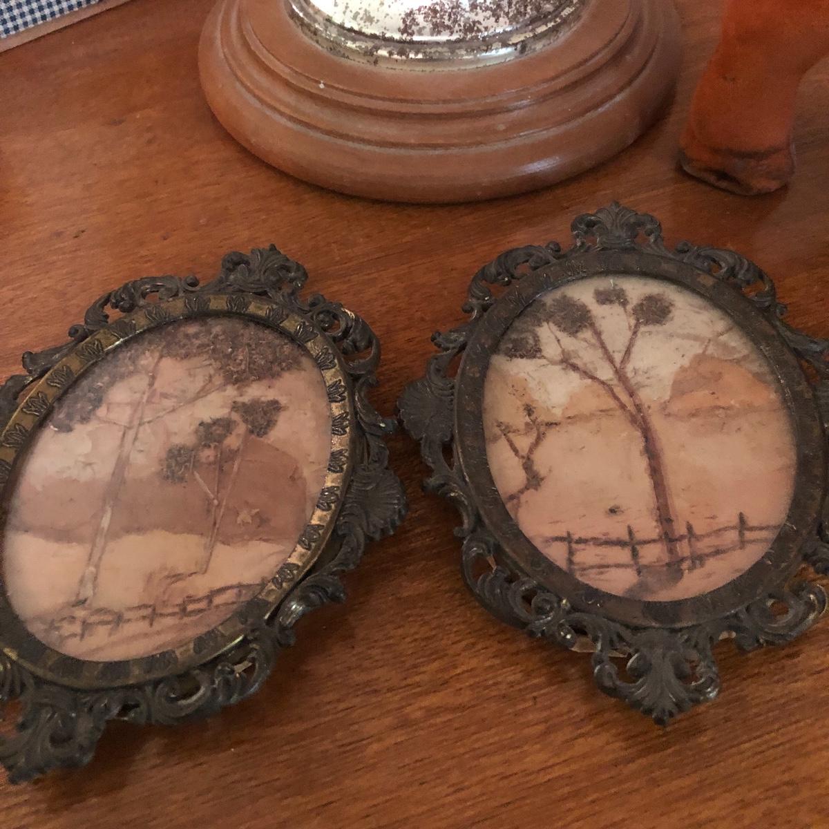 Get nostalgic with this lot! It contains a donkey bank, a Weston wind up clock (it ticks when wound), an electric GE clock (it runs when plugged in), a candle, two framed tree scenes, a leather stitched purse, two metal tins, a book, a framed picture of a girl, a lamp, two fans, a gold lined comb, a mirrored vanity tray and two glass jars with metal lids. The vanity tray measures 14.5” x 10”. The picture of the girl measures 7.5” x 8.5”. The two oval pictures measures 3.5” x 5”. And finally, the lamp stands 24” tall. The leather purse has some faint discoloration and the lamp shade’s seam is unraveling a little. Local pick up only.