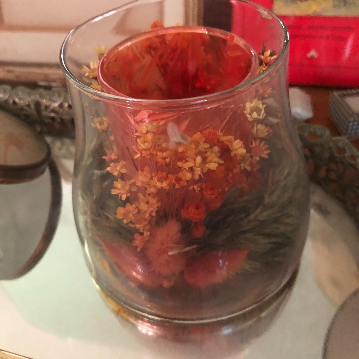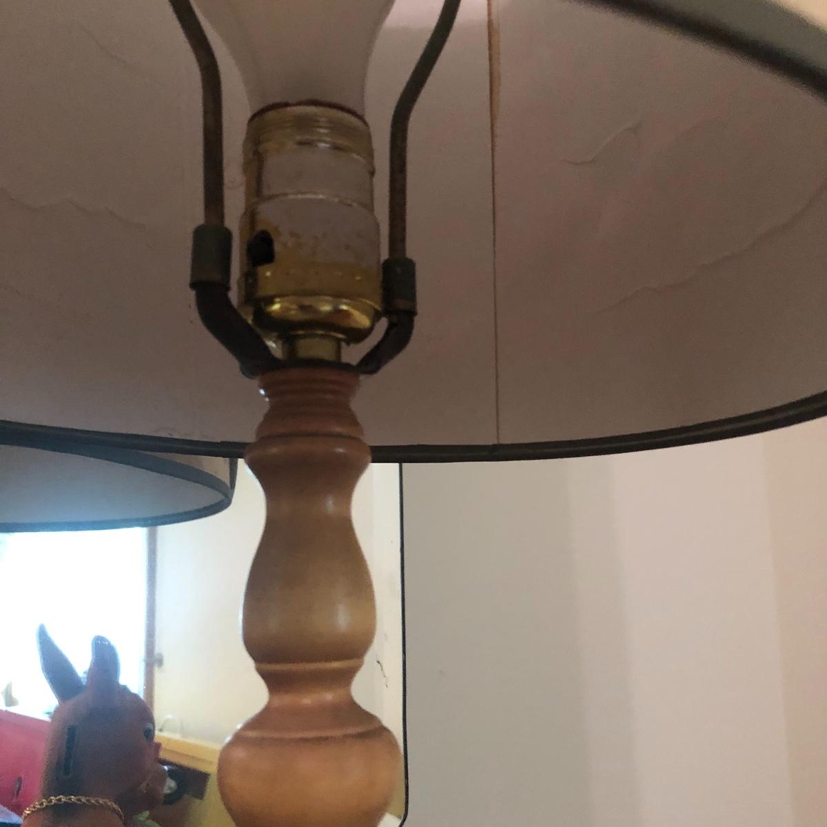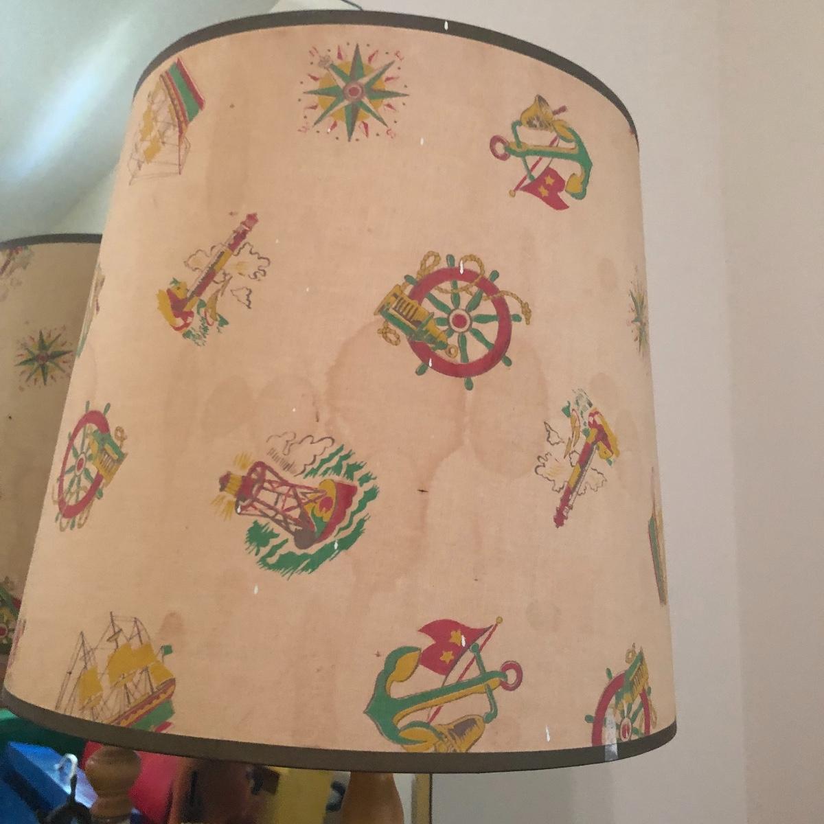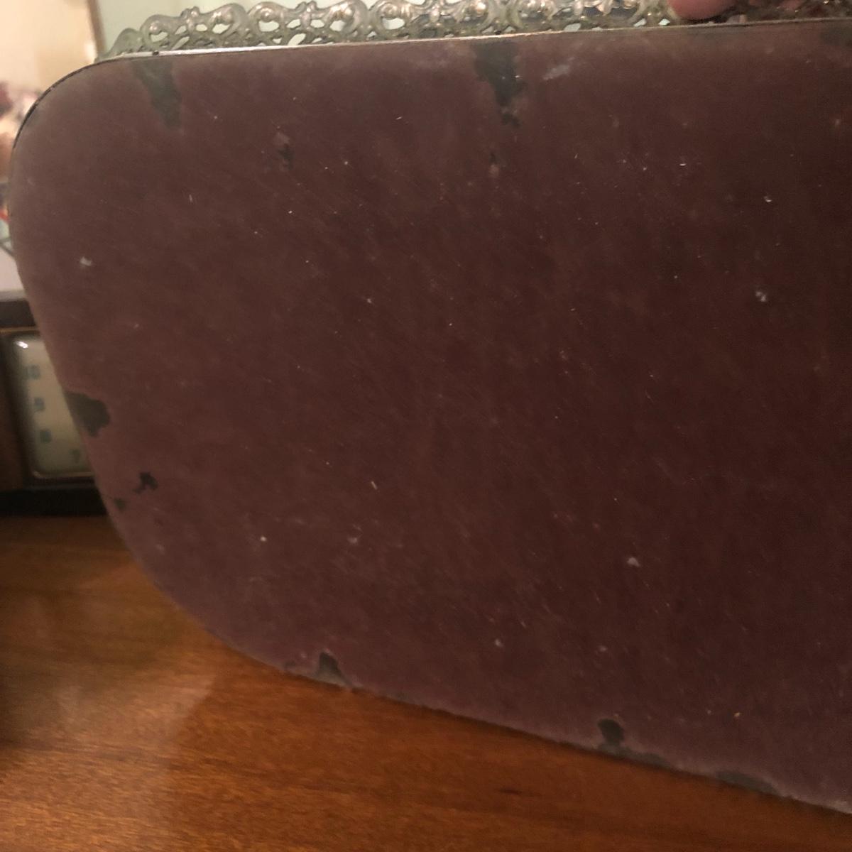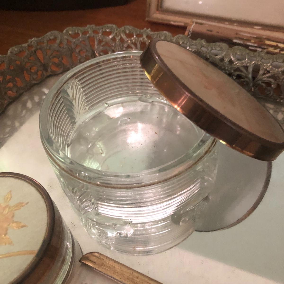 Get nostalgic with this lot! It contains a donkey bank, a Weston wind up clock (it ticks when wound), an electric GE clock (it runs when plugged in), a candle, two framed tree scenes, a leather stitched purse, two metal tins, a book, a framed picture of a girl, a lamp, two fans, a gold lined comb, a mirrored vanity tray and two glass jars with metal lids. The vanity tray measures 14.5” x 10”. The picture of the girl measures 7.5” x 8.5”. The two oval pictures measures 3.5” x 5”. And finally, the lamp stands 24” tall. The leather purse has some faint discoloration and the lamp shade’s seam is unraveling a little. Local pick up only.