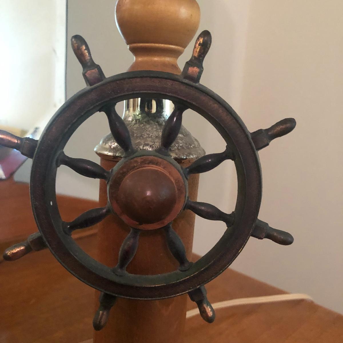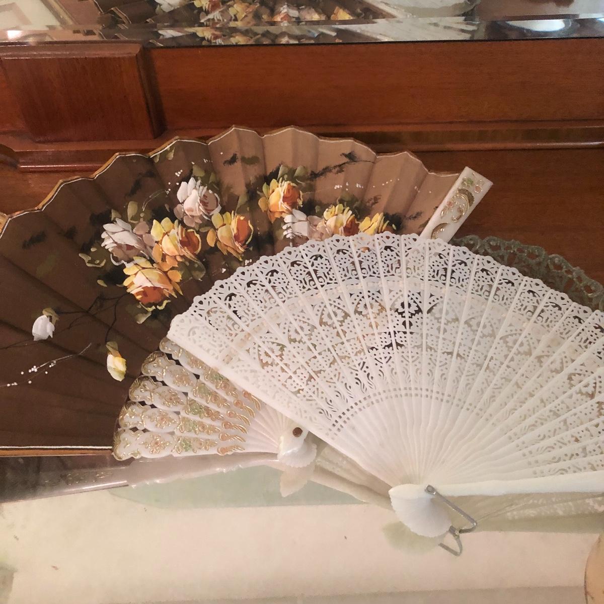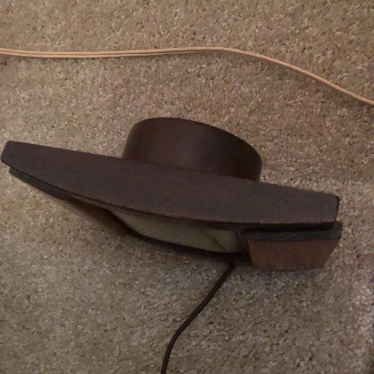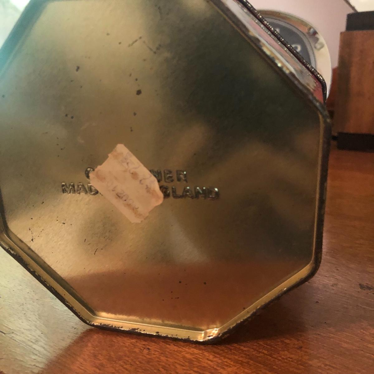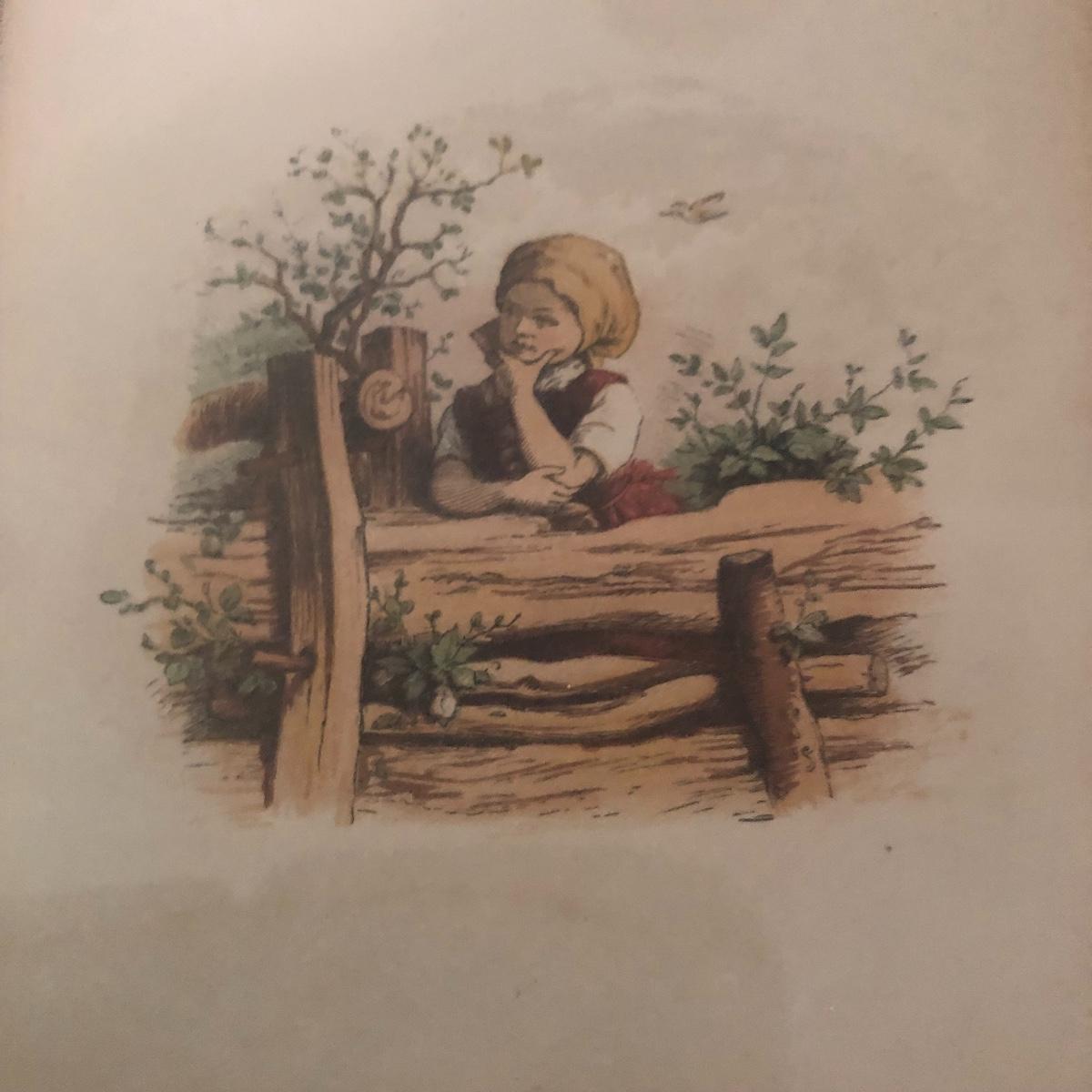 Get nostalgic with this lot! It contains a donkey bank, a Weston wind up clock (it ticks when wound), an electric GE clock (it runs when plugged in), a candle, two framed tree scenes, a leather stitched purse, two metal tins, a book, a framed picture of a girl, a lamp, two fans, a gold lined comb, a mirrored vanity tray and two glass jars with metal lids. The vanity tray measures 14.5” x 10”. The picture of the girl measures 7.5” x 8.5”. The two oval pictures measures 3.5” x 5”. And finally, the lamp stands 24” tall. The leather purse has some faint discoloration and the lamp shade’s seam is unraveling a little. Local pick up only.