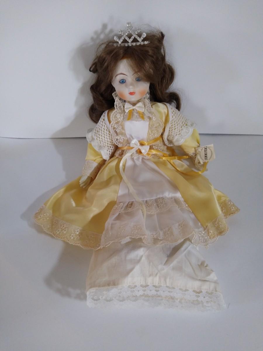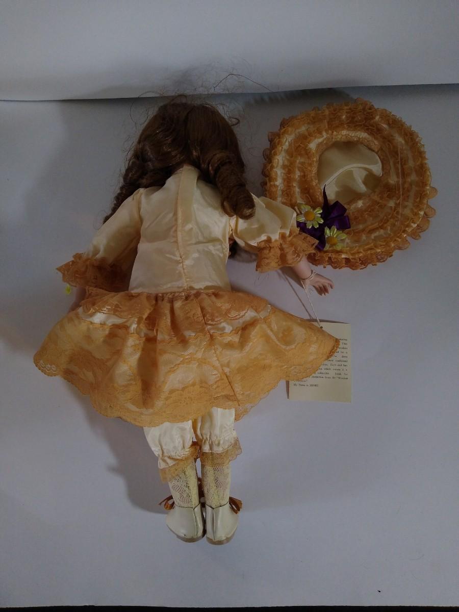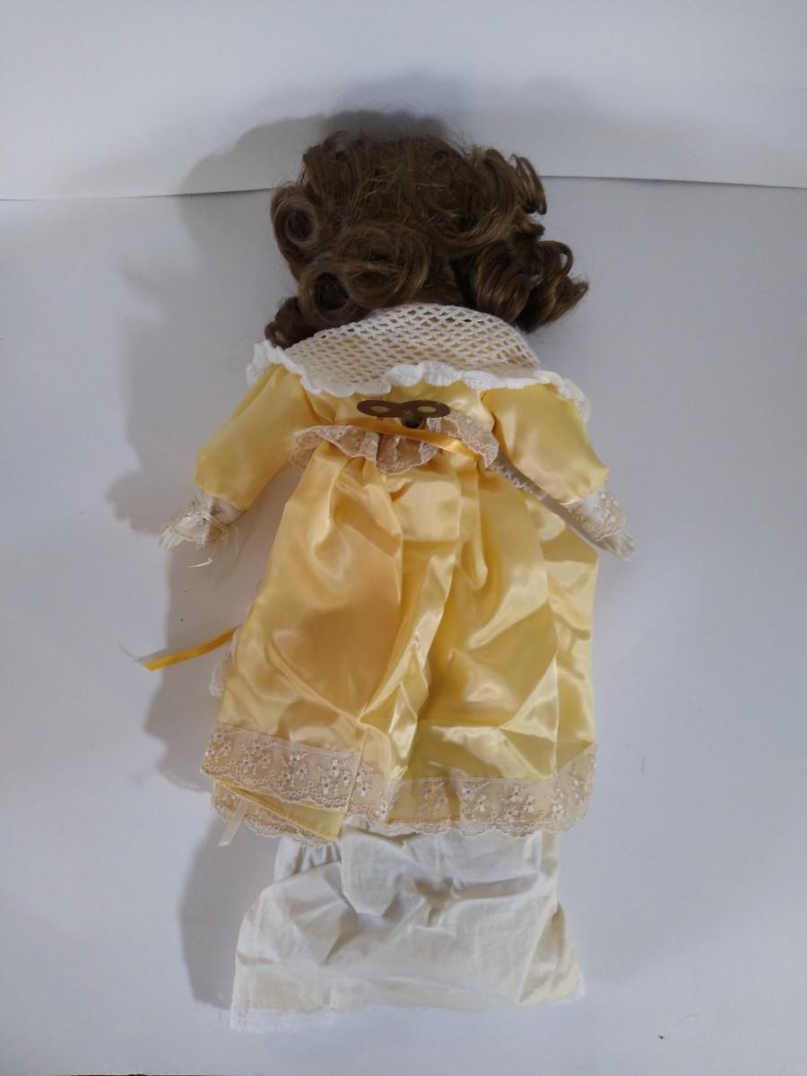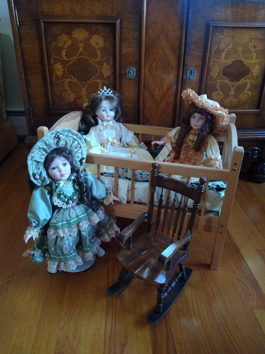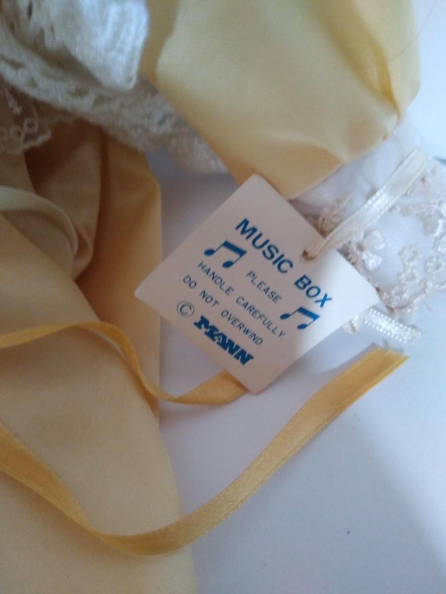 LOT 276L: Vintage Dolls- Seymour Mann Porcelain Music Box Doll, Pendleton Satin bedding inside doll crib and more