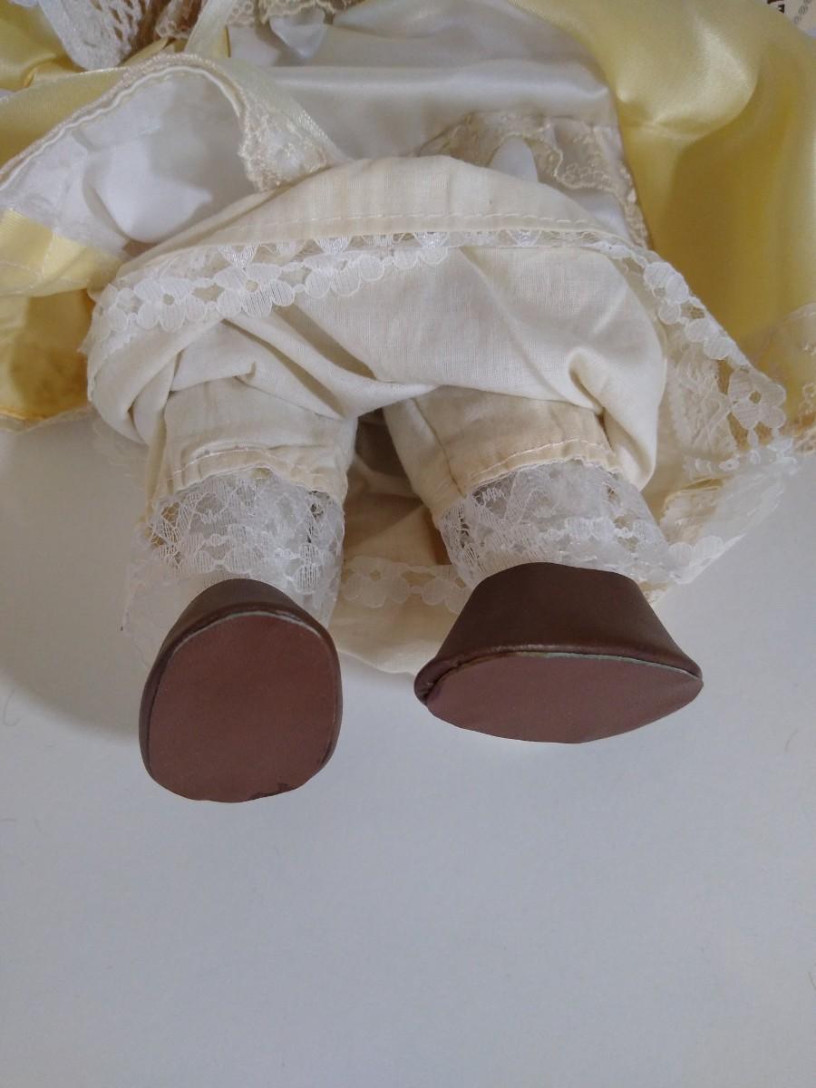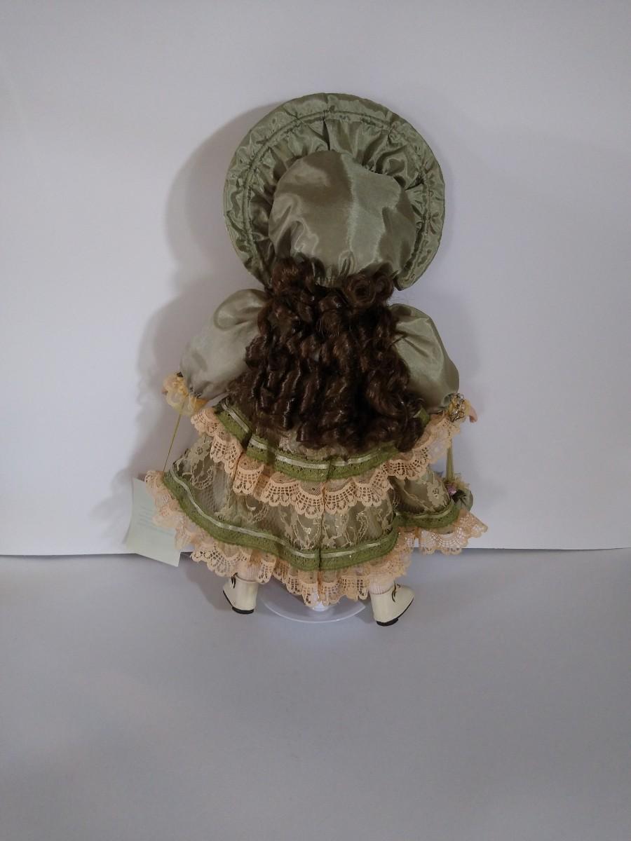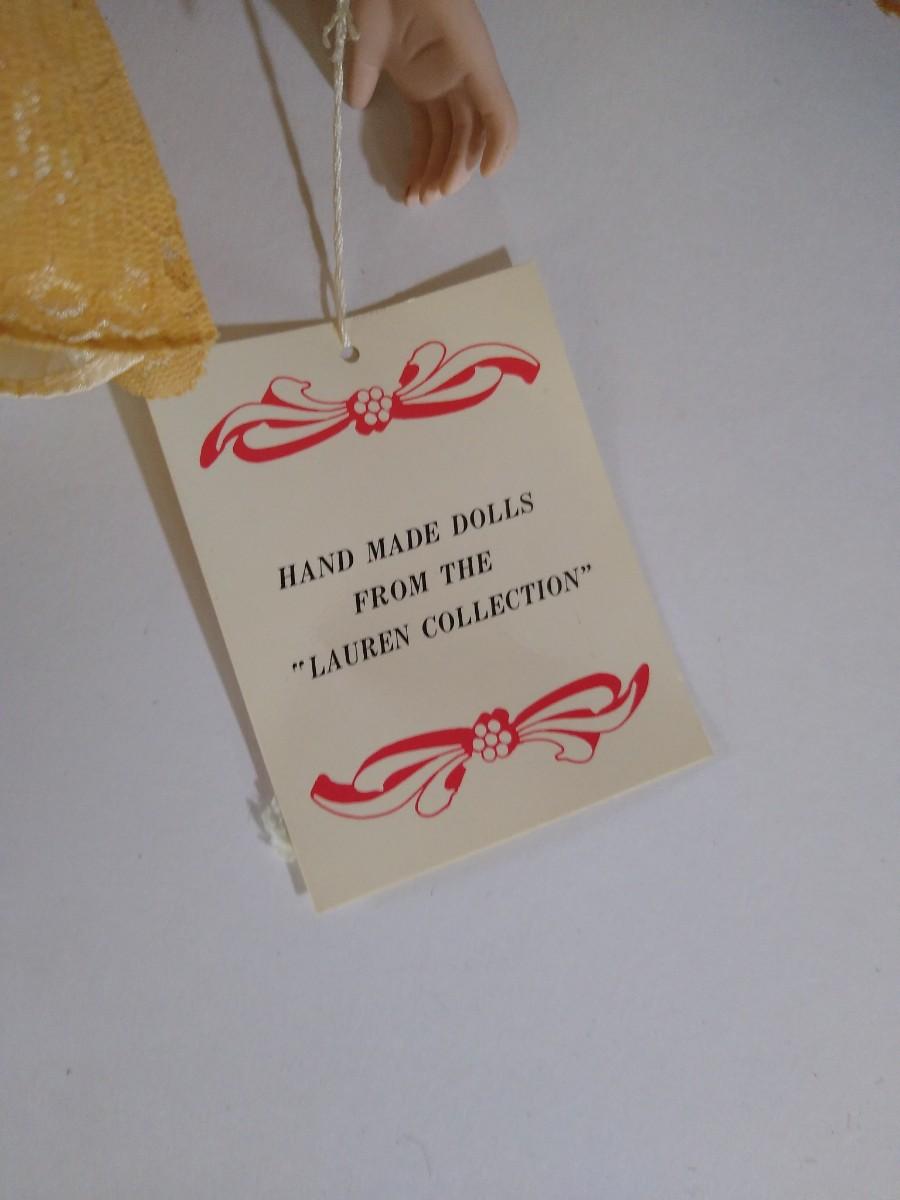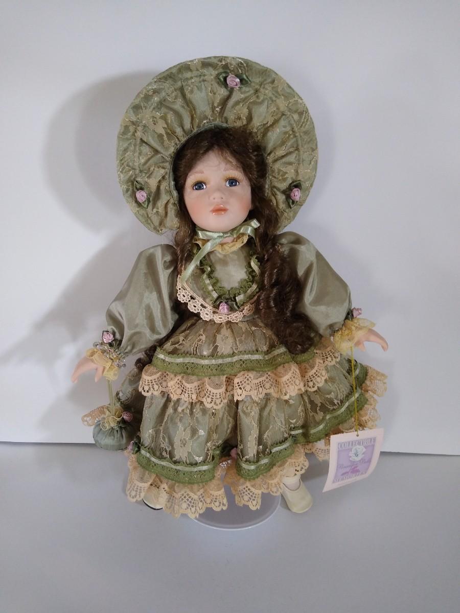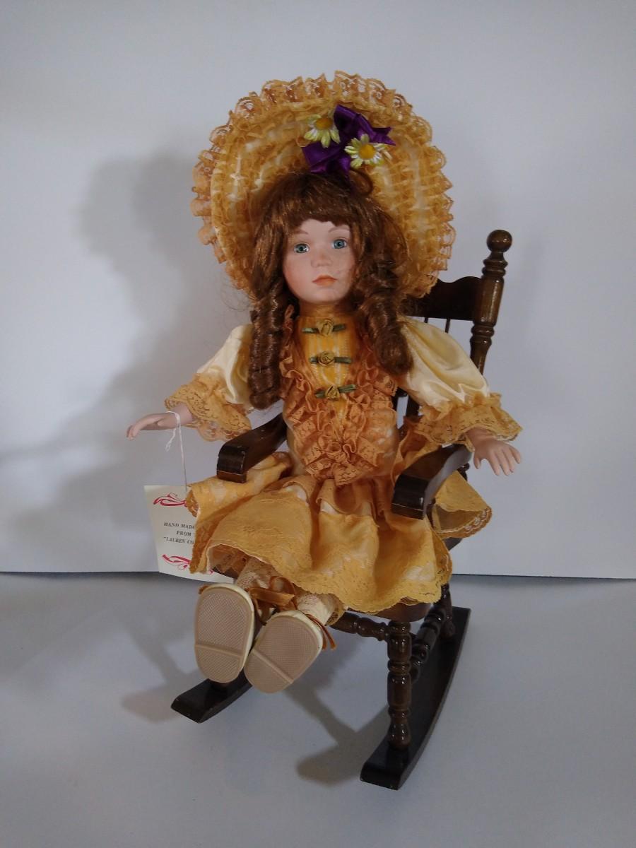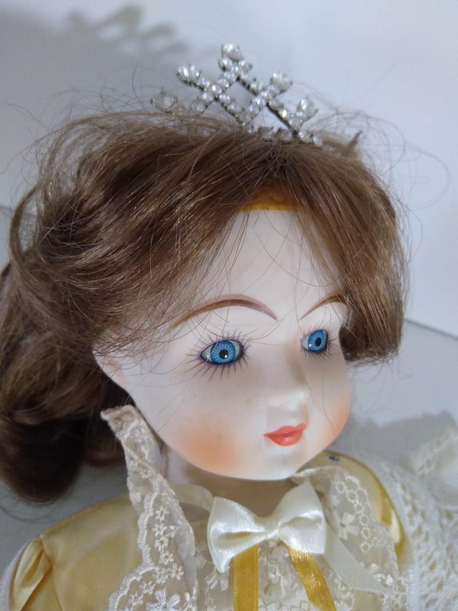 LOT 276L: Vintage Dolls- Seymour Mann Porcelain Music Box Doll, Pendleton Satin bedding inside doll crib and more