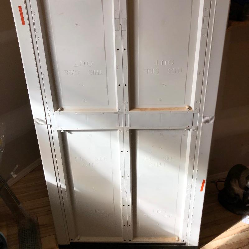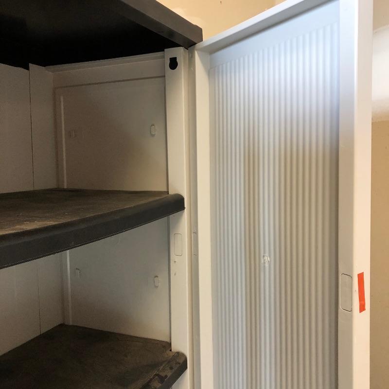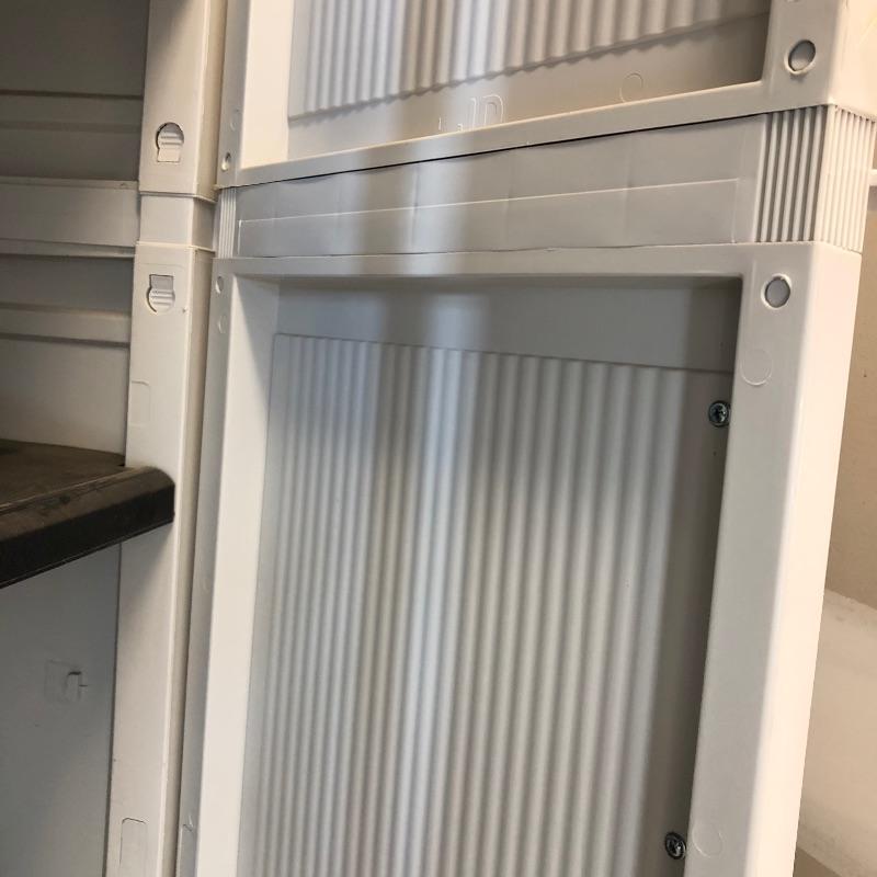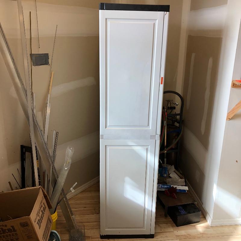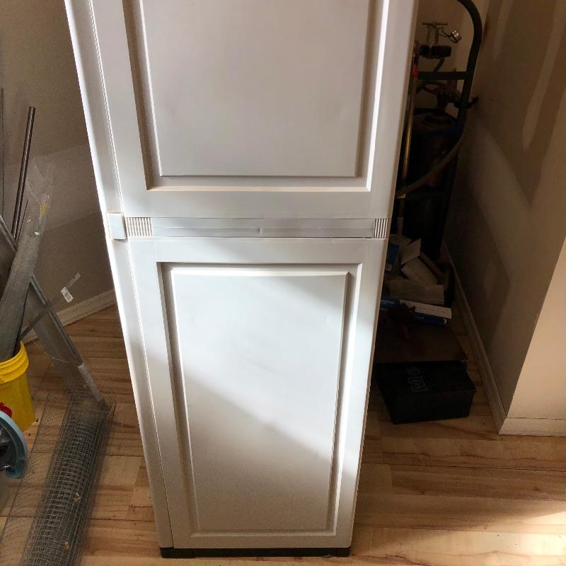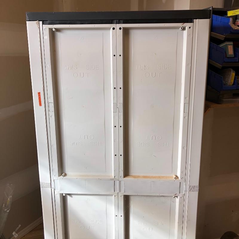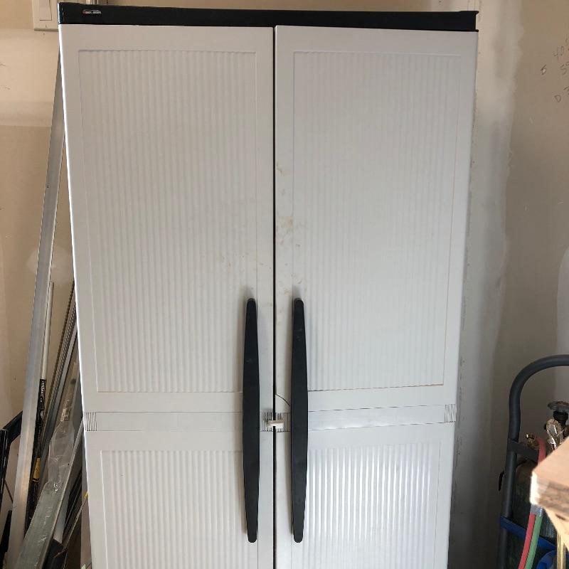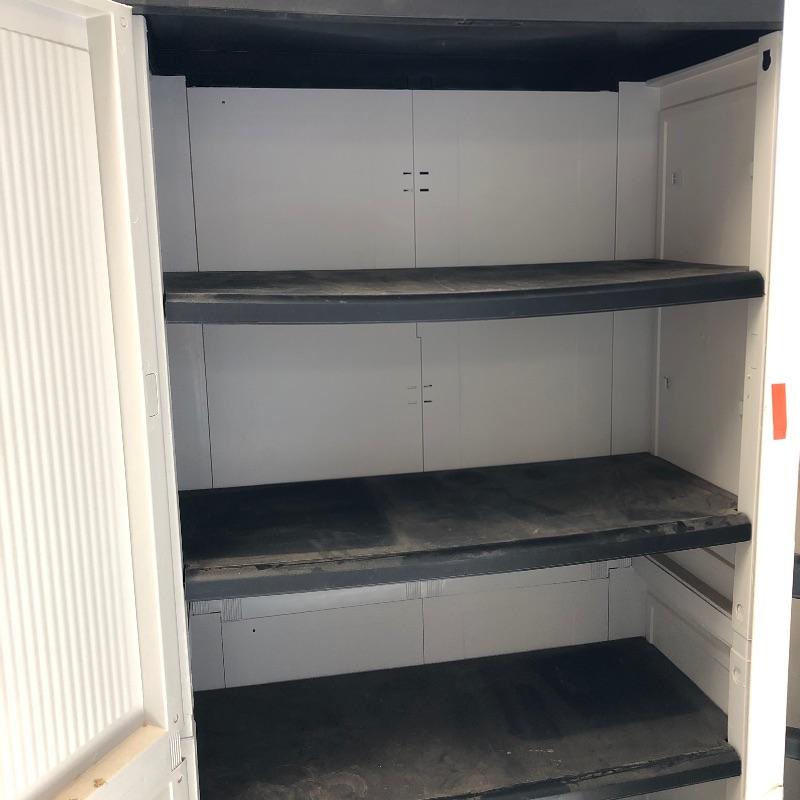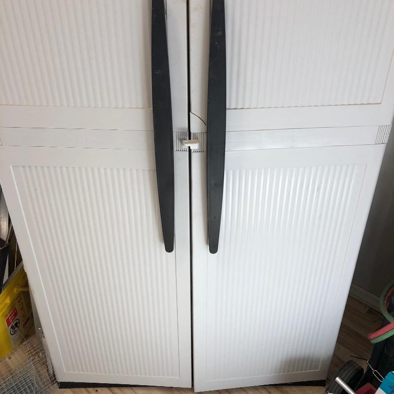 Nice hard plastic yet light and easy to move multi purpose 2 door storage cabinet with 4 adjustable shelves. Crack in right door above latch and left of handle see photos.