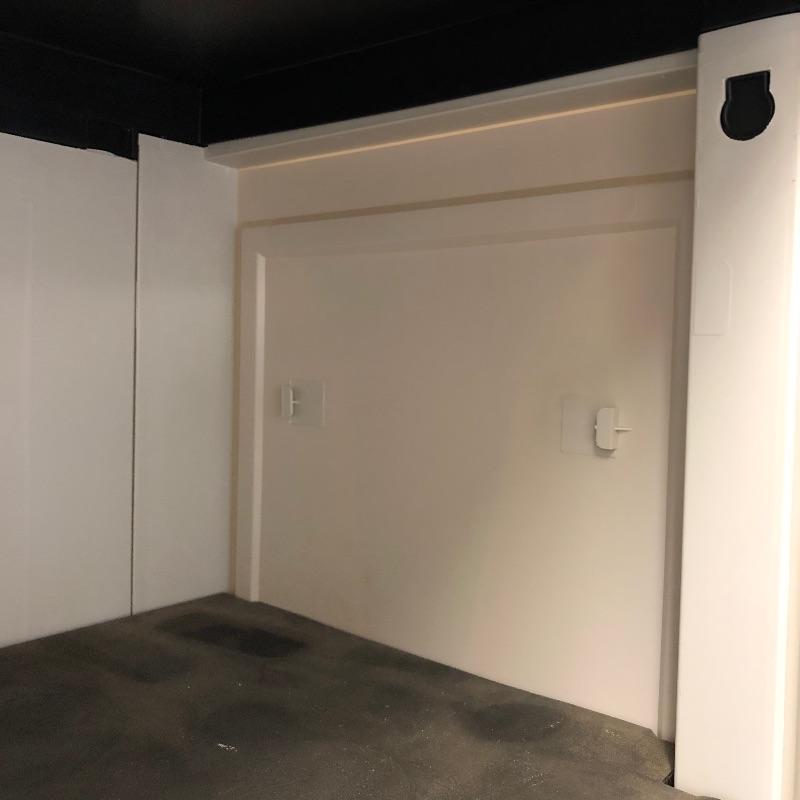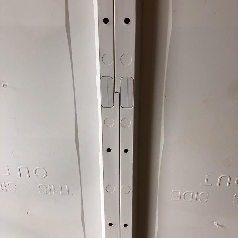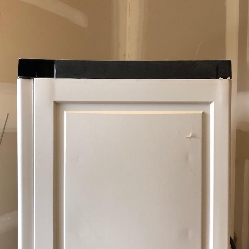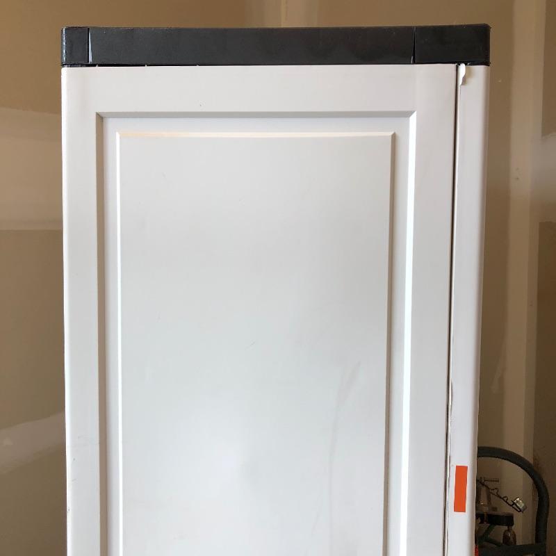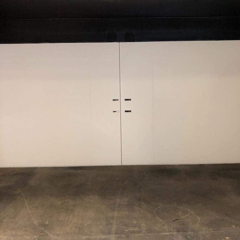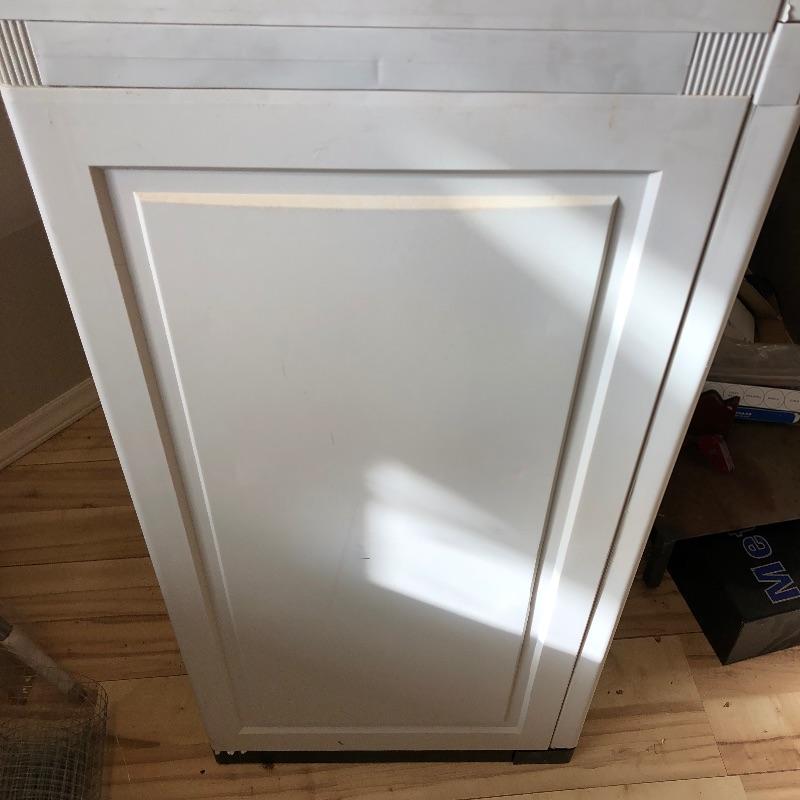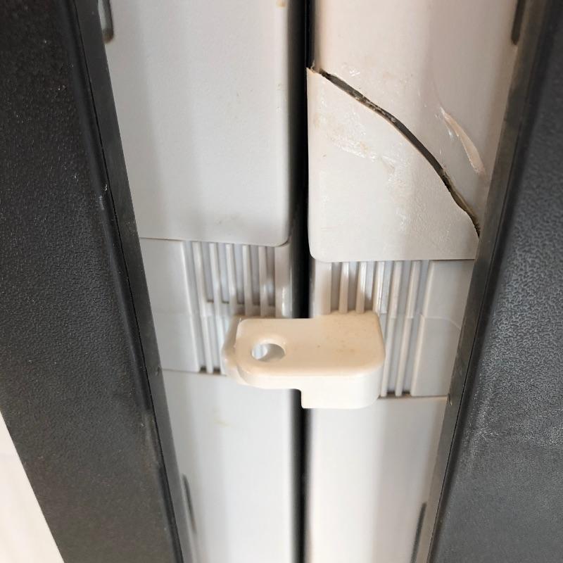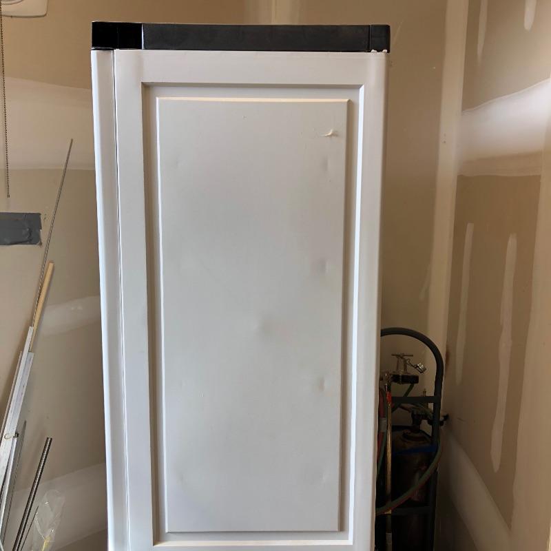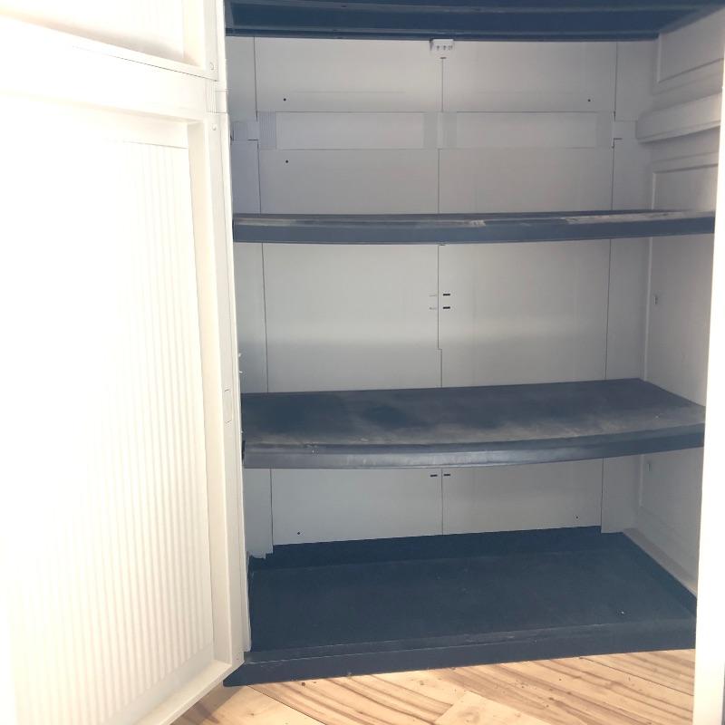 Nice hard plastic yet light and easy to move multi purpose 2 door storage cabinet with 4 adjustable shelves. Crack in right door above latch and left of handle see photos.
