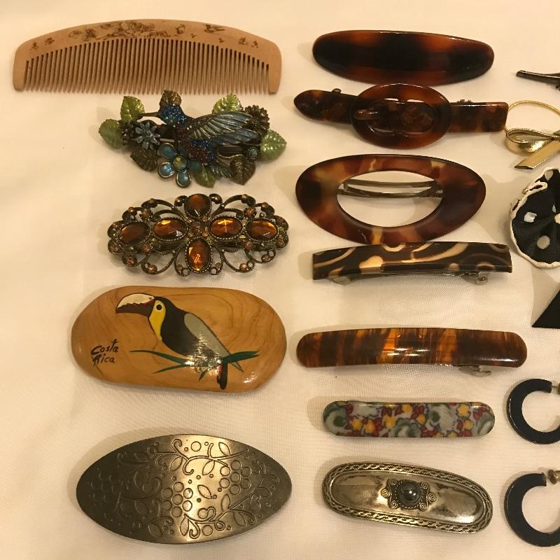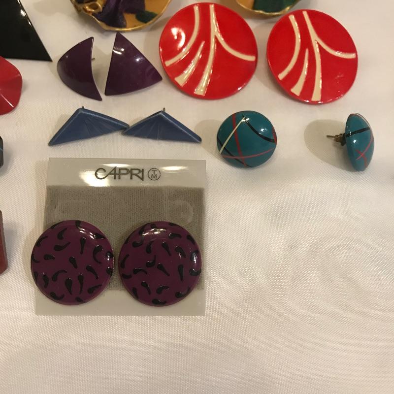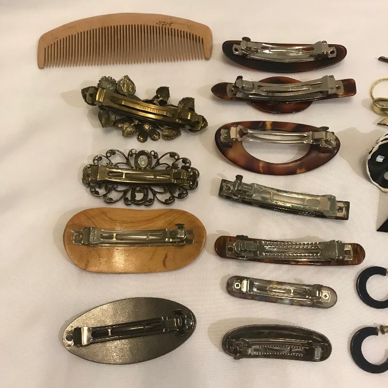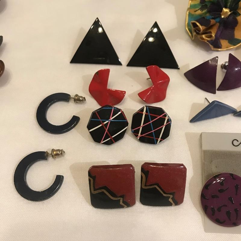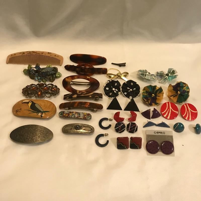 Fun and colorful lot to brighten your day! Ten bold earring pairs, one of which is still attached to packaging, all have fun geometric shapes and sweeping personality. The six funky pairs of earrings photographed on the top right appear to be a hand painted, lightweight, resin coated fabric. All earrings are for pierced ears, some are missing backs. Lot also includes a decorated wooden comb and a variety of clip barrettes including one that appears to have a muddled 925 marking. See photos.