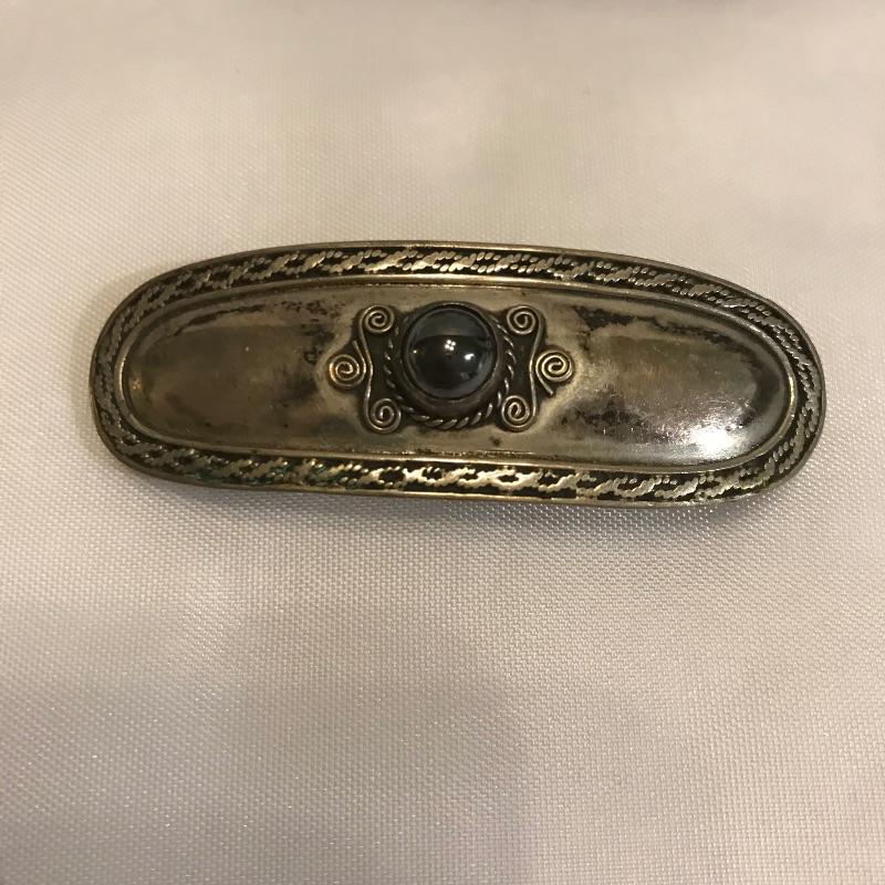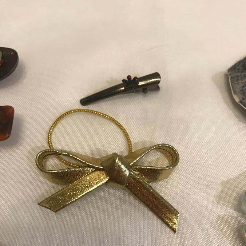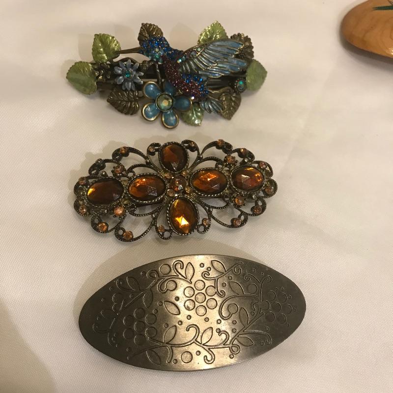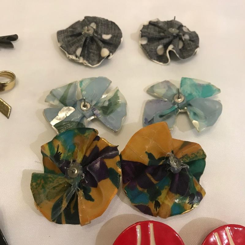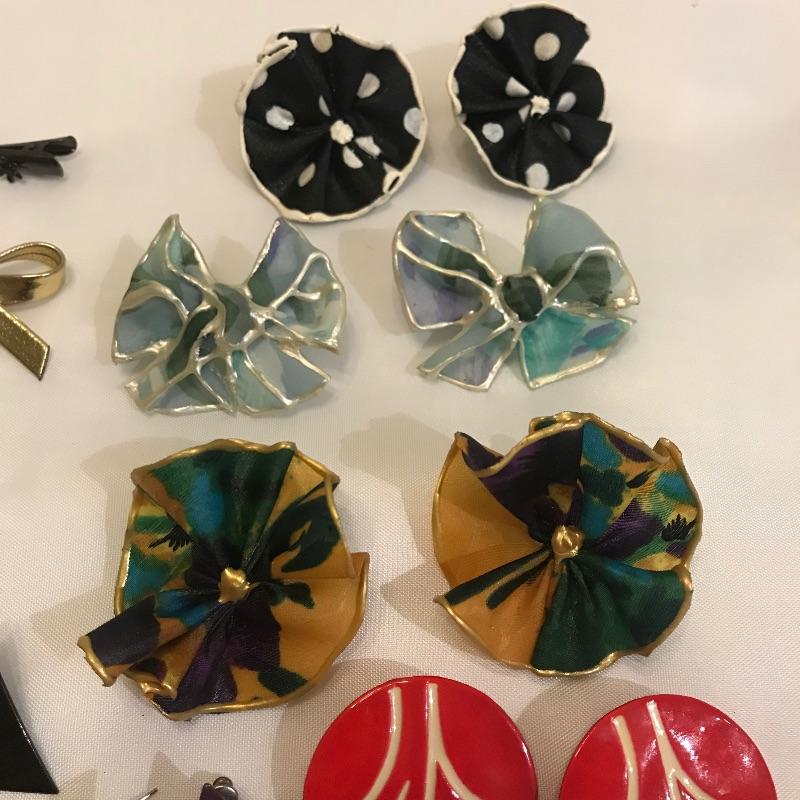 Fun and colorful lot to brighten your day! Ten bold earring pairs, one of which is still attached to packaging, all have fun geometric shapes and sweeping personality. The six funky pairs of earrings photographed on the top right appear to be a hand painted, lightweight, resin coated fabric. All earrings are for pierced ears, some are missing backs. Lot also includes a decorated wooden comb and a variety of clip barrettes including one that appears to have a muddled 925 marking. See photos.