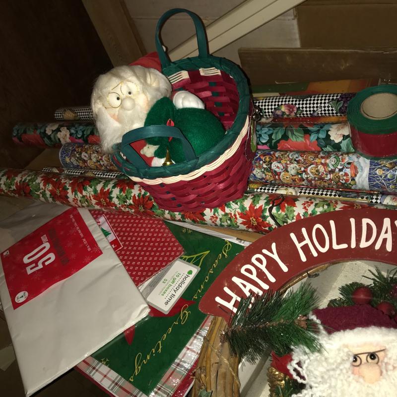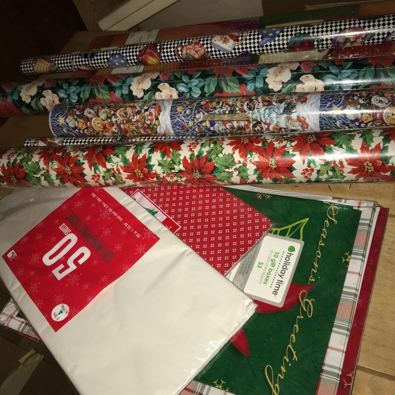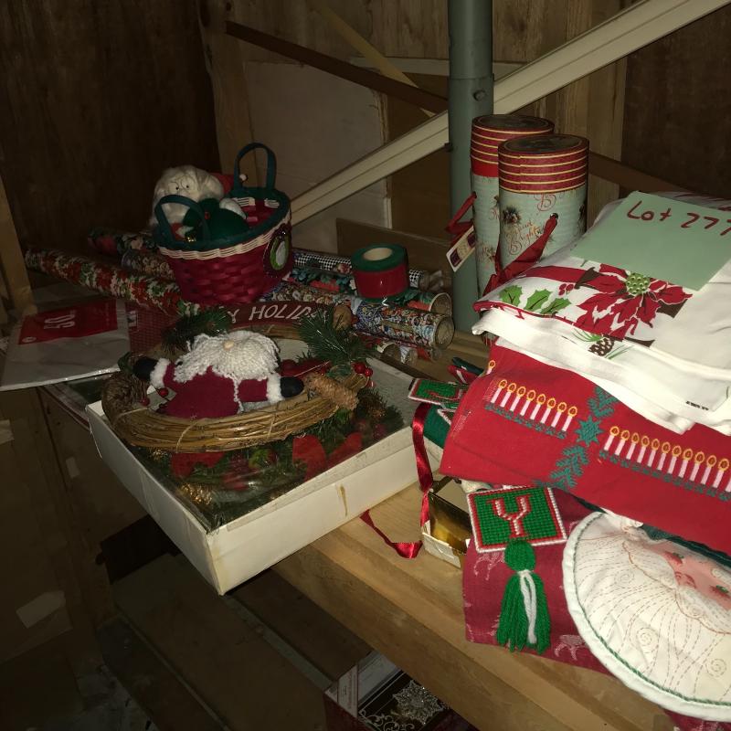 Big lot of linens, wrappings and cards! Linens include reindeer hand towels, hot pads, stockings, sheets and more! Gift boxes and wrapping along with a couple of wreaths. Local pickup only.
