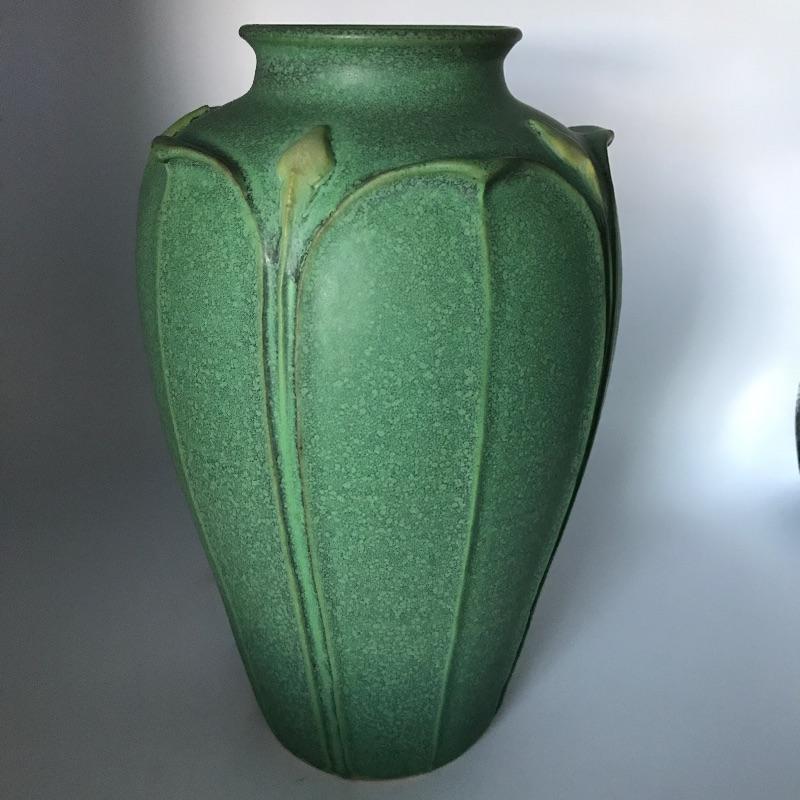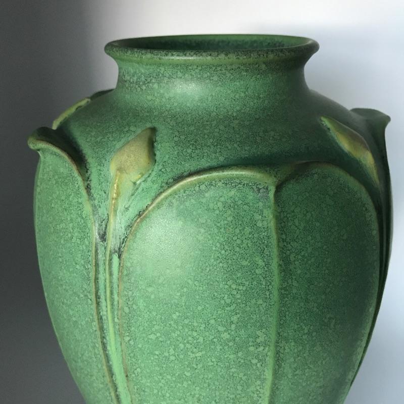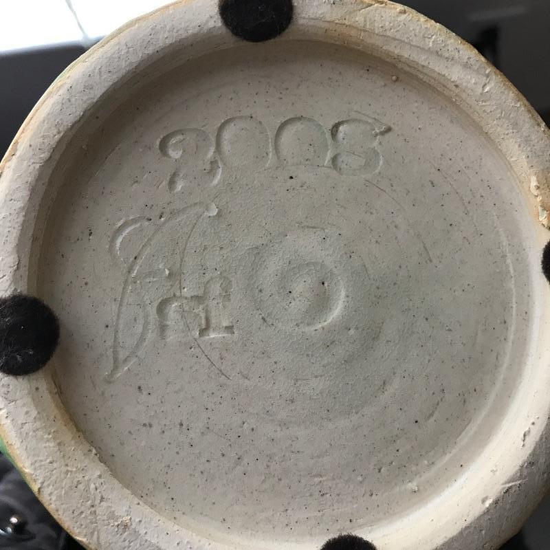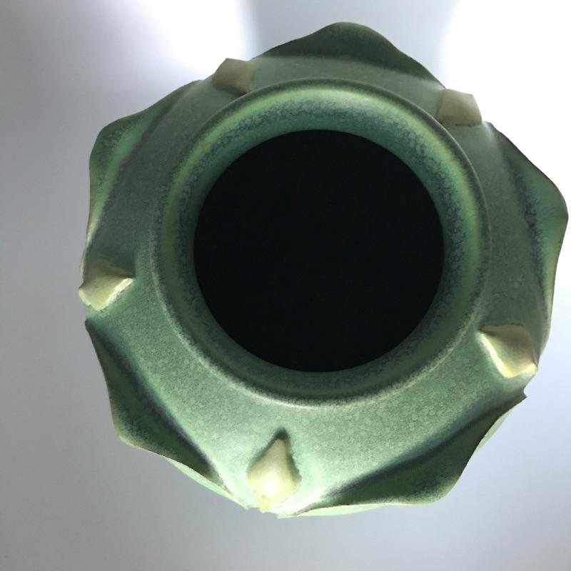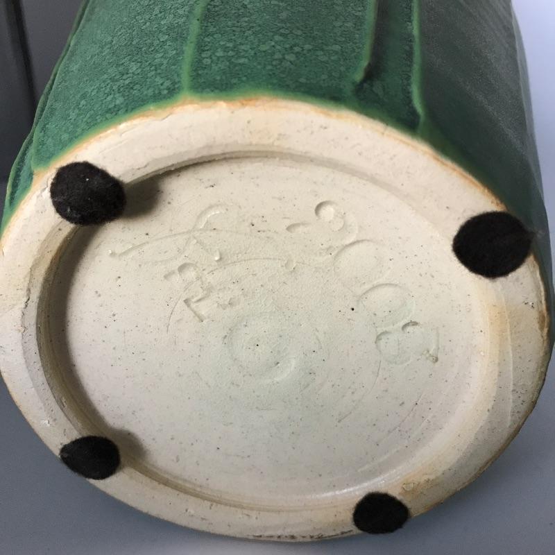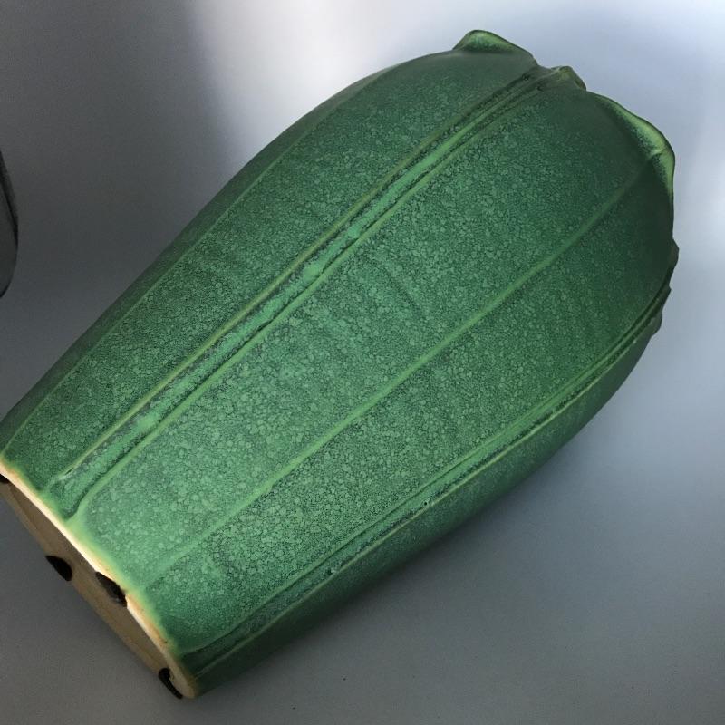 Nice large piece by Art Accari Arts &Clay Company. This contemporary piece has a nice matte green color with floral detail. Stamped by maker on bottom 2008. Measures 8”d x 12.5”tall