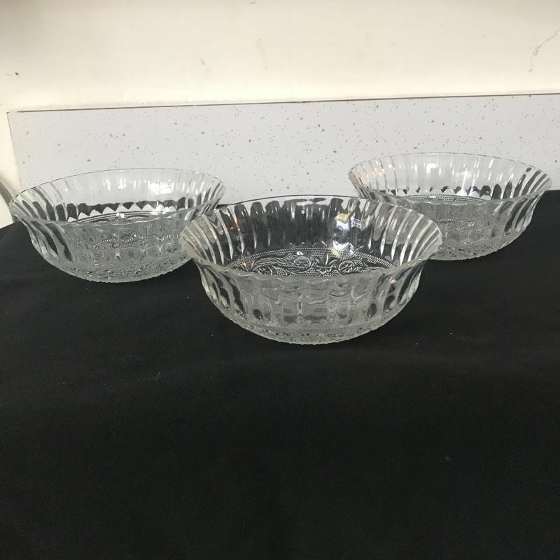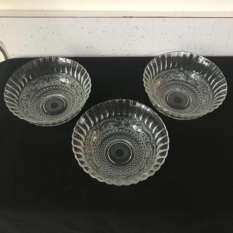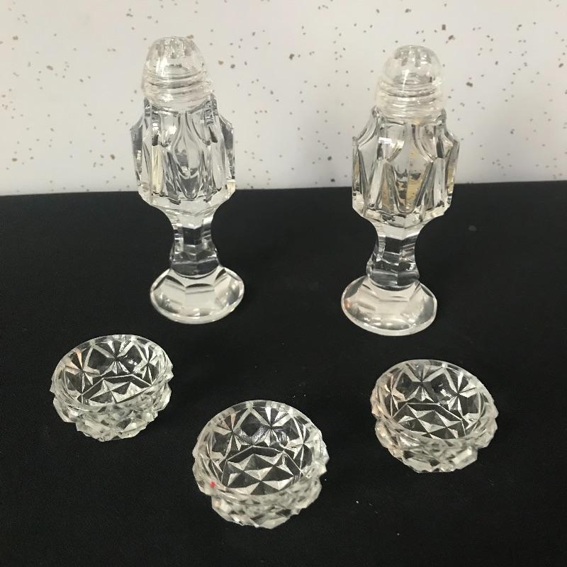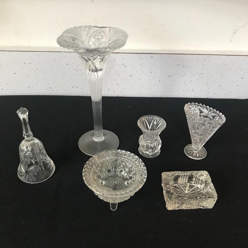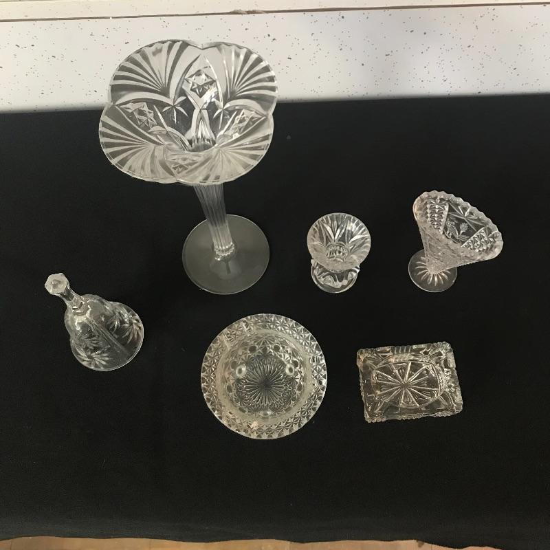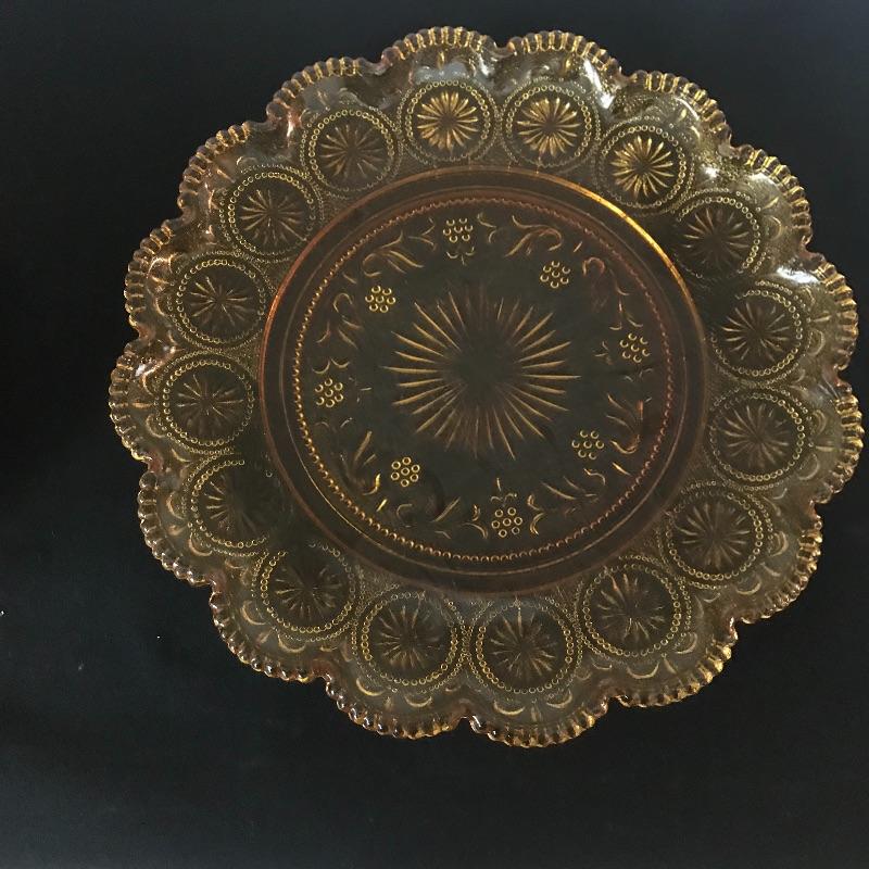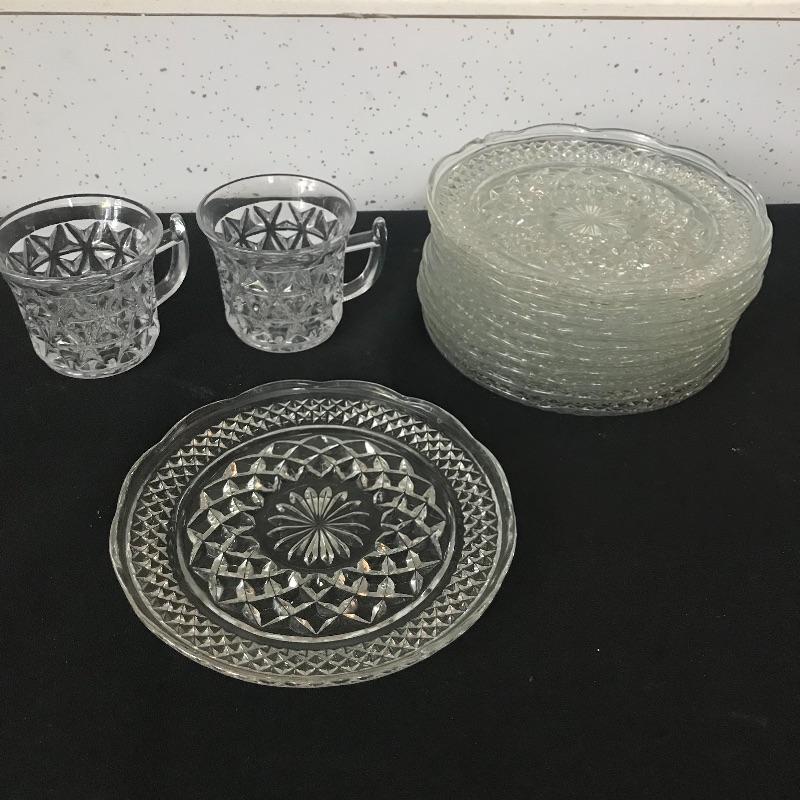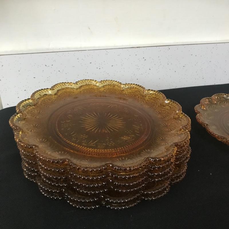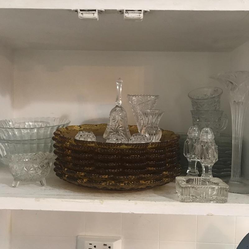 Seven golden glass luncheon plates, eleven clear desert plates, two glass tea cups, three glass vegetable bowls, several vases, ash trays and salt and pepper service pieces. Local pick up only.