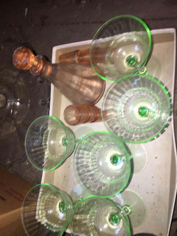 6 green glasses, 6 pink shot glasses w/small decanter & other glassware