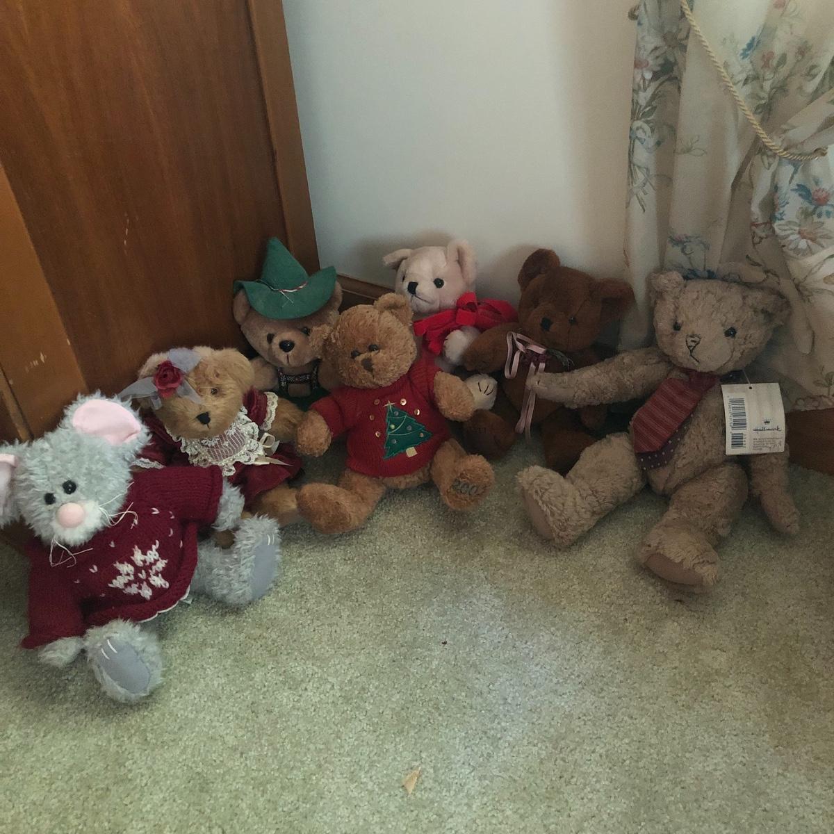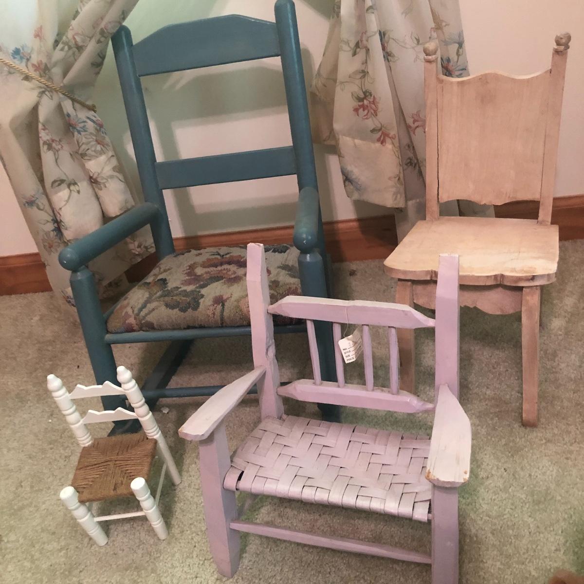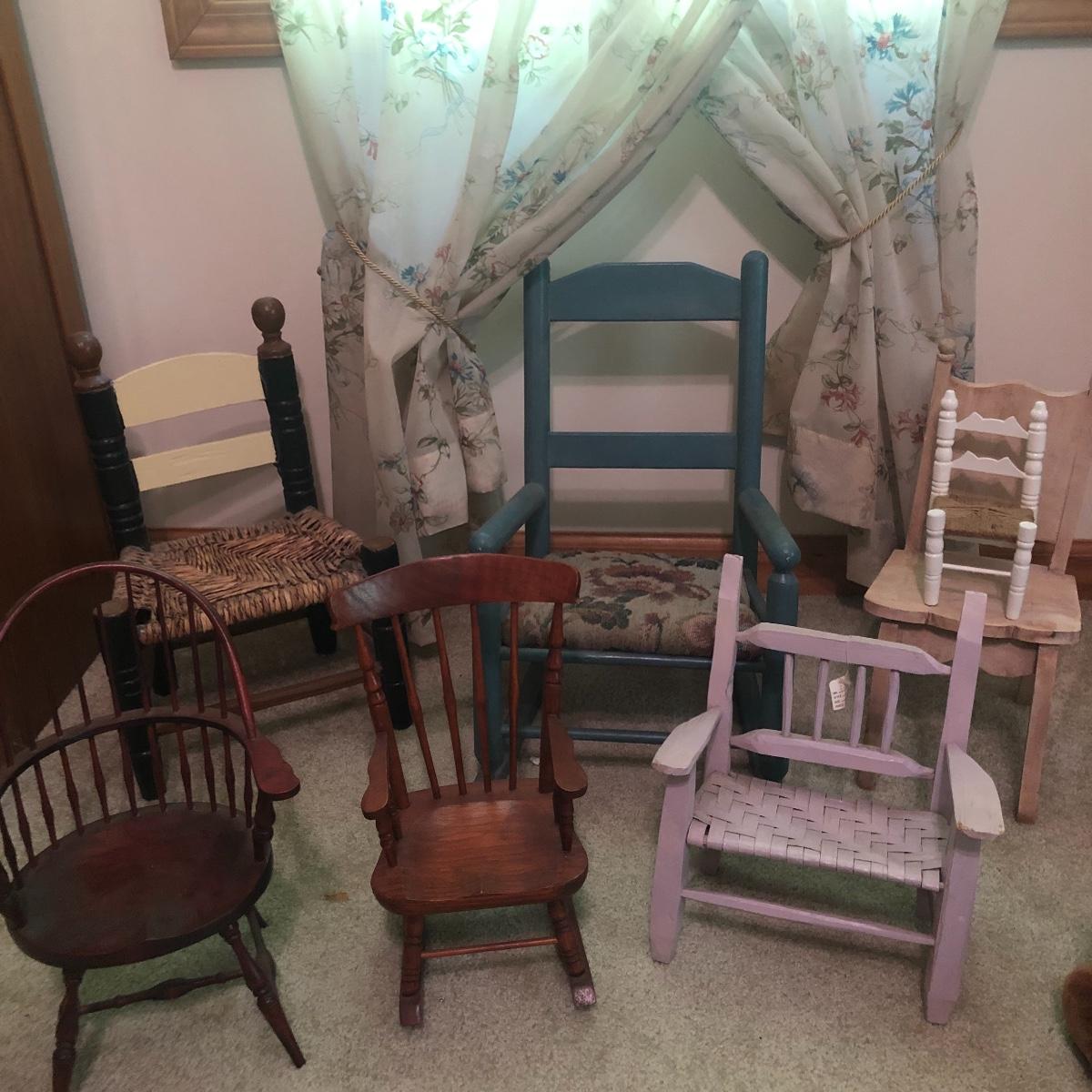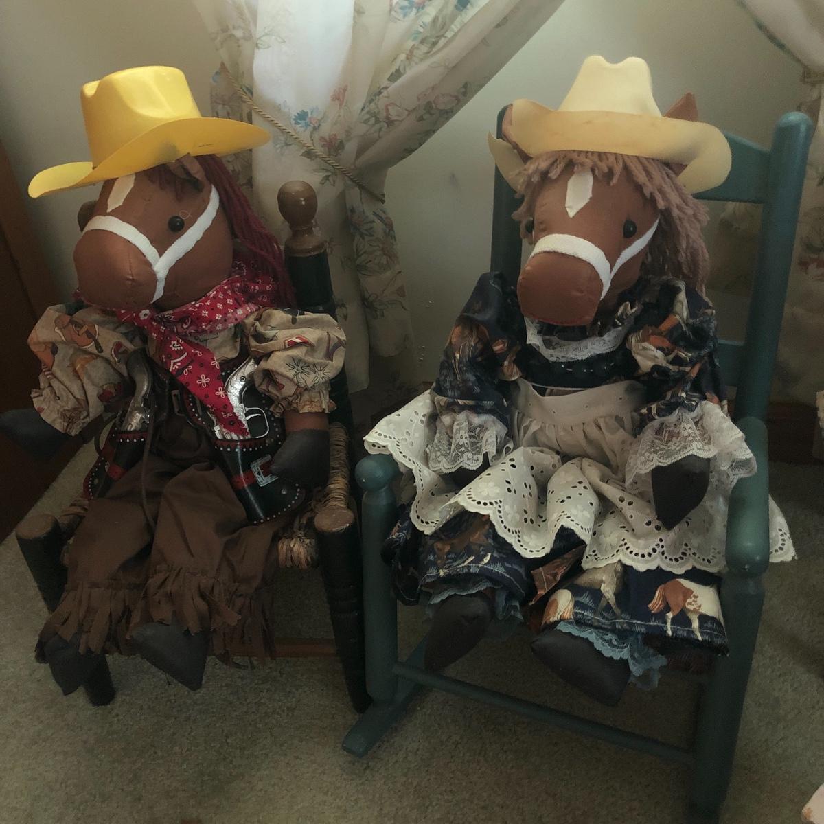 This lot includes seven wood chairs, two handmade horse dolls, two embroidered pillows, two books on teddy bears and eighteen teddy bears. The unique horse dolls are approximately 25” tall; note the metal guns in the male horse’s holster! Local pick up only.