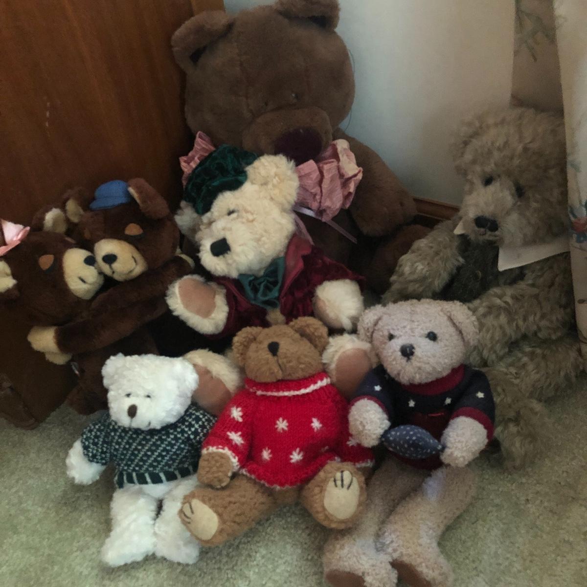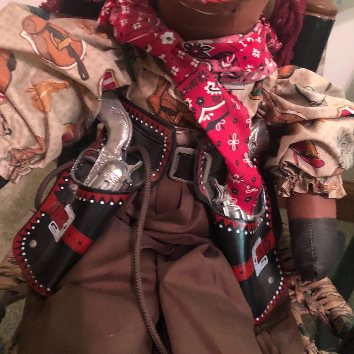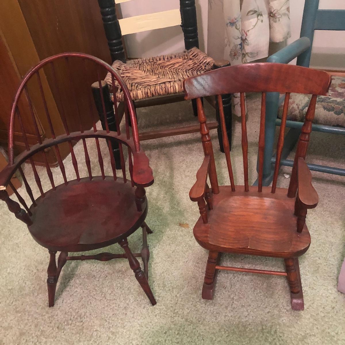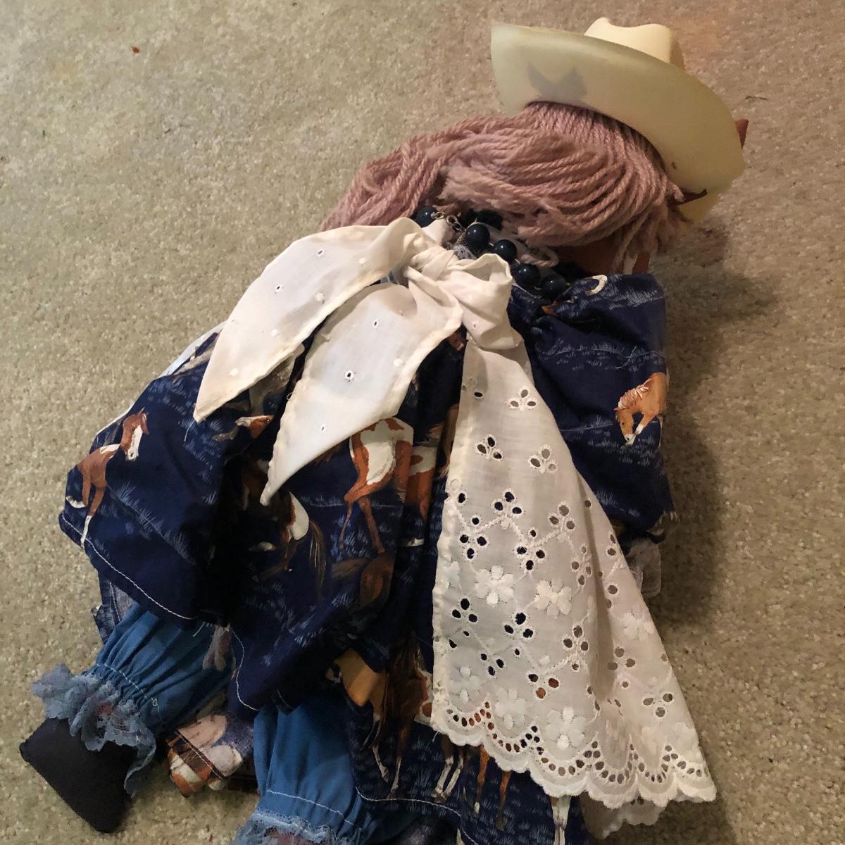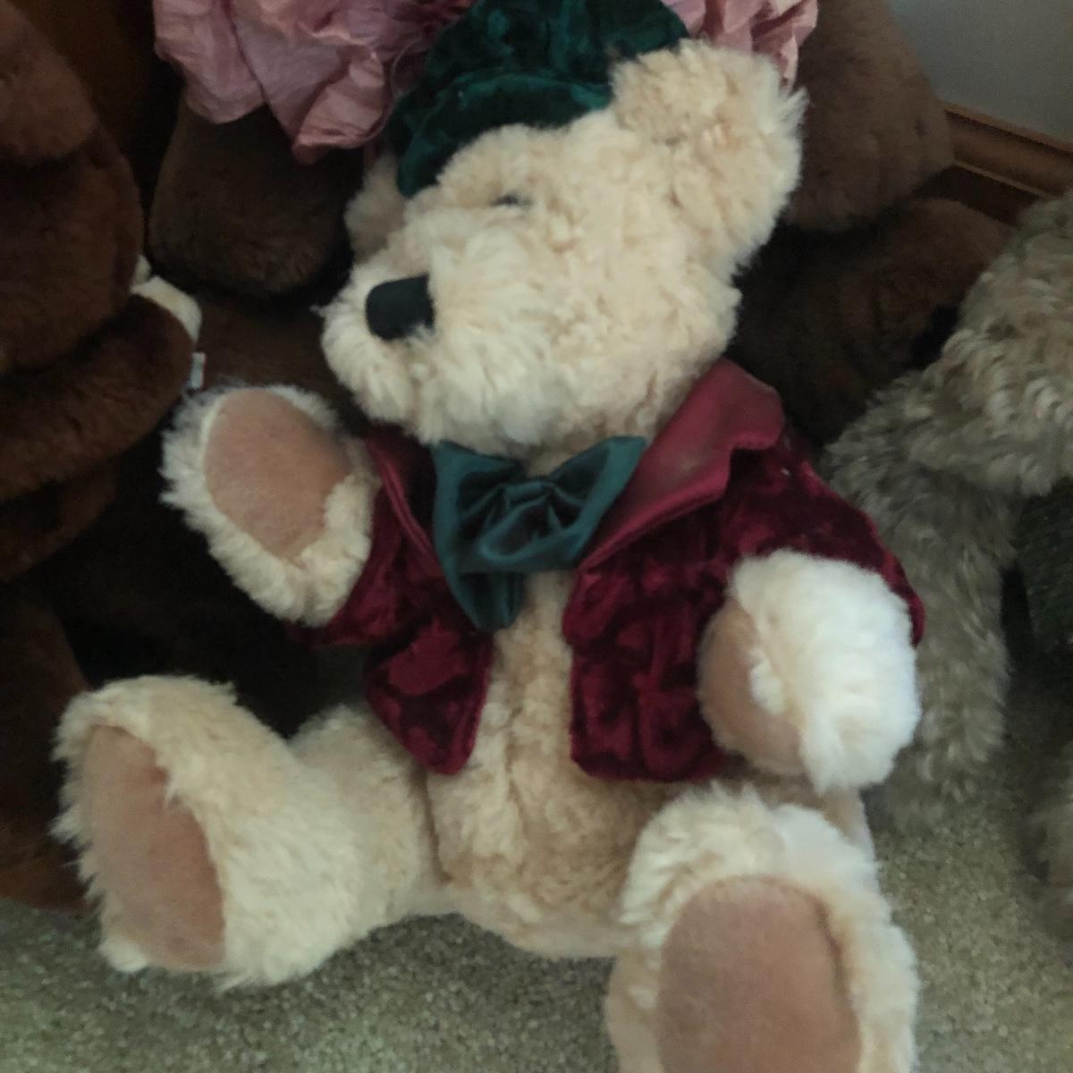 This lot includes seven wood chairs, two handmade horse dolls, two embroidered pillows, two books on teddy bears and eighteen teddy bears. The unique horse dolls are approximately 25” tall; note the metal guns in the male horse’s holster! Local pick up only.