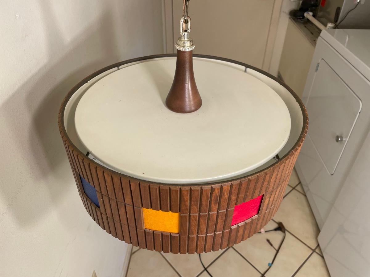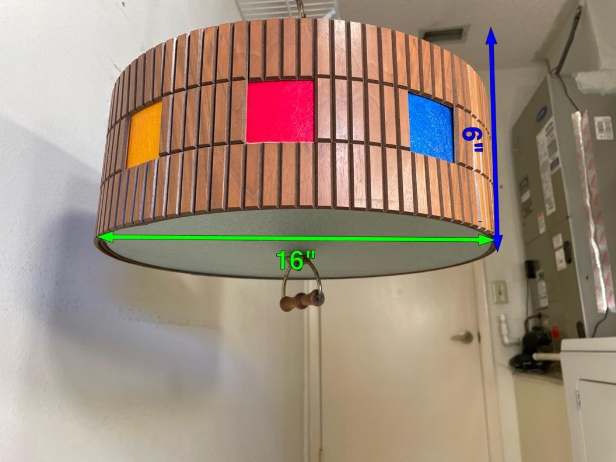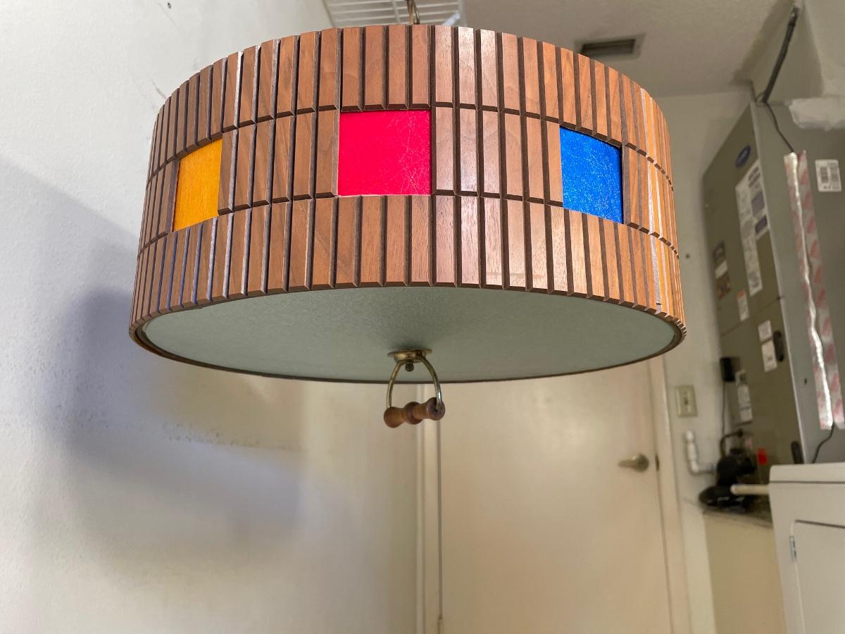 Wood and colored plastic with textured glass panels on the top and bottom. Made to be hard-wired.
