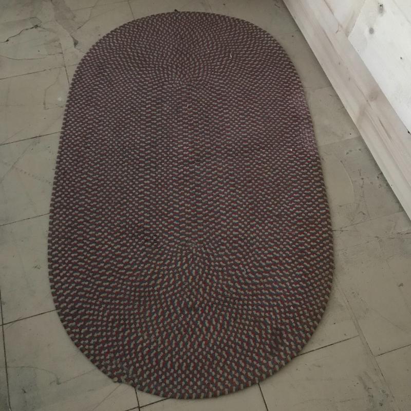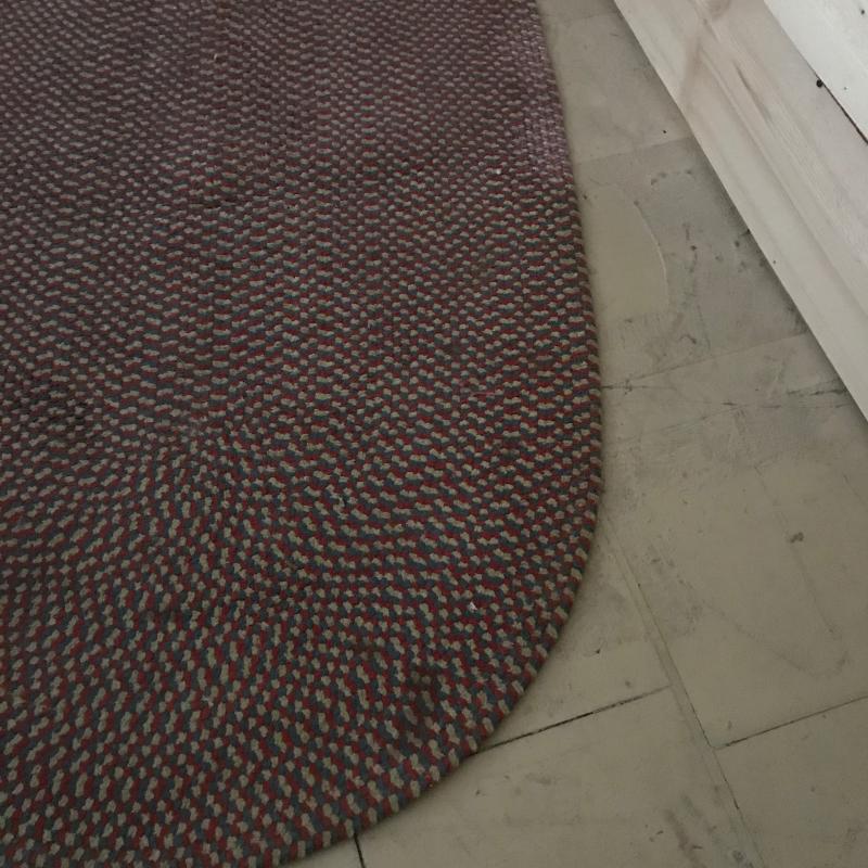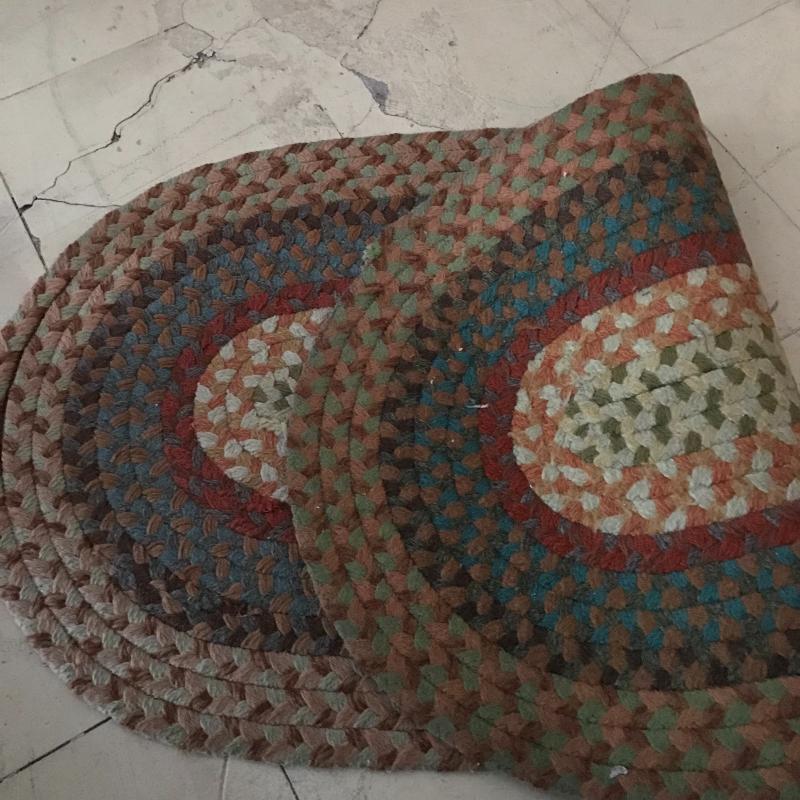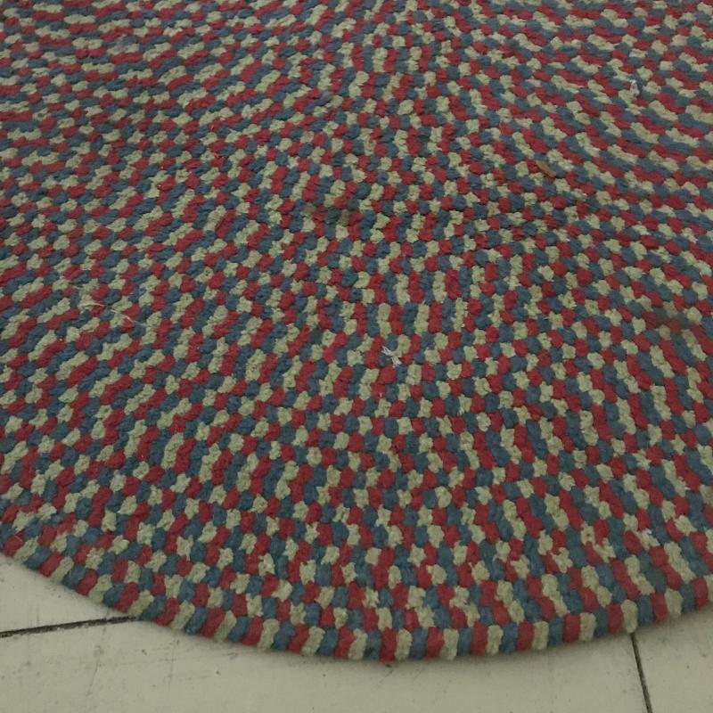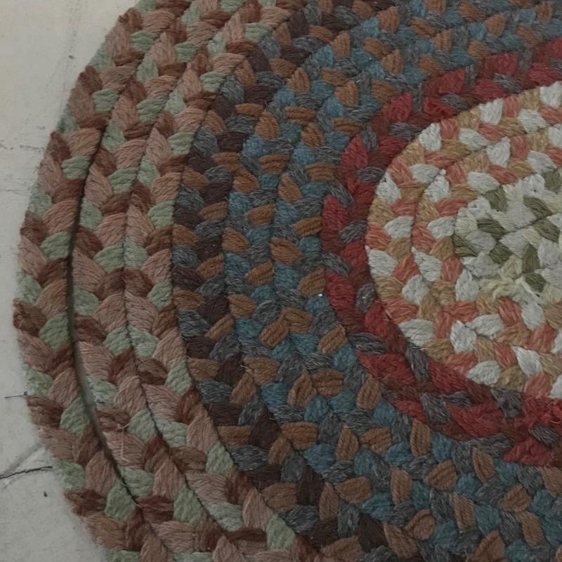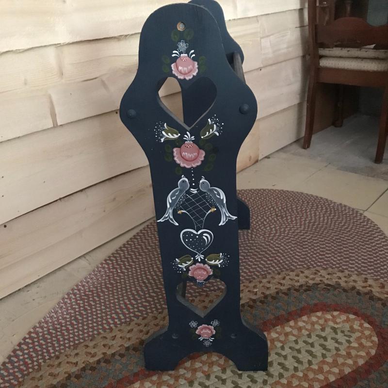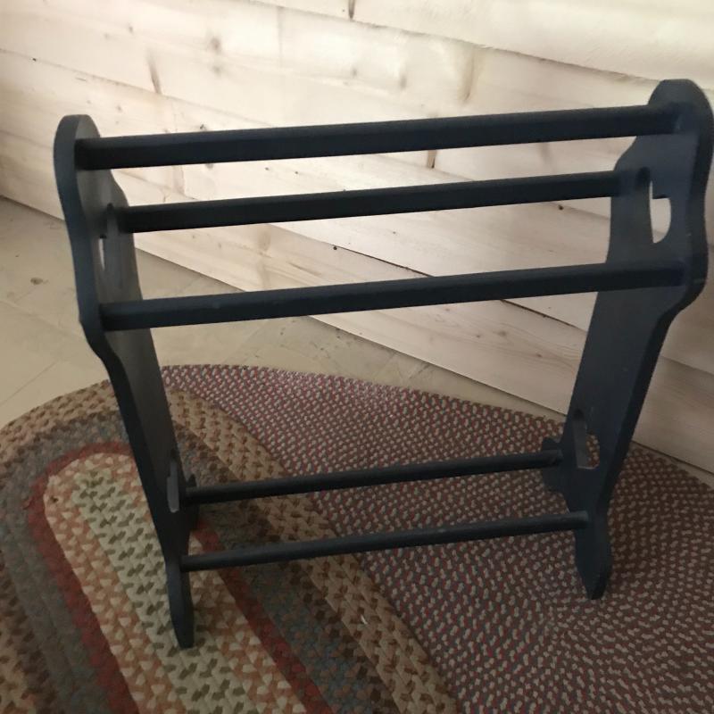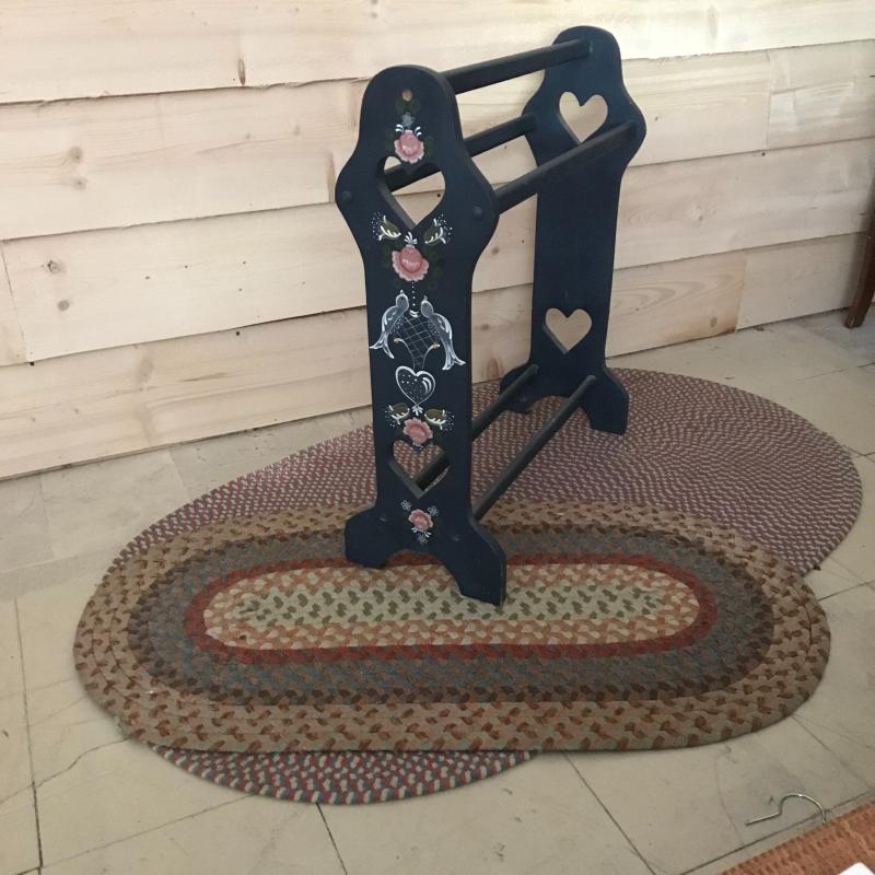 Wooden blue painted quilt rack with floral details pained on each end. Piece measures 25.5” x 11” x 29.5” Lot also includes two braided rugs, smaller one has one spot of separation and measures 44” x 22.5” with green, red and orange colors. Larger one measures 57” x 33.5” and is red, blue and cream colored. Both need cleaning. Lot is available for local pick up in Maggie Valley, NC only.