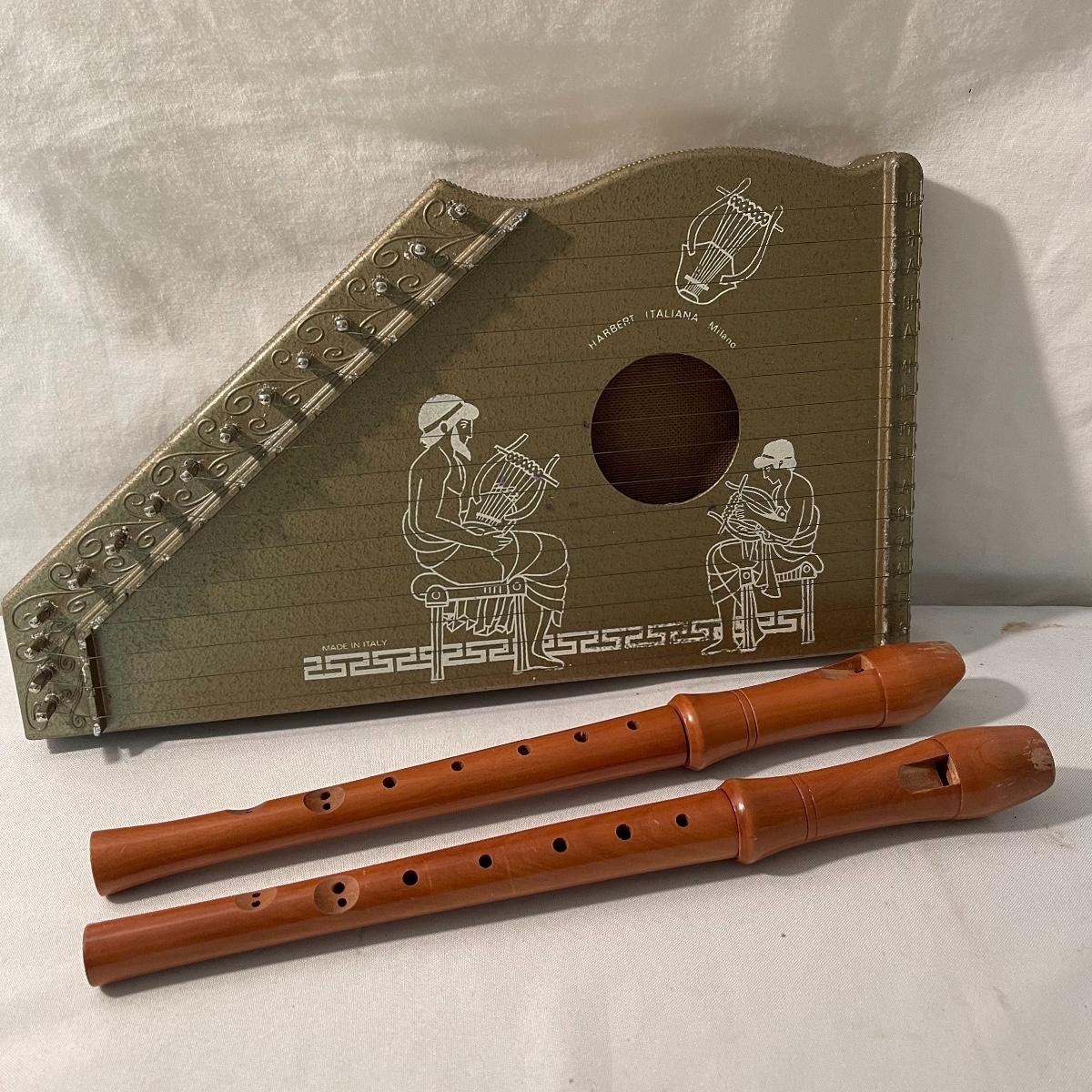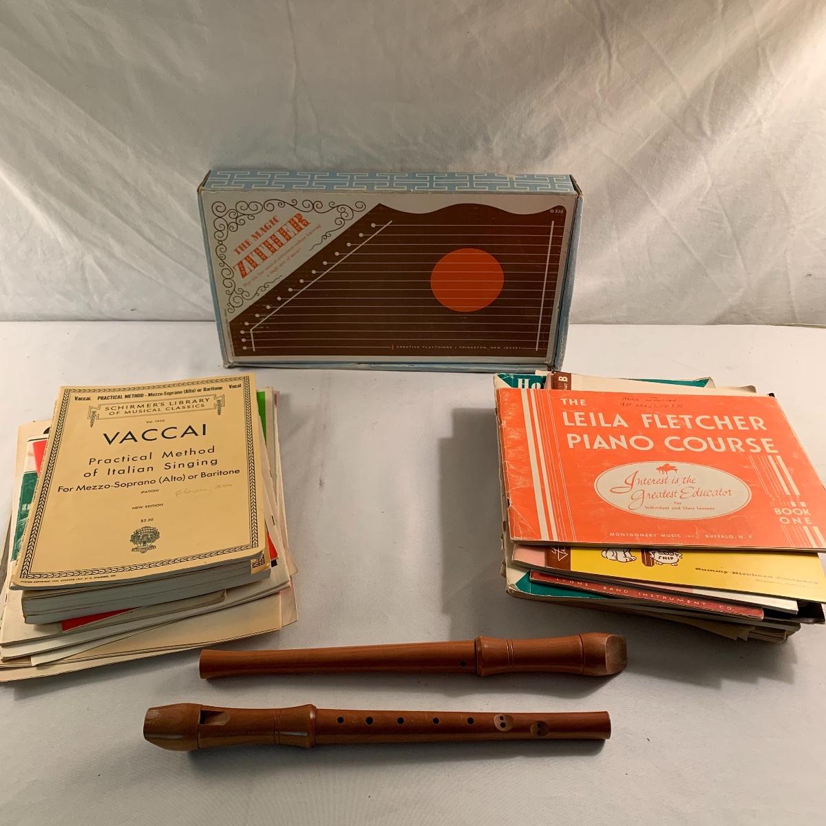 Have a child/grandchild who needs a recorder for school? If so there are not one but two in this lot and you can tap into your inner musician self with this zither that comes with box; What’s a Zither you ask? It’s a small stringed instrument that is shaped like an auto harp and originates in Italy. It is 14 inches long. Also Included are several beginner piano books, sheet music, how to books.