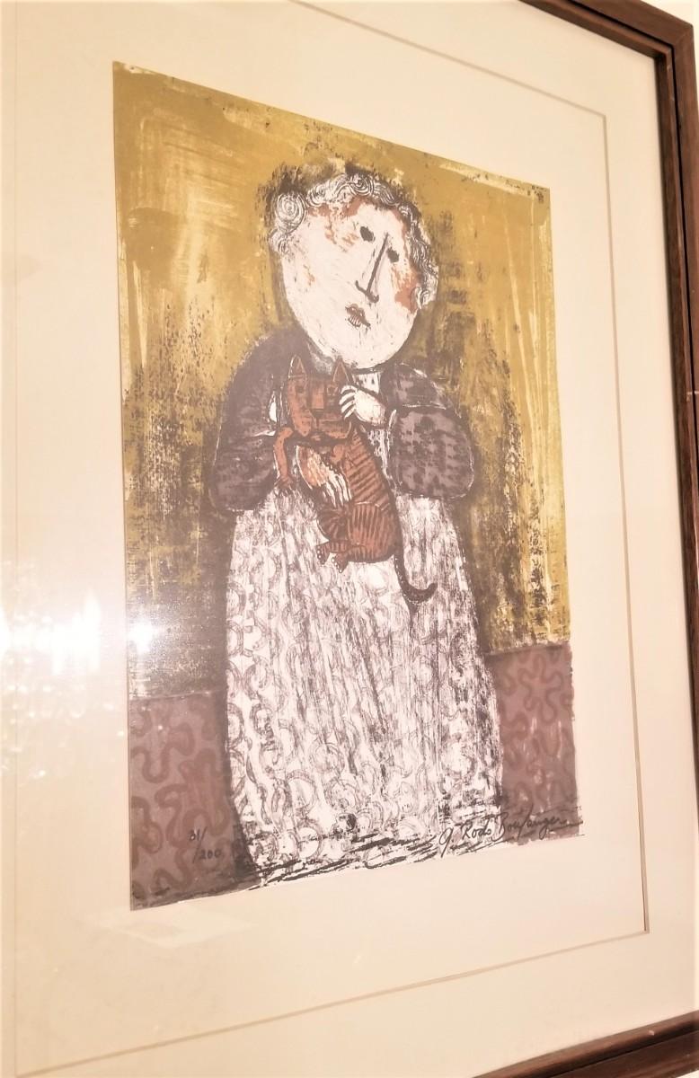 Great framed, signed and numbered (81/250) lithograph by listed artist Graciela Rodo Boulanger "Woman with Cat". Purchased from Park West Galleries with all paperwork on reverse. Measures 17.5" x 21.5". Done in 1973. The artist is a contemporary Bolivian painter known for her depictions of children and modernistic style. If you do a quick internet check, you can find many SOLD examples of her work. Good condition.