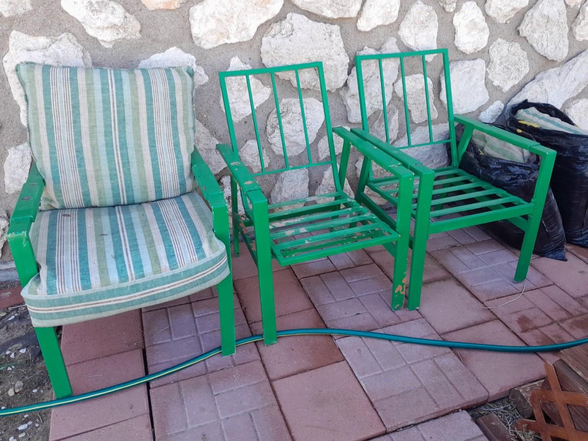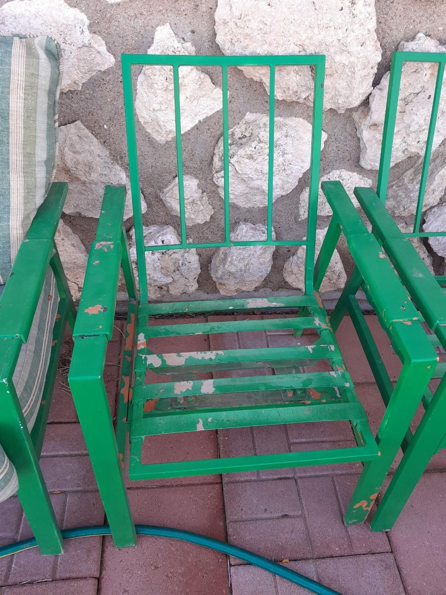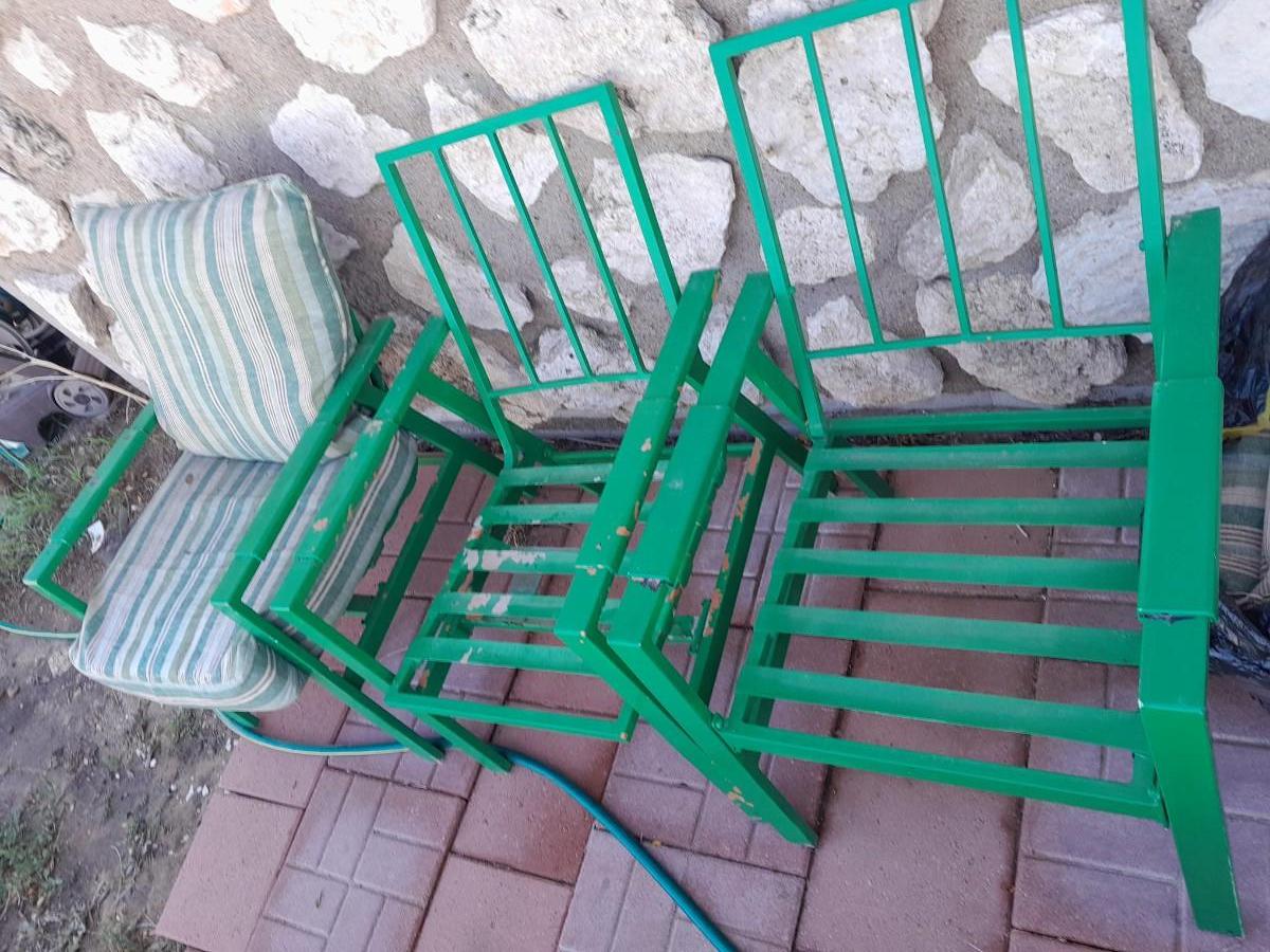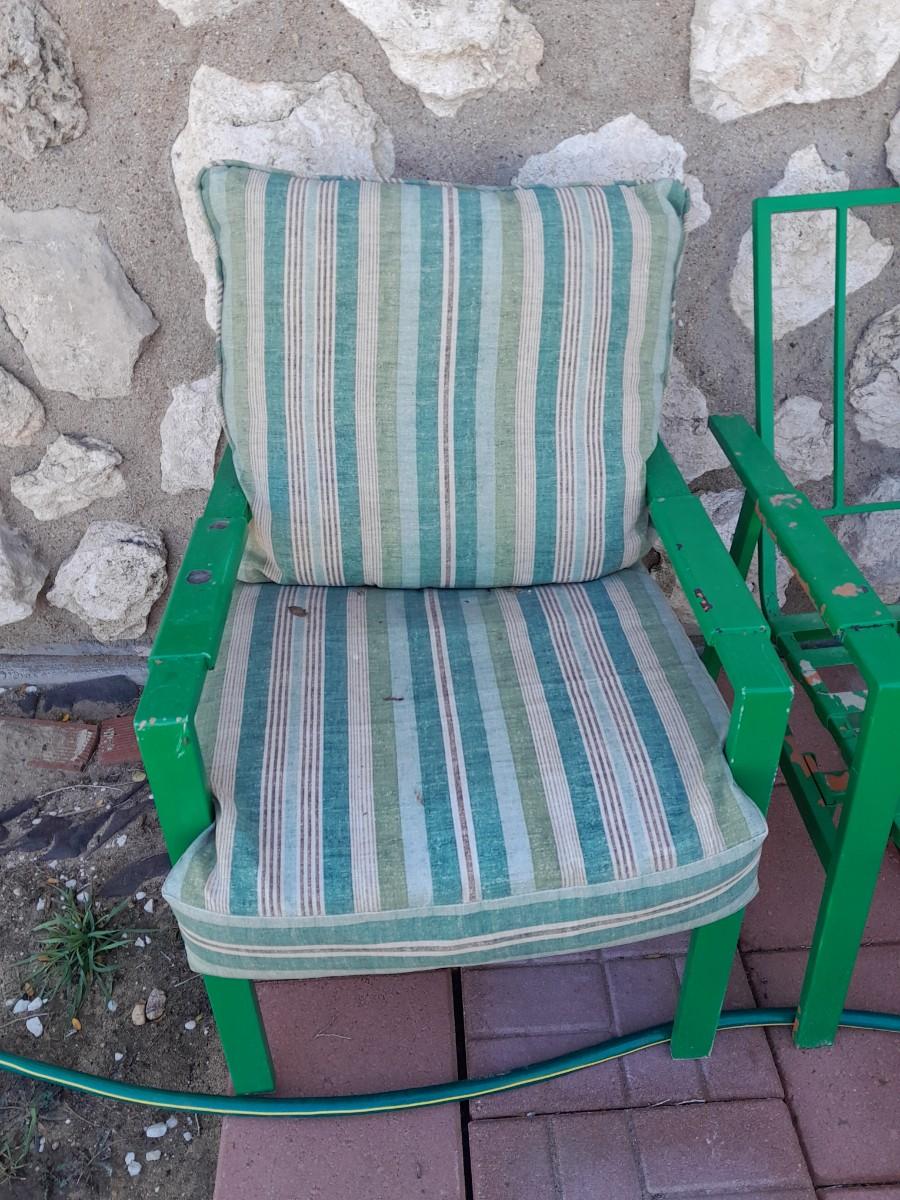 THREE VINTAGE METAL PATIO CHAIRS WITH CUSHIONS