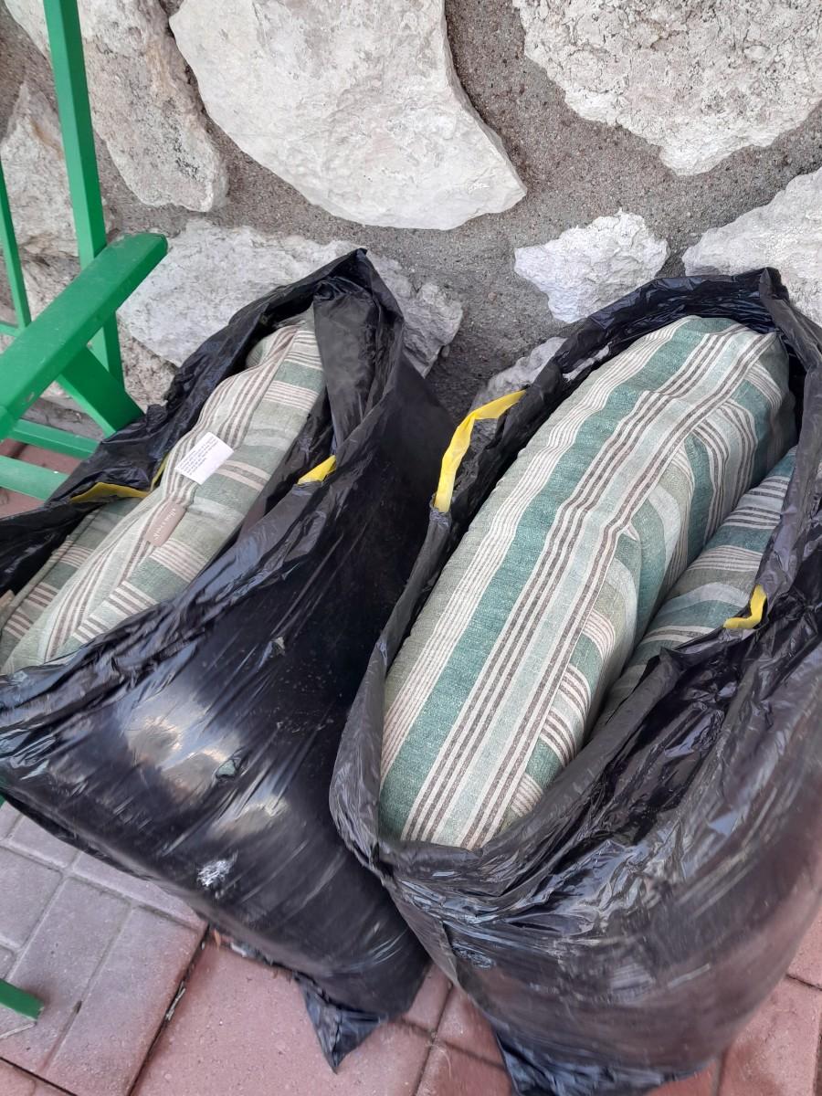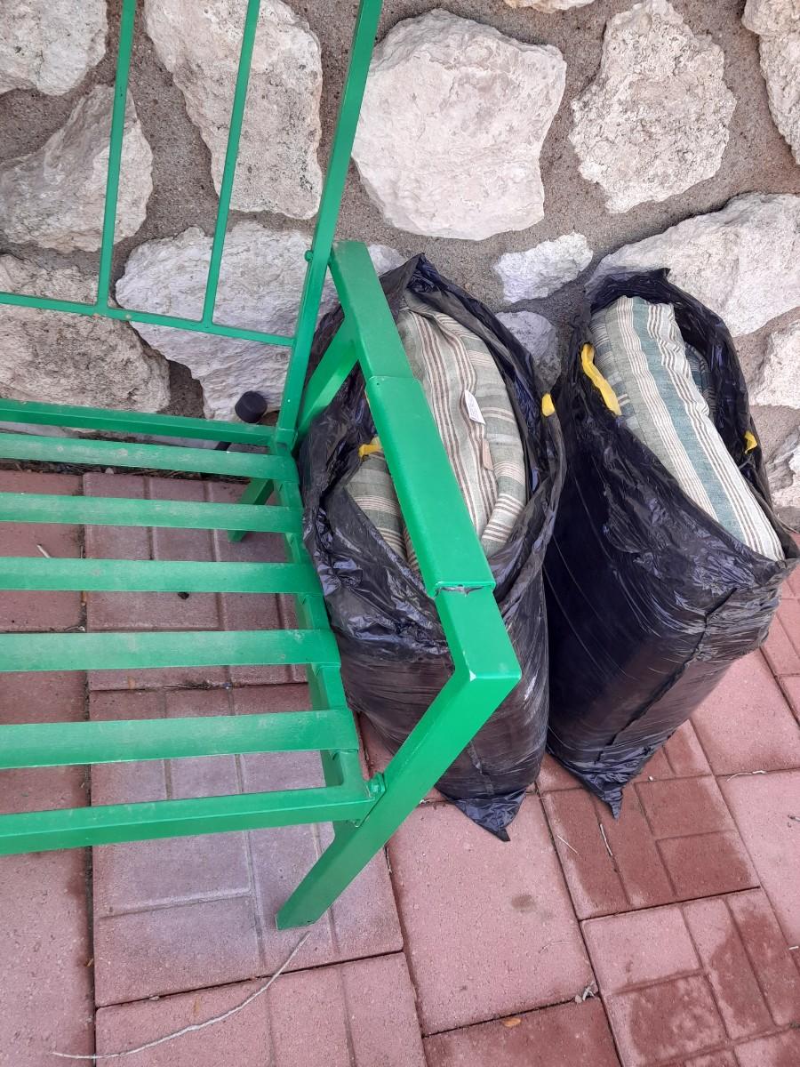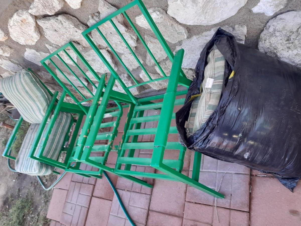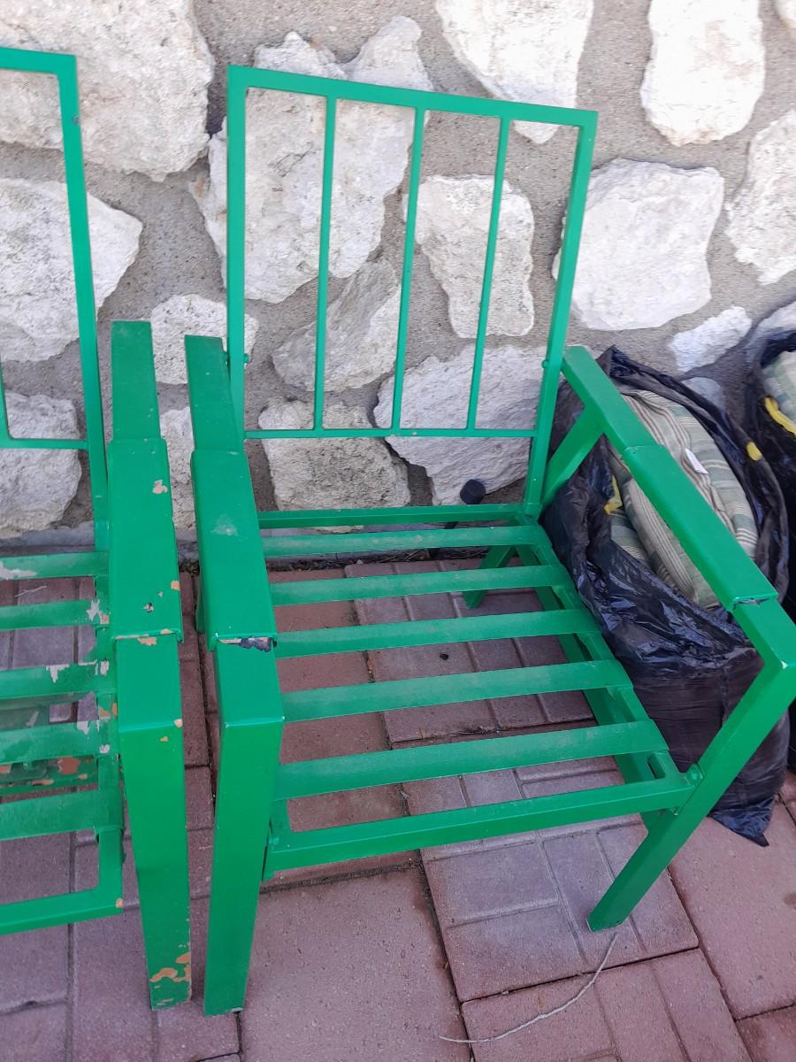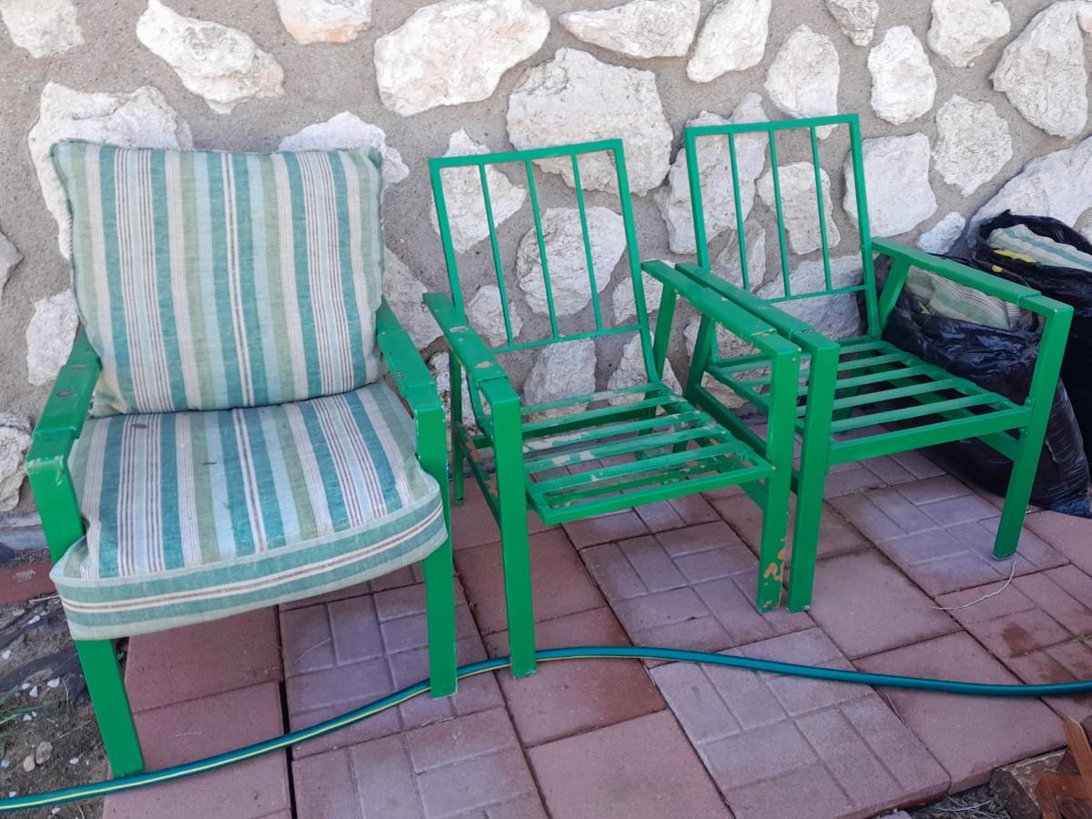 THREE VINTAGE METAL PATIO CHAIRS WITH CUSHIONS