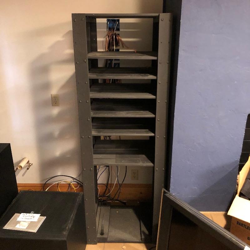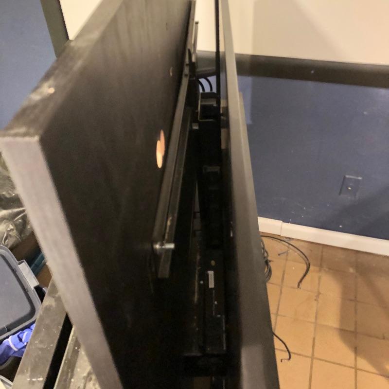Large black wooden TV cabinet and large media stand complete this lot. Hide your TV out of sight when not in use with this sleek TV cabinet that measures 53” wide x 18” deep and 58” high when the stand is raised and 34” when it’s down and closed. A 40” TV had been mounted on this unit previously. The actual measurements of where the TV is mounted are 44” wide by 23” high. This unit has been tested and appears to raise and lower well. See images for more information. Also included is a large stand for media that measures 20” x 24” x 69”.