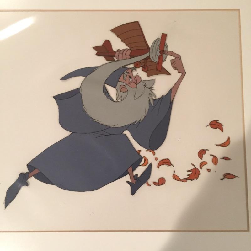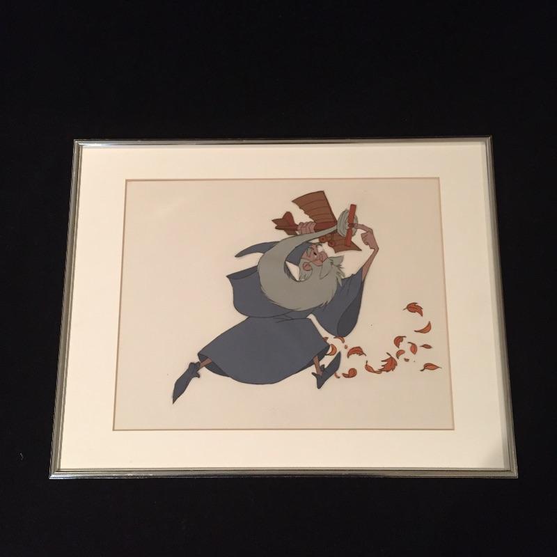 Framed and matted cell depicting a wizard with an airplane. This piece is set on a nice metal frame with a white Mat. Measures 18” x 14”. Per google, a Cell is described as an animation technique in which each frame is drawn by hand on a physical medium.