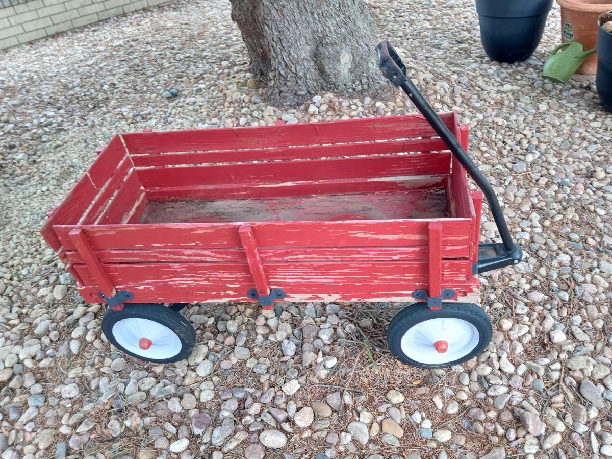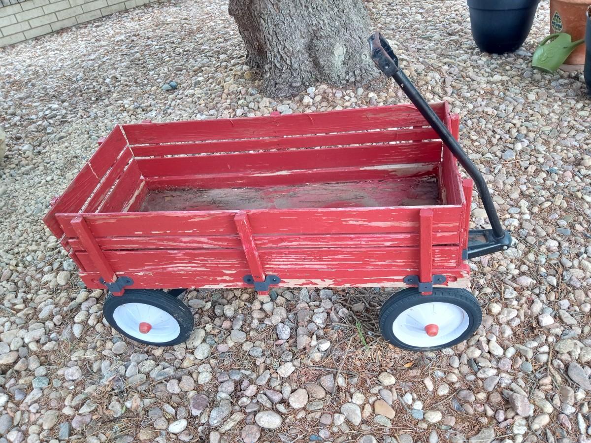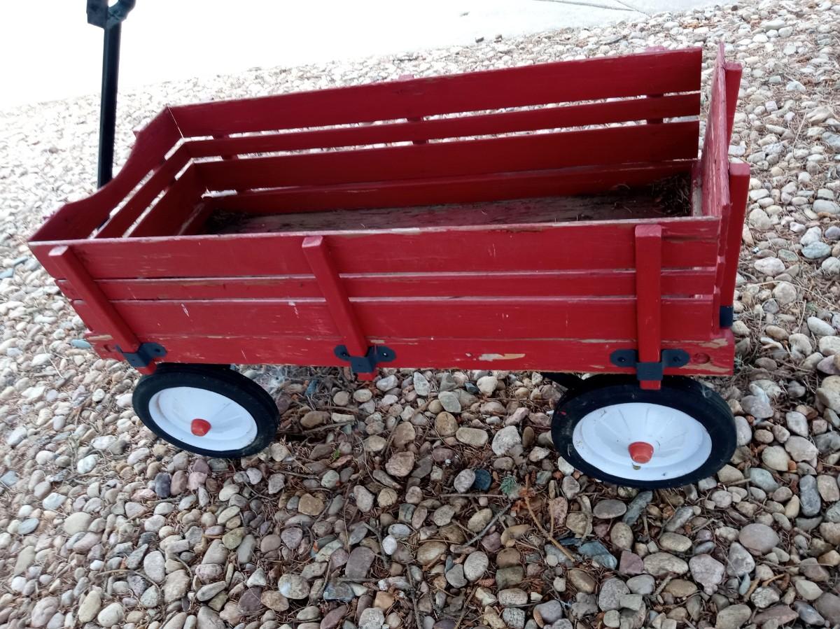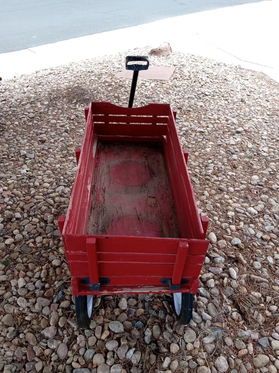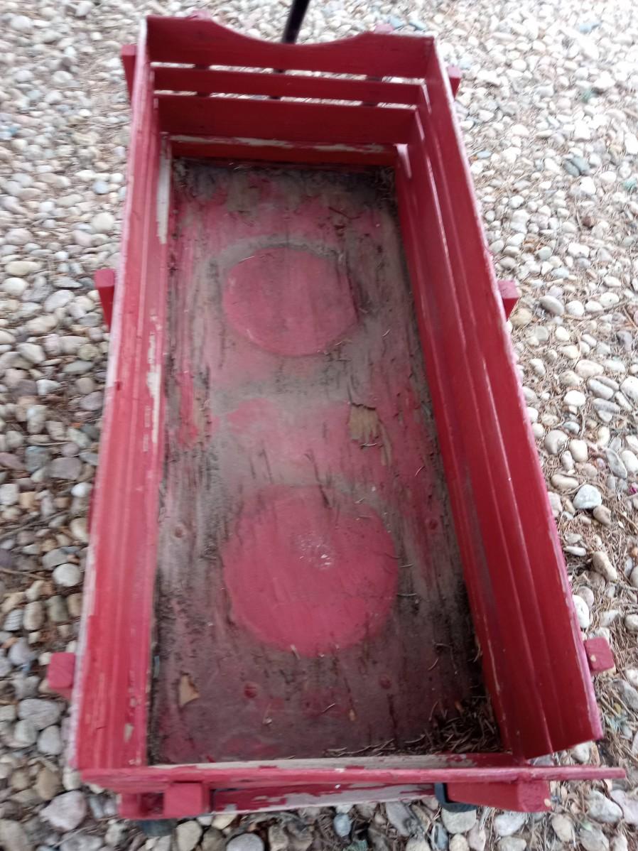 THE WOOD ON THE BOTTOM OF THE WAGON IS WARPED, THE ENTIRE WAGON HAS PAINT LOSS