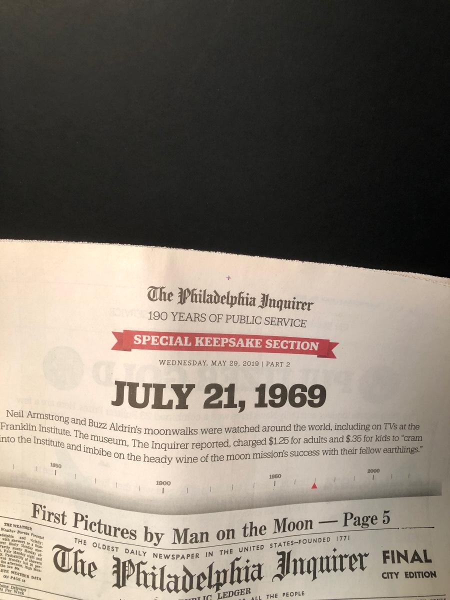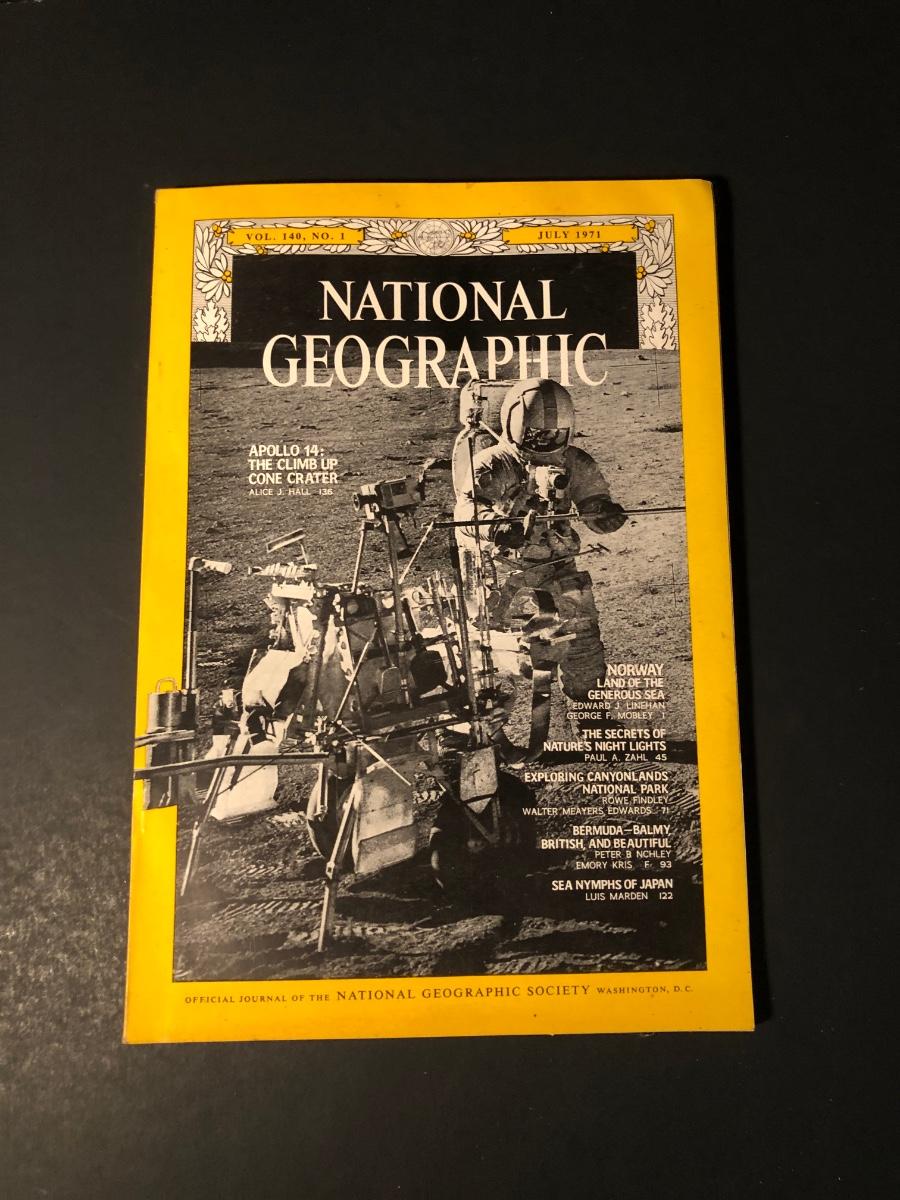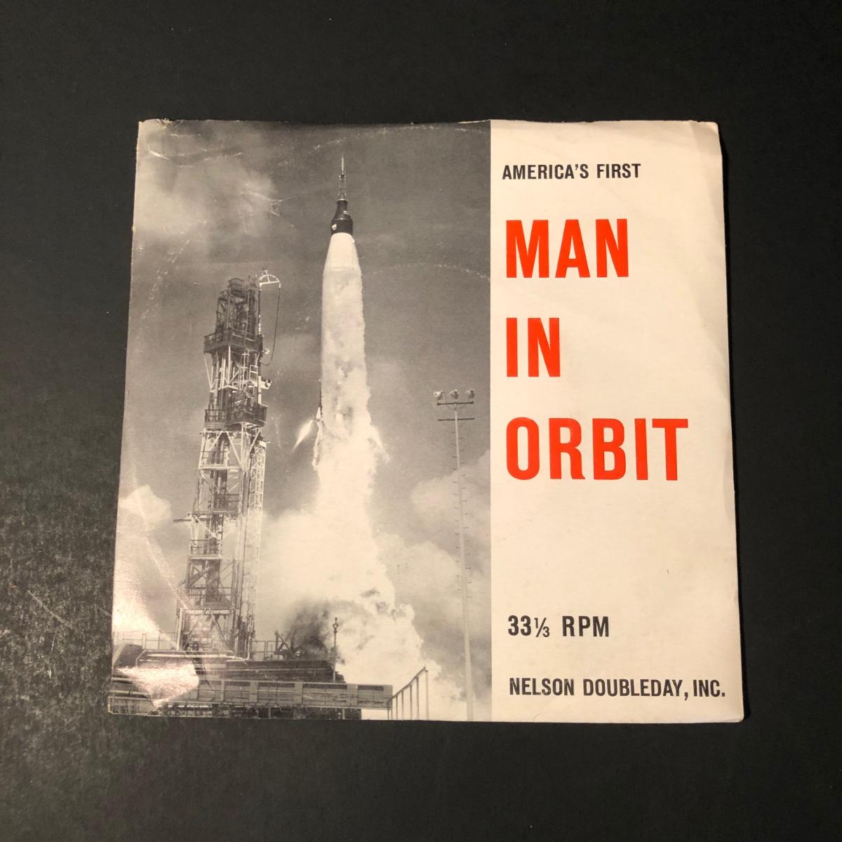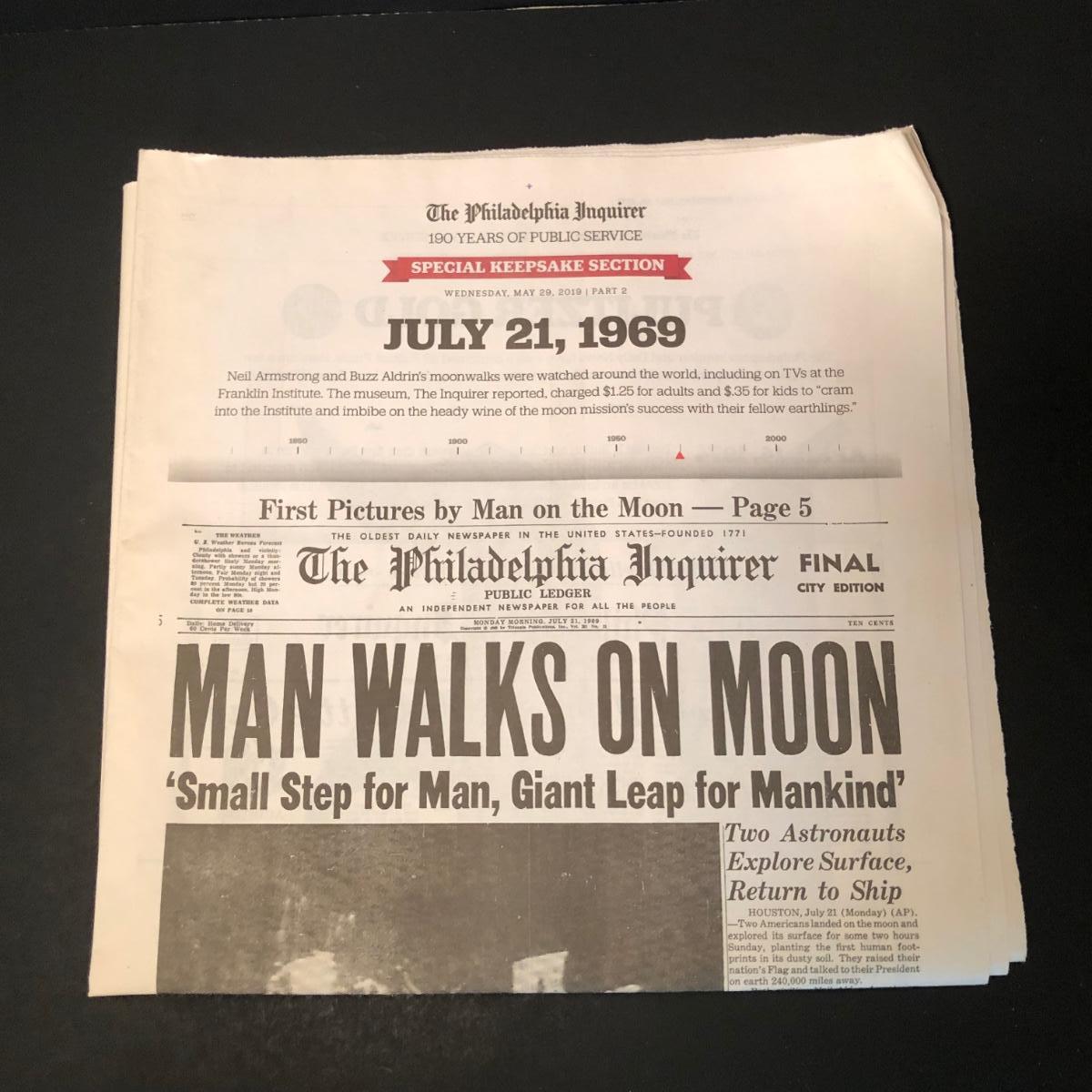 LOT 277F: Philadelphia Inquirer Reproduction of July 31, 1960 MAN WALKS ON MOON Headline Paper, Nelson Doubleday, Inc. America's First Man in Orbit 45 Record, 1964 & 1971 National Geographic Magazines