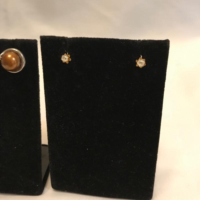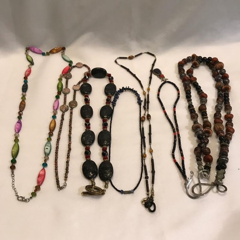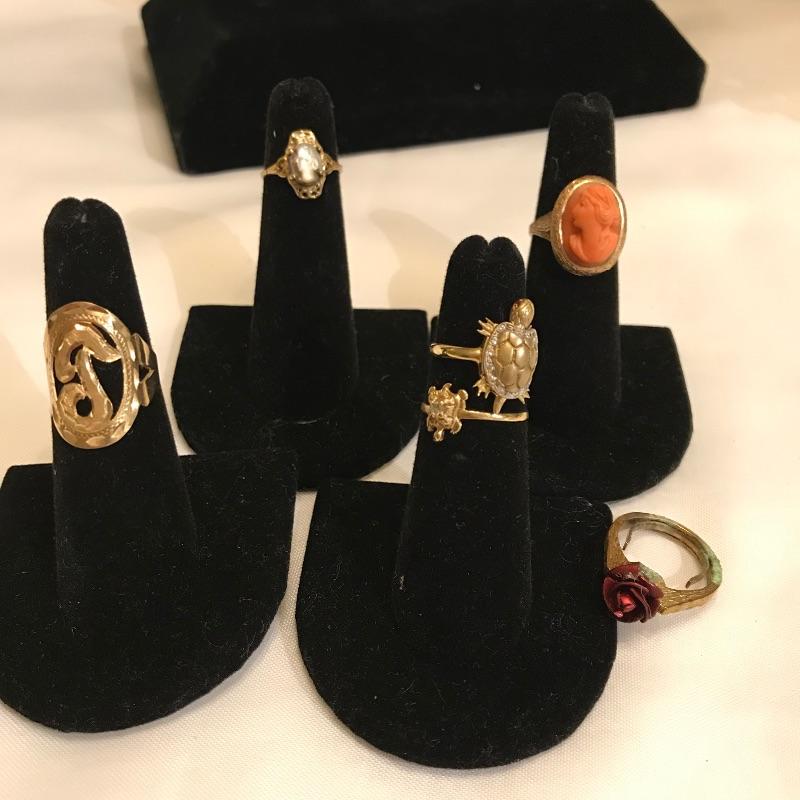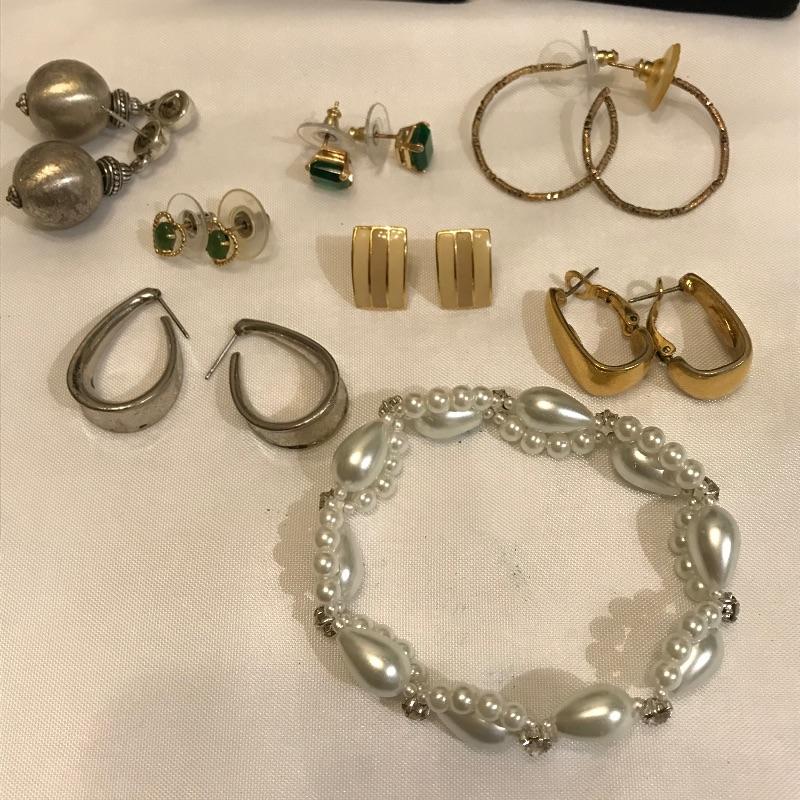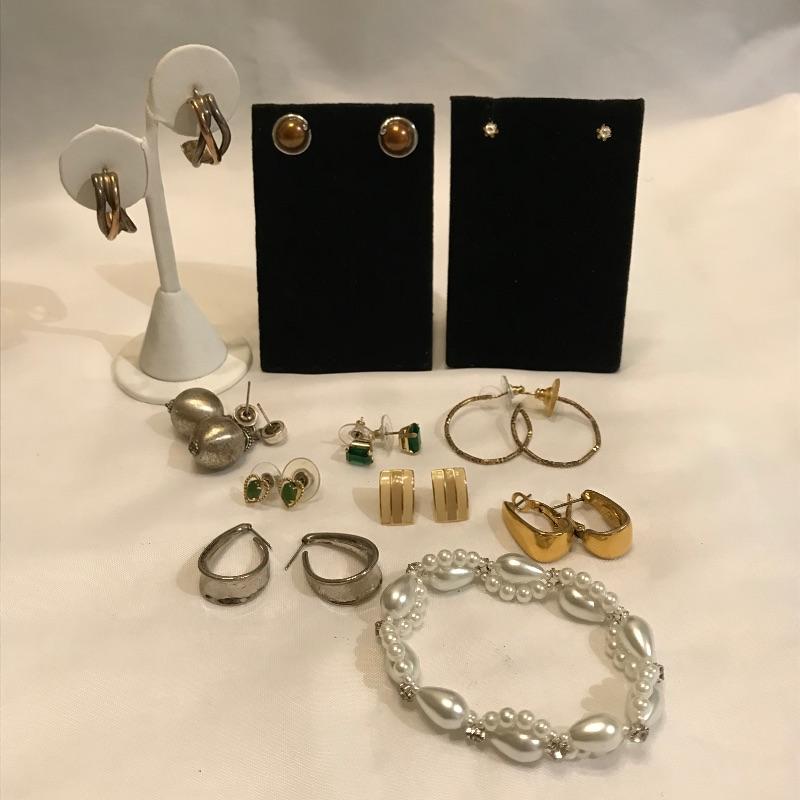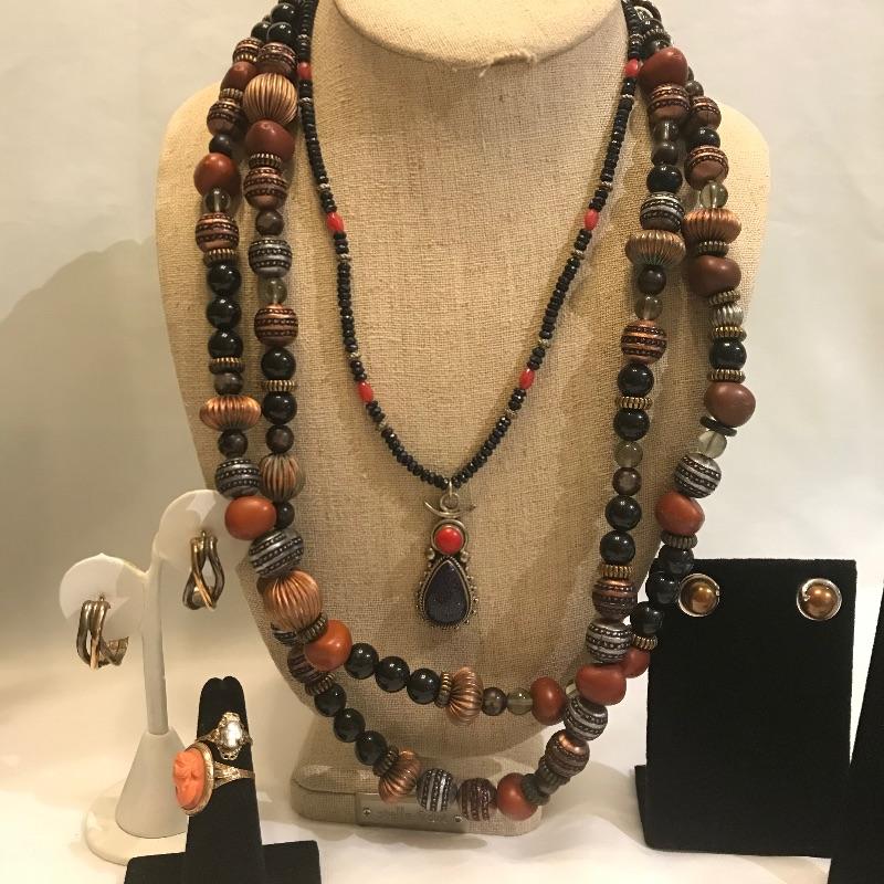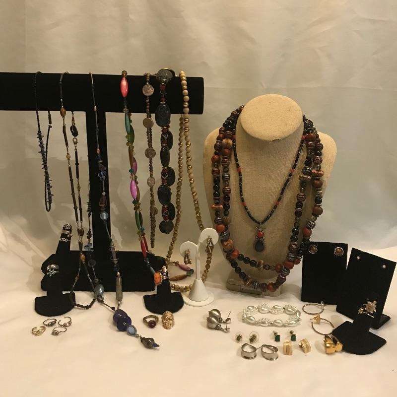 We have jewelry here from neck to toes! Five fun toe rings marked as sterling/925 with a few more unmarked pieces. Lot features a variety of fun yet classic gold colored rings. Any markings found on rings are shown in photos. The earring collection is geared towards pierced ears with known information as follows on the three pairs shown on displays. The tri-colored hoop like earrings appear to say 14K GF, the two toned bronze studs are marked 925 China and the final studs shown registered as moissanite. Lot also features bold necklaces, mostly long with a few shorter ones involved. These necklaces have a variety of looks with their stones, beads, glass and even one with a beautiful 925 pendant. See photos. Shipping available.