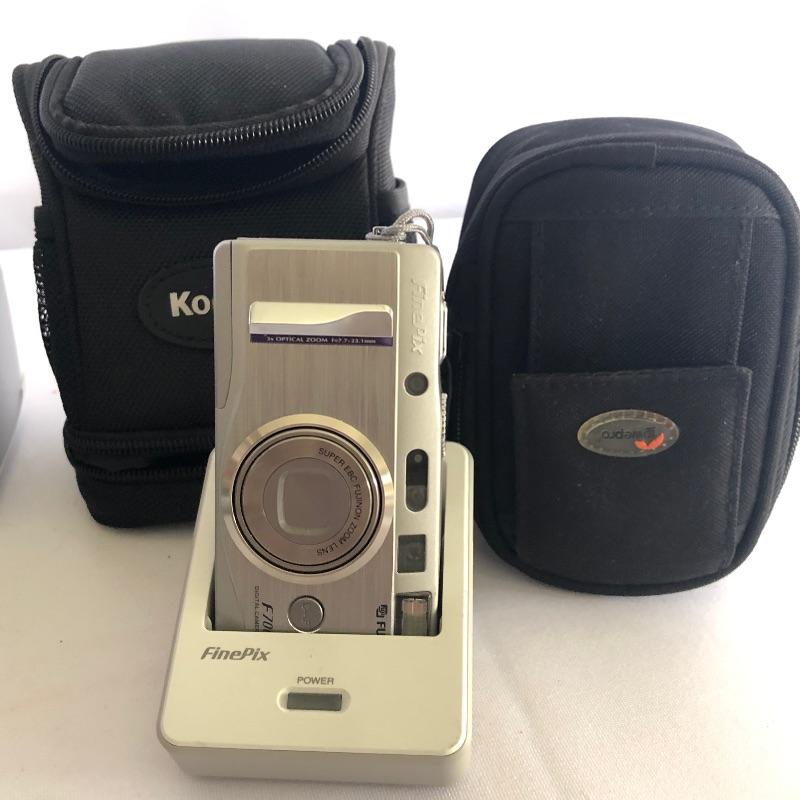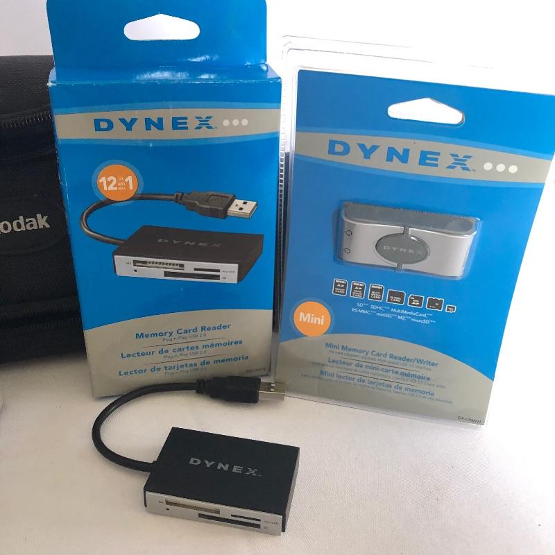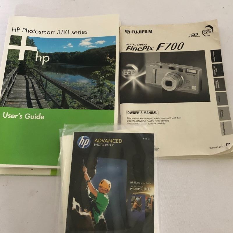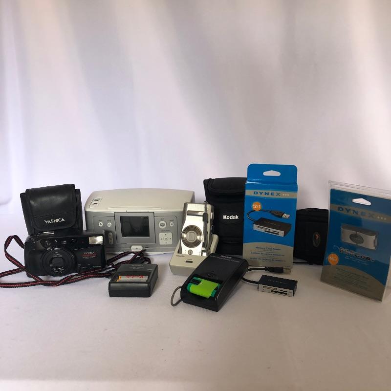 HP photosmart 385 printer appears to be in good shape but is missing cords. The Canon printer is also missing cords. Fugi Finepix camera with charger is missing cords, Kodak battery charger does not come on when plugged in but Fugi battery charger does come on when plugged in. Yashica Zoomtec Camera needs a new battery to be tested and comes with carrying case. Lot also includes a Dynex memory card reader and a dynex mini memory card reader, as well as manuals.