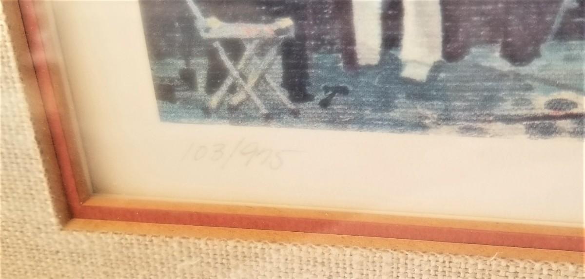 Signed/numbered print by listed artist James Kendrick III, best known for his realistic paintings of Plantation homes and New Orleans scenes. This one was done in 1976, is double matted, and is #103/975. The bottom of the frame has one "skinned" spot on it (see photos). Measures 27.5" across, 23" tall.