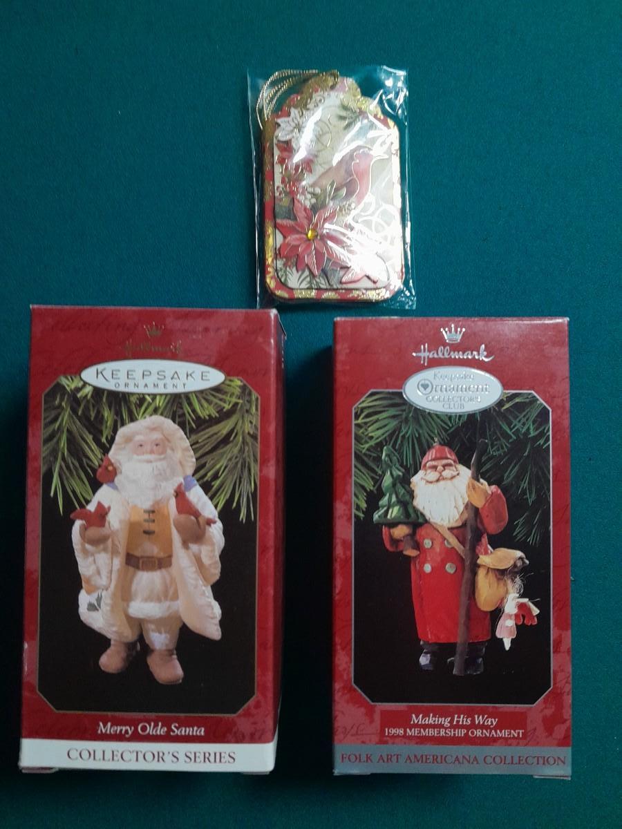 HALLMARK CHRISTMAS ORNAMENTS MERRY OL SANTA & MAKING HIS WAY SANTA WITH NEW GIFT TAGS