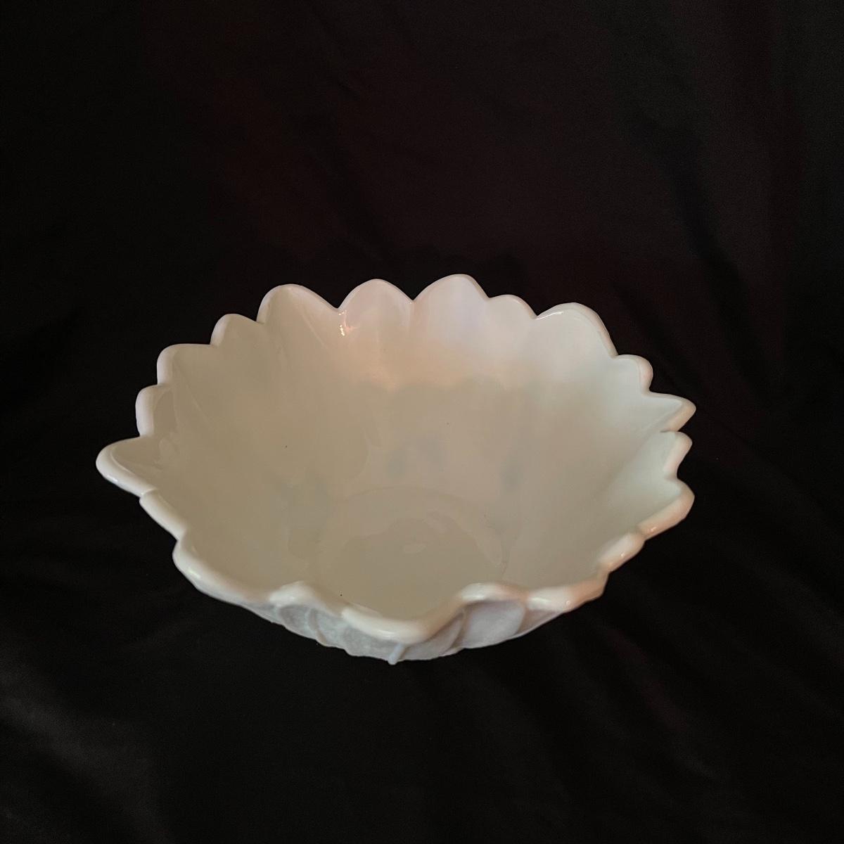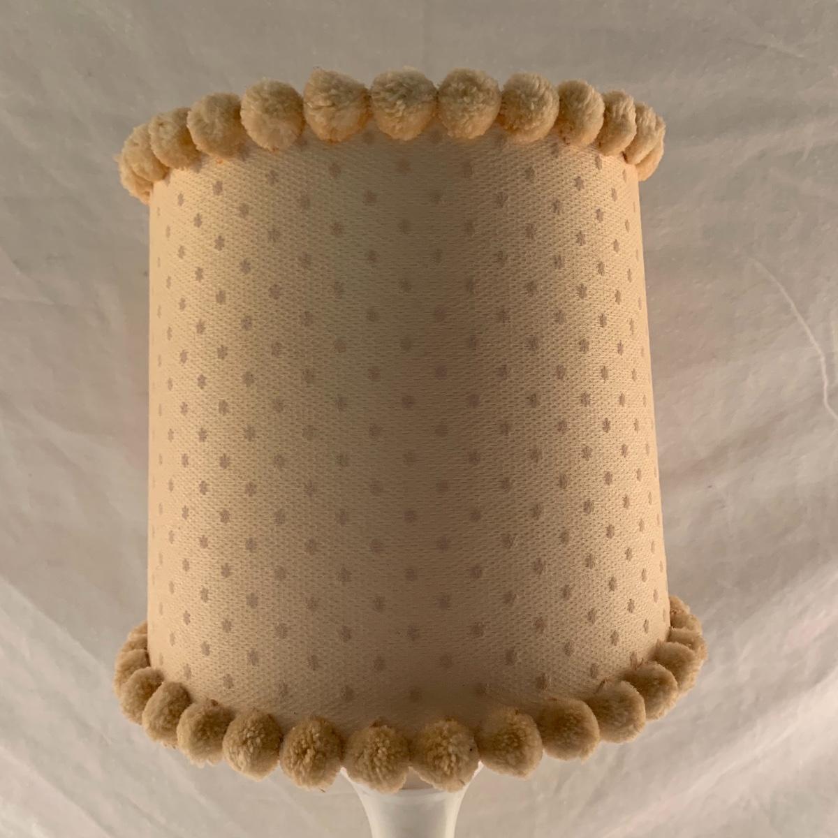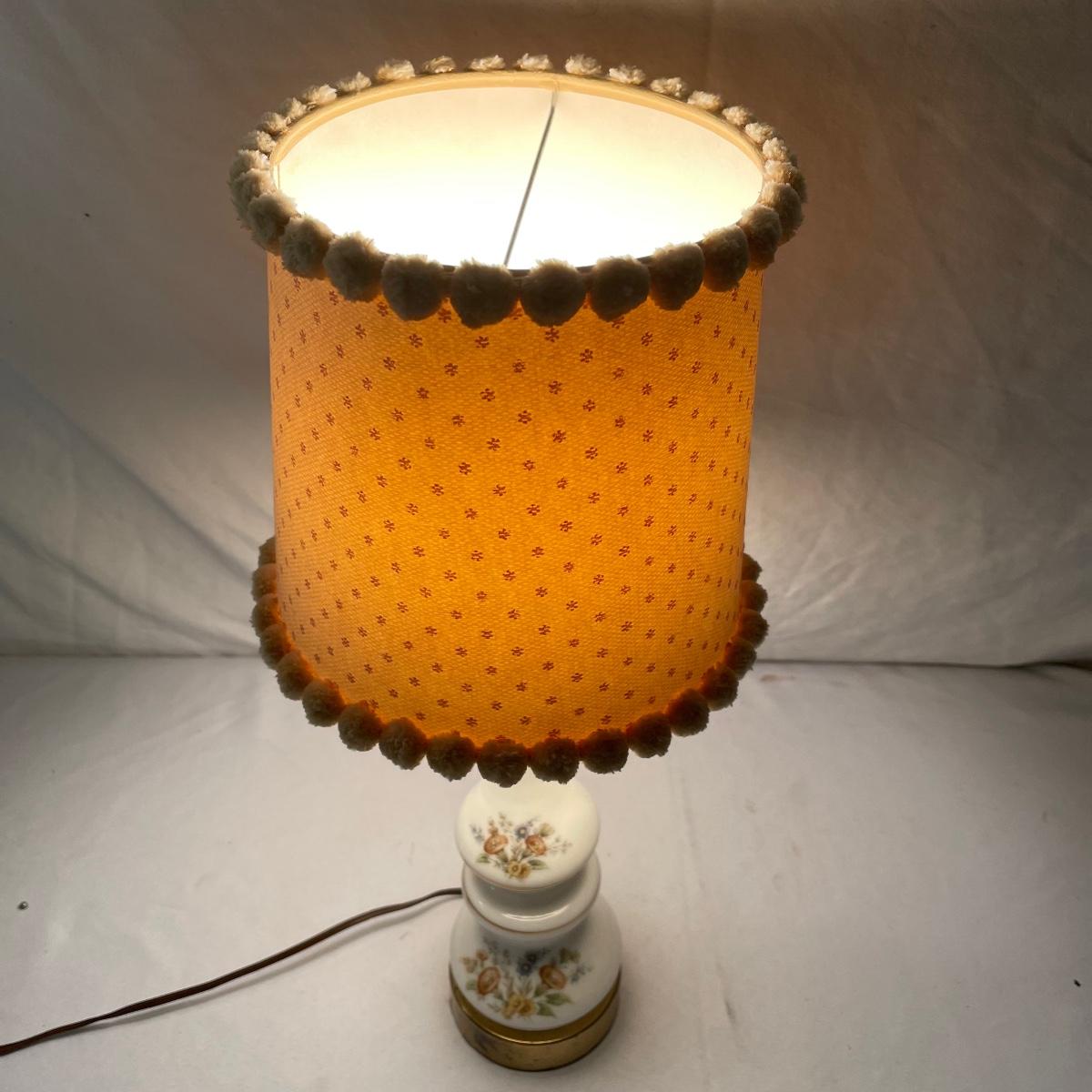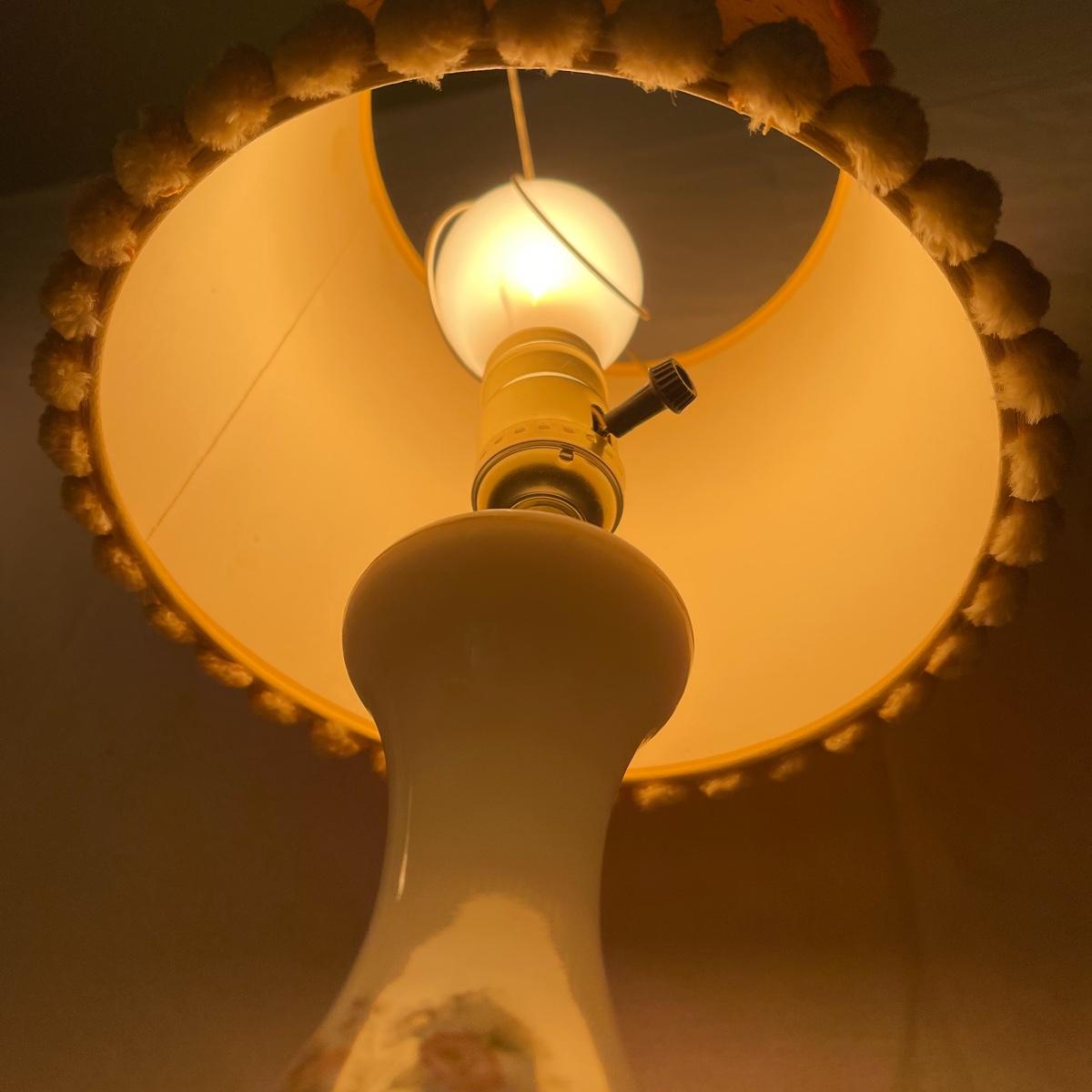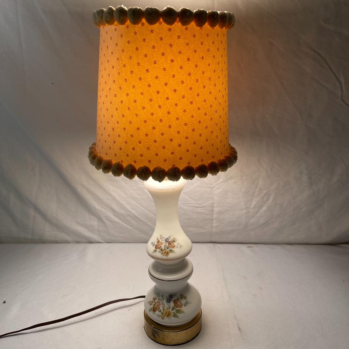 Here we have a lovely assortment of vintage milk glass items. Included is a cake stand, a serving dish, a bowl with a leaf design, and a covered candy dish. This lot also includes a lamp that boasts a beautiful rose motif, gold trim, and a cute shade decorated with pom poms. The light is in working condition and measures 21.5” tall.