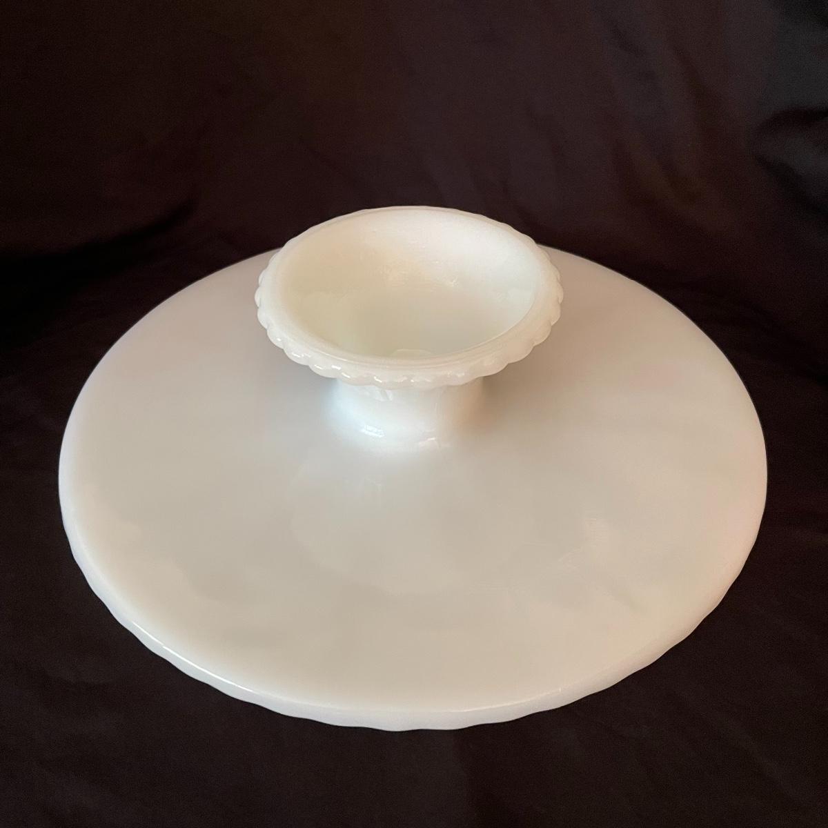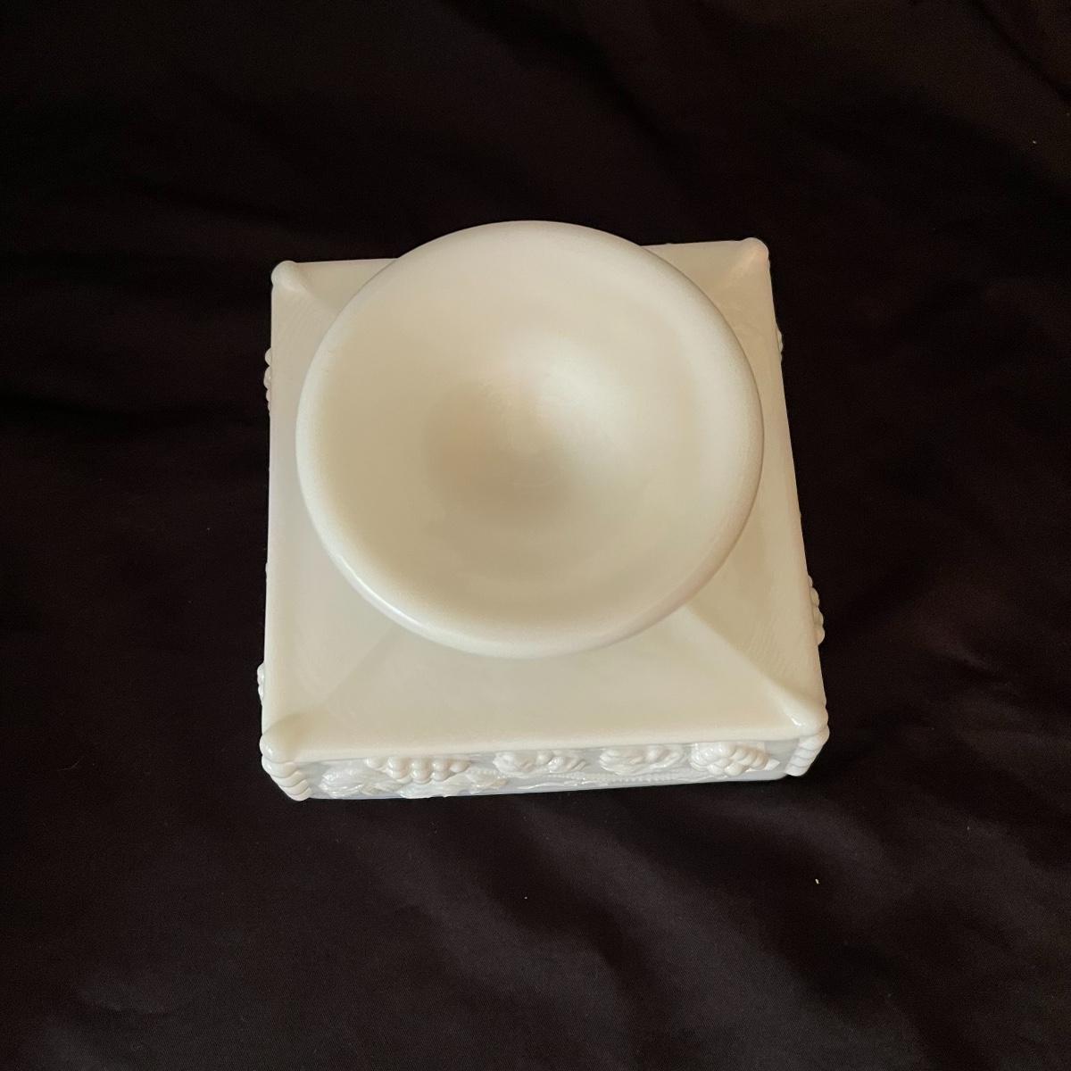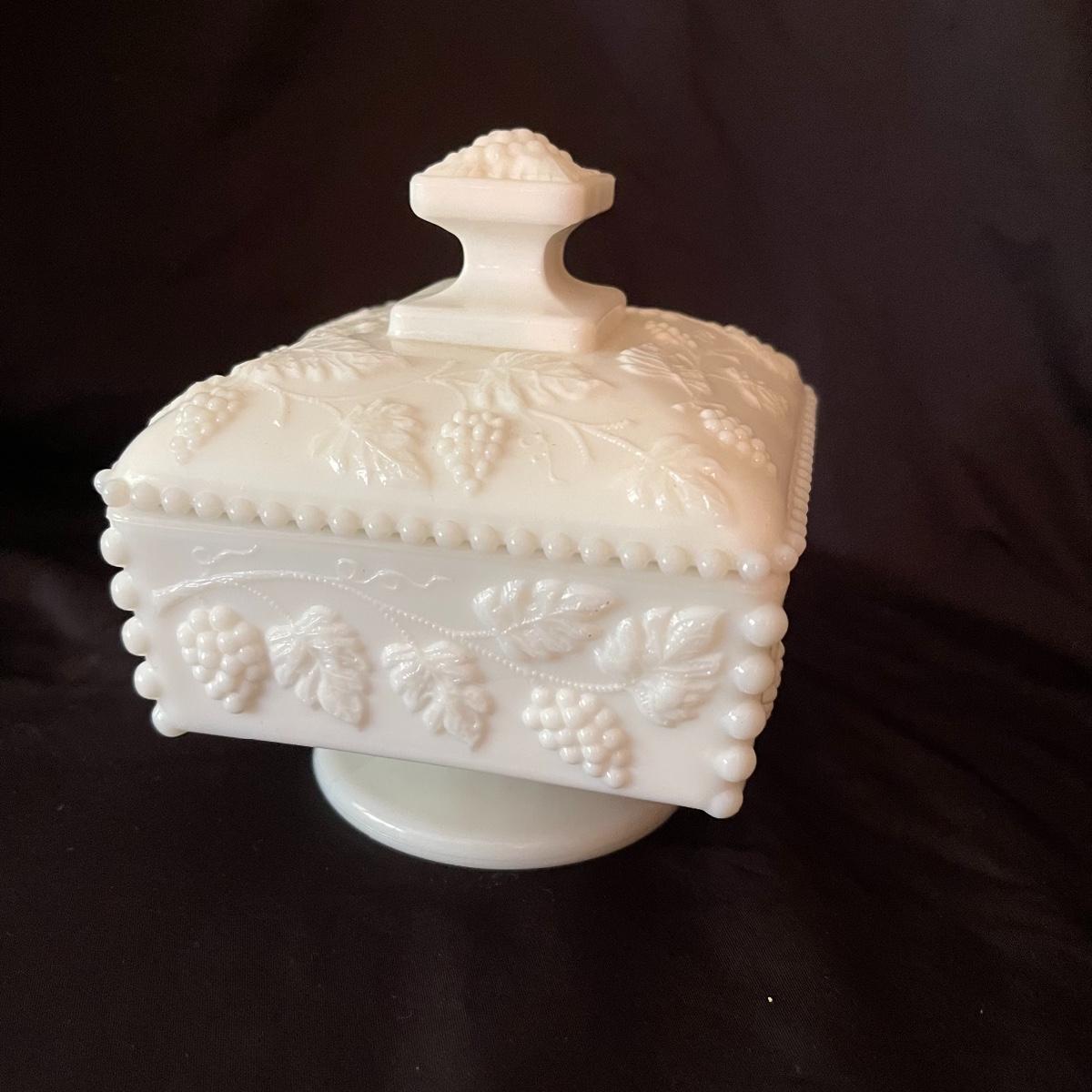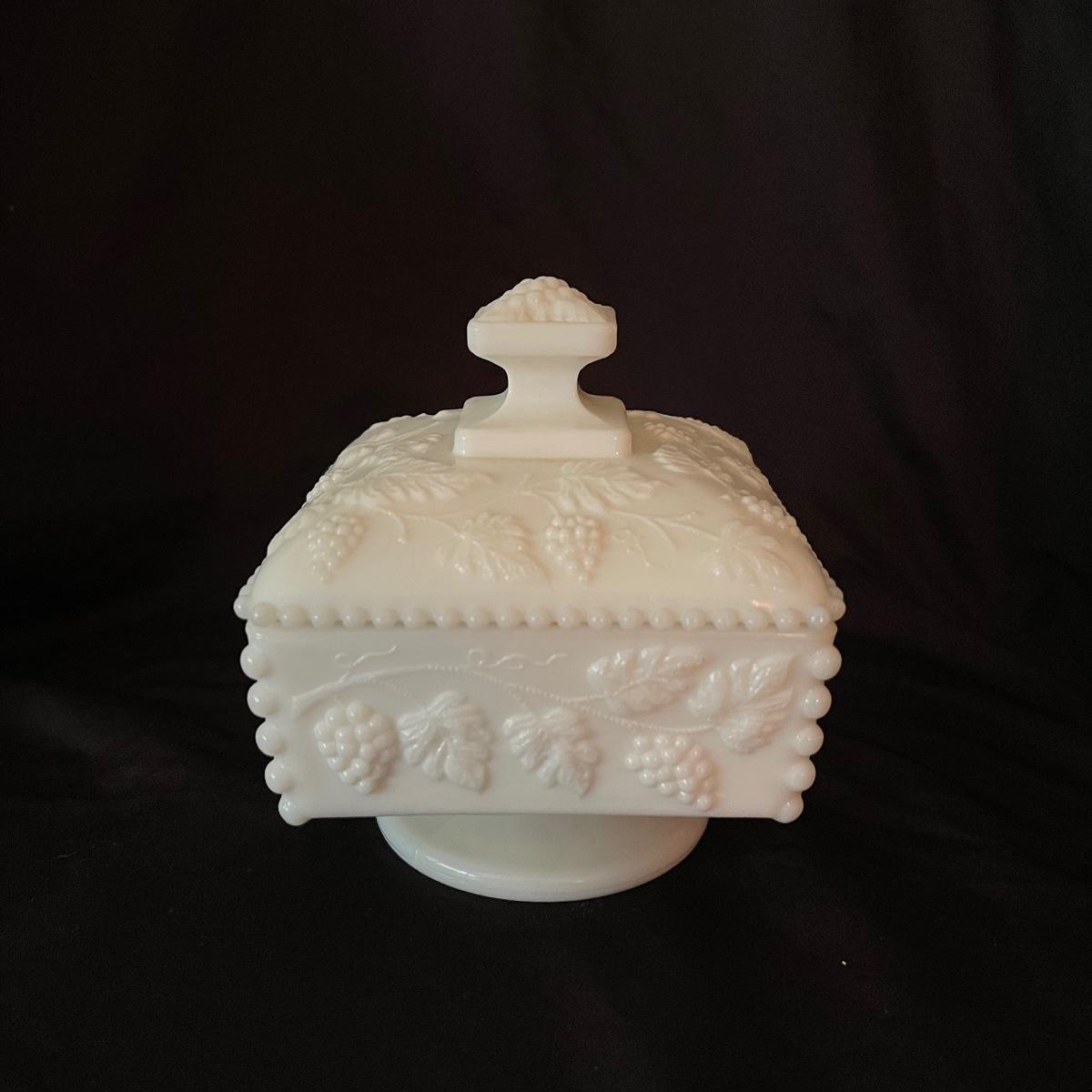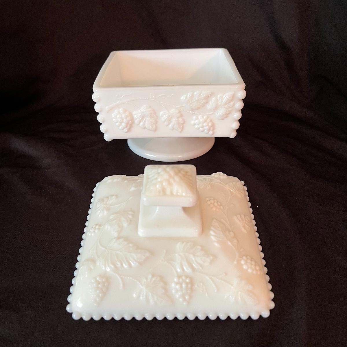 Here we have a lovely assortment of vintage milk glass items. Included is a cake stand, a serving dish, a bowl with a leaf design, and a covered candy dish. This lot also includes a lamp that boasts a beautiful rose motif, gold trim, and a cute shade decorated with pom poms. The light is in working condition and measures 21.5” tall.