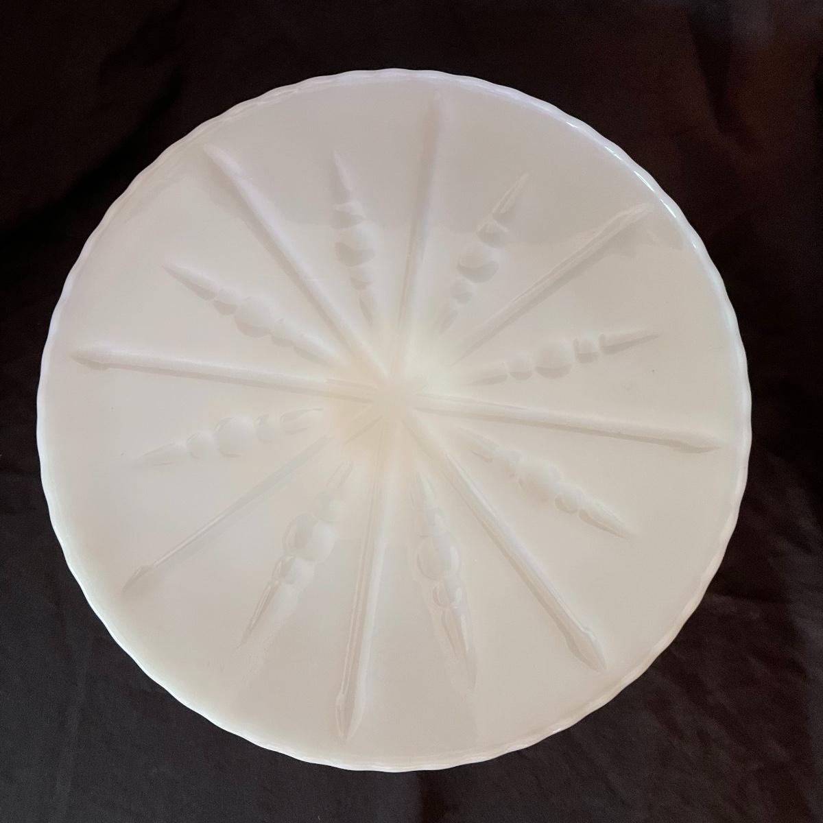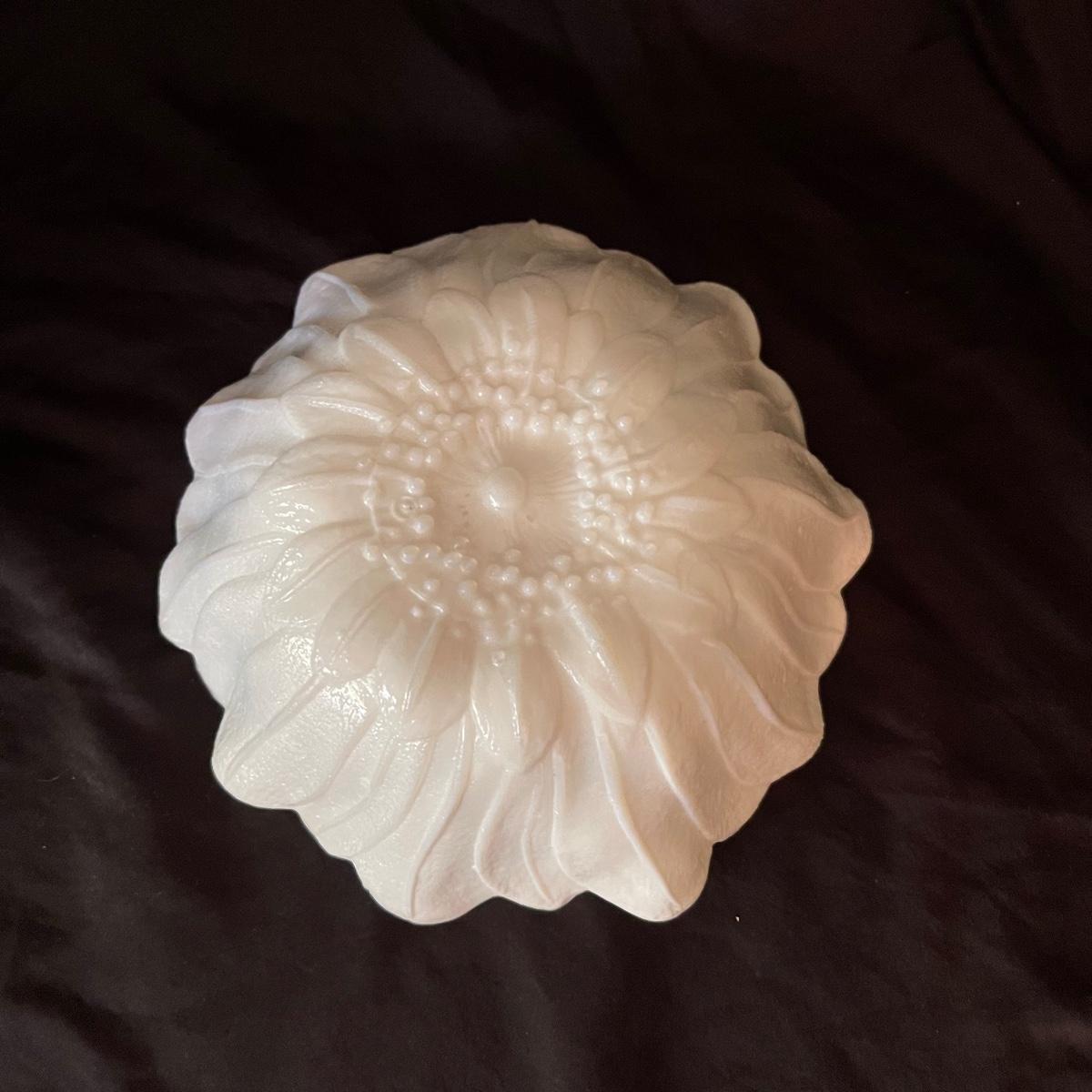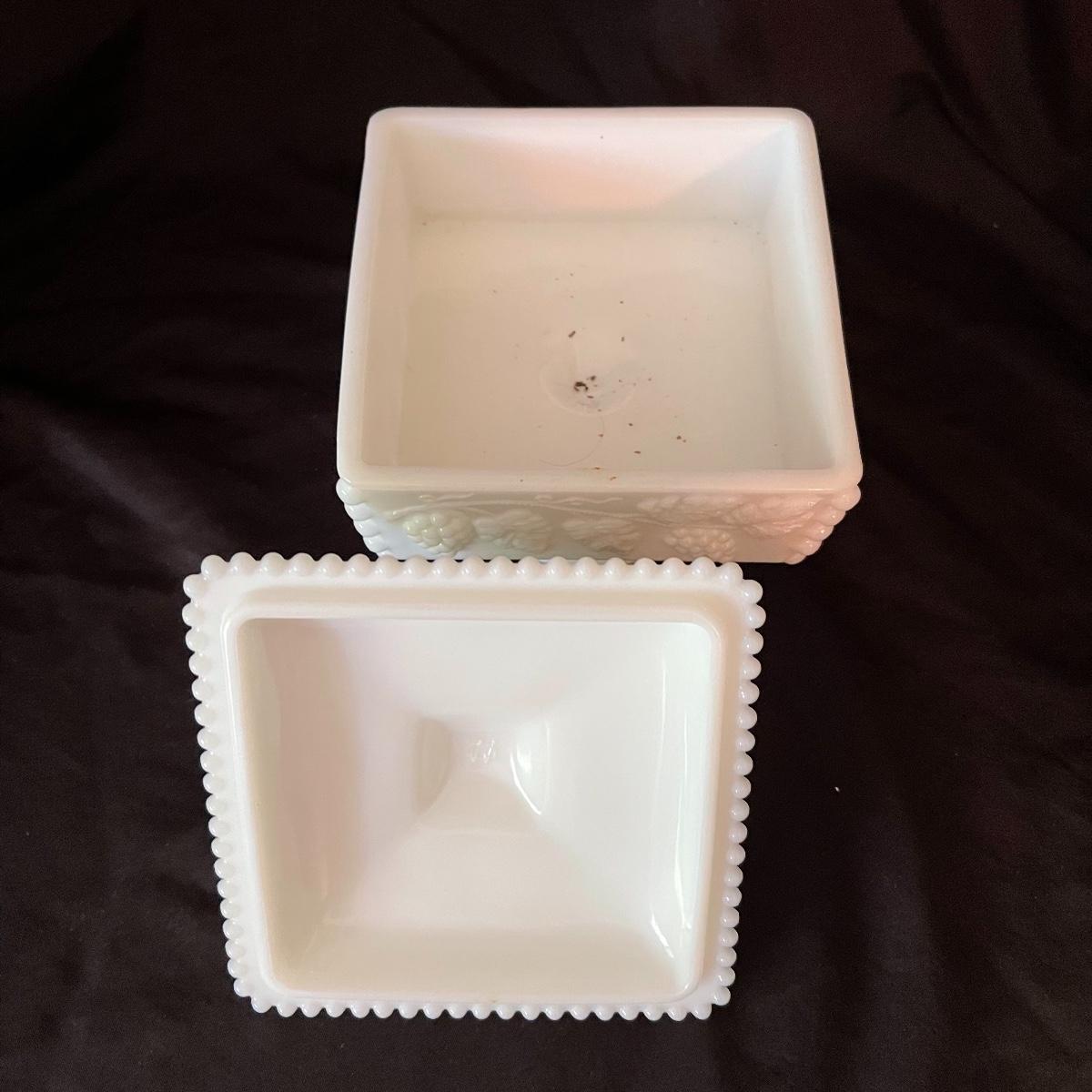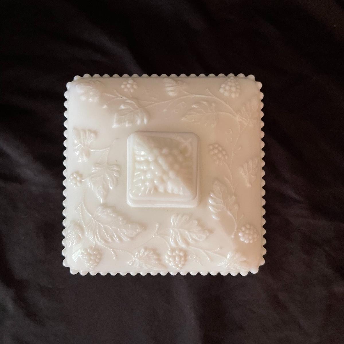 Here we have a lovely assortment of vintage milk glass items. Included is a cake stand, a serving dish, a bowl with a leaf design, and a covered candy dish. This lot also includes a lamp that boasts a beautiful rose motif, gold trim, and a cute shade decorated with pom poms. The light is in working condition and measures 21.5” tall.