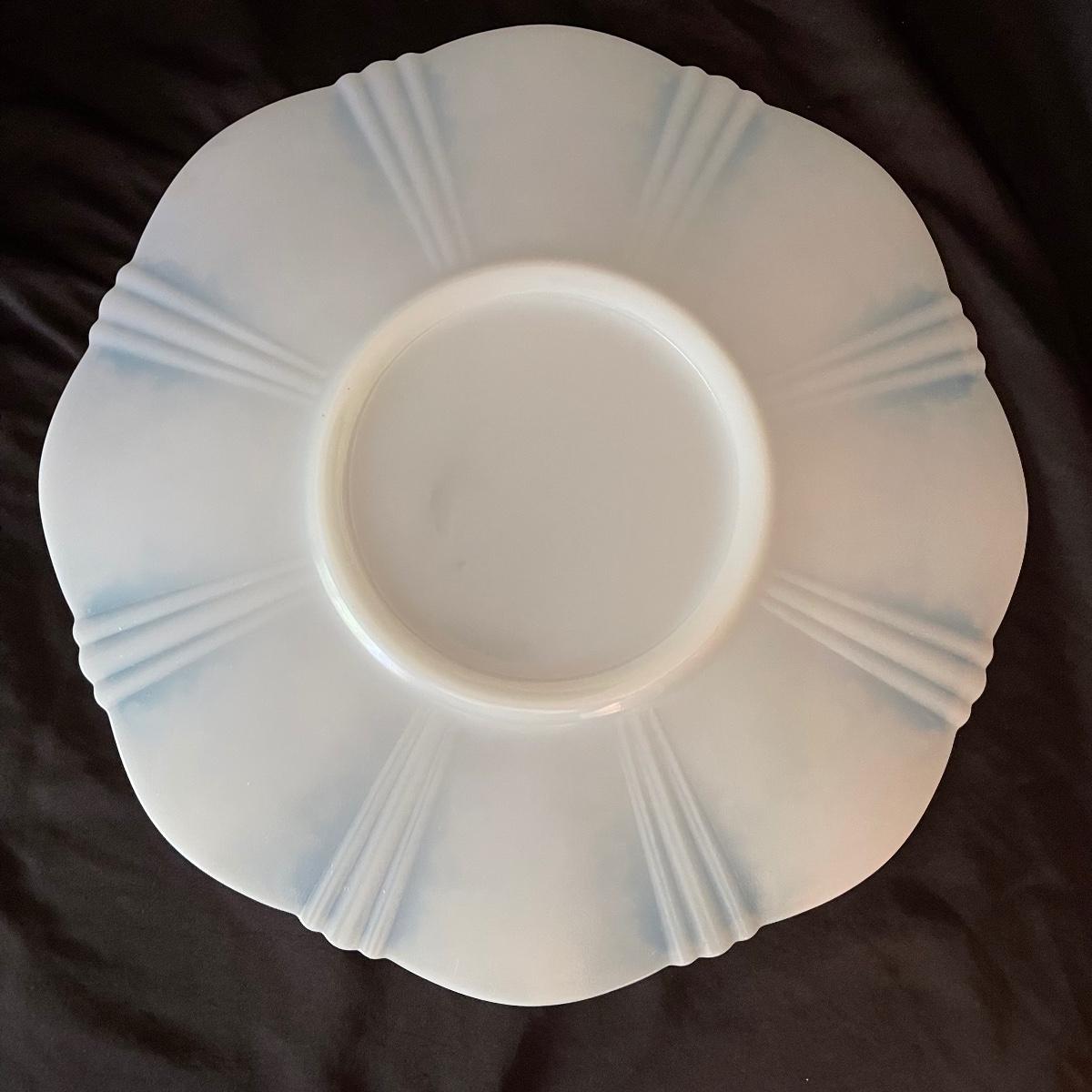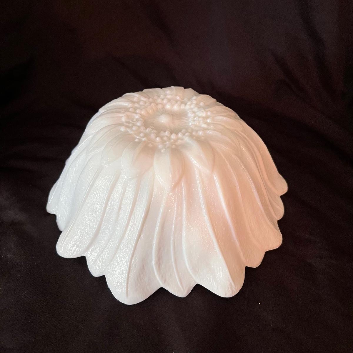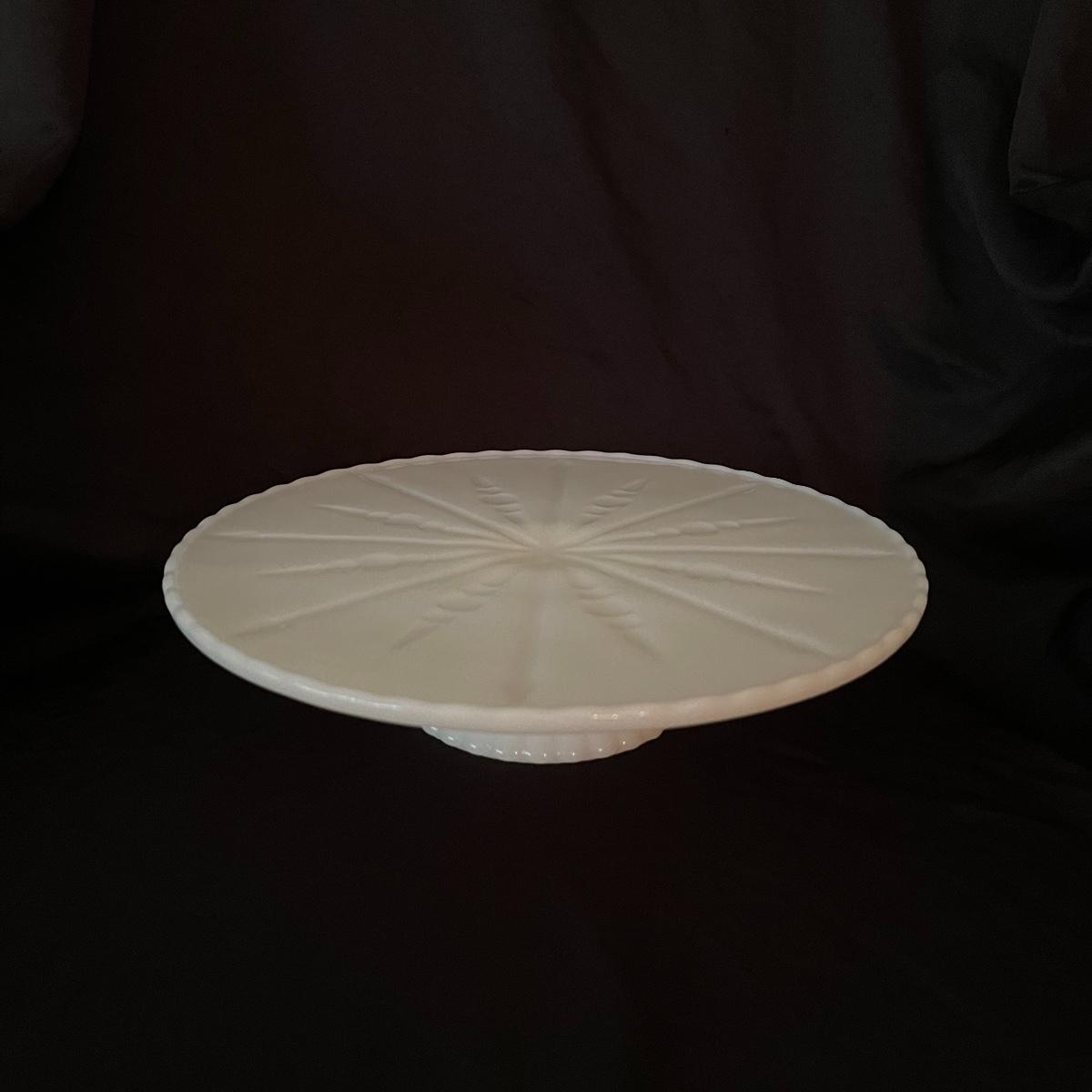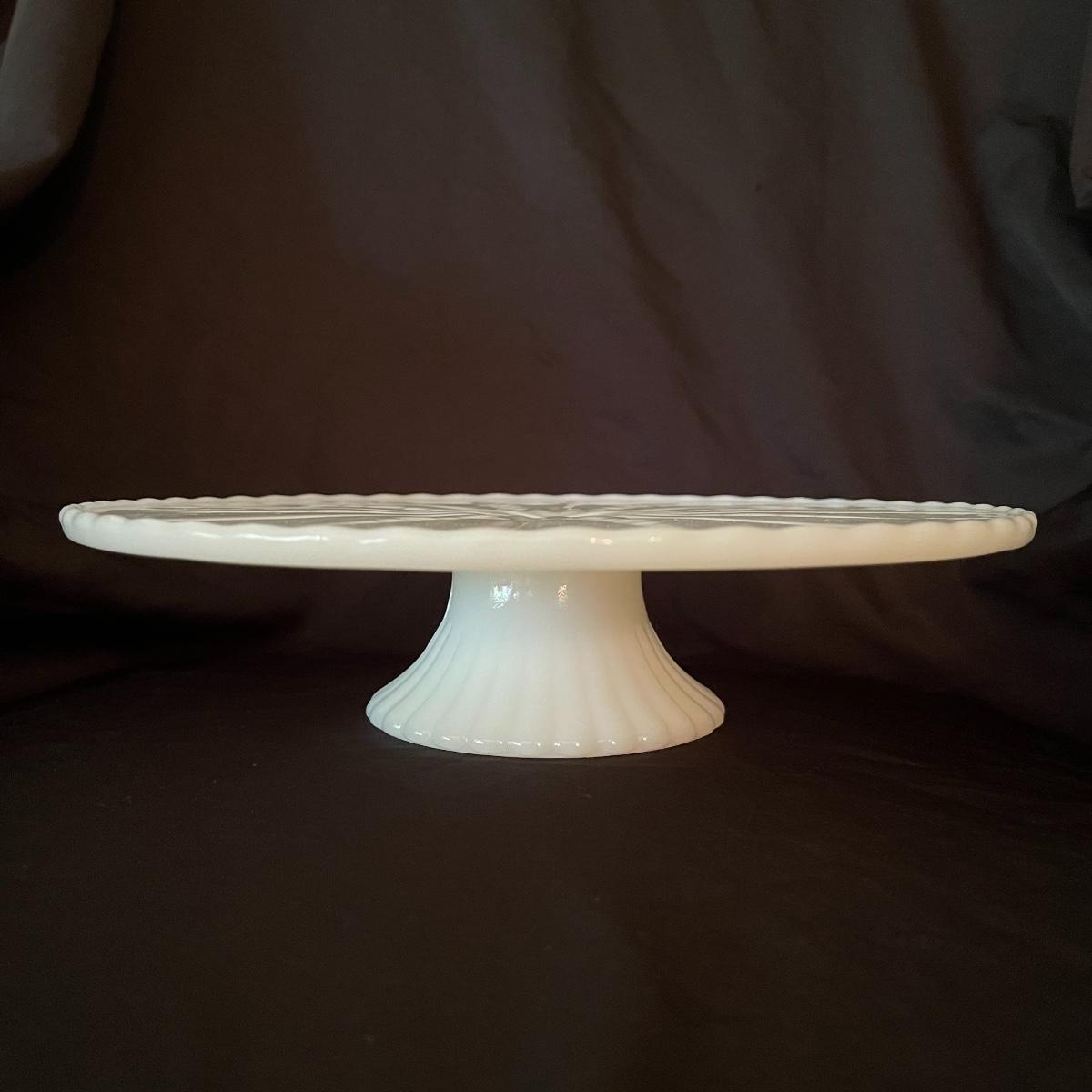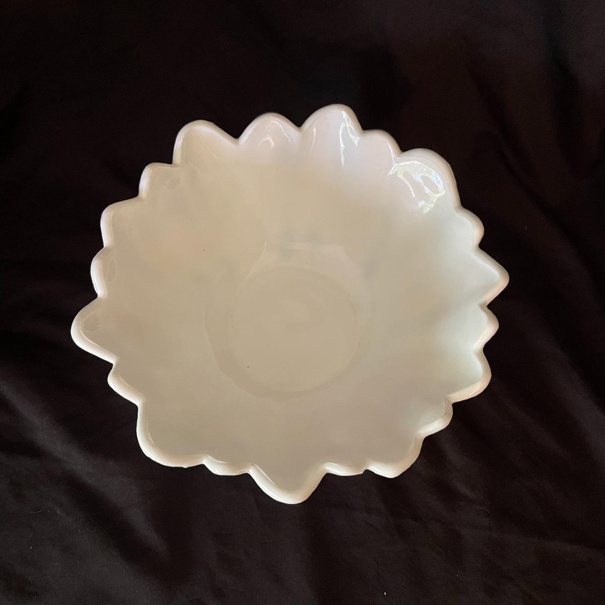 Here we have a lovely assortment of vintage milk glass items. Included is a cake stand, a serving dish, a bowl with a leaf design, and a covered candy dish. This lot also includes a lamp that boasts a beautiful rose motif, gold trim, and a cute shade decorated with pom poms. The light is in working condition and measures 21.5” tall.