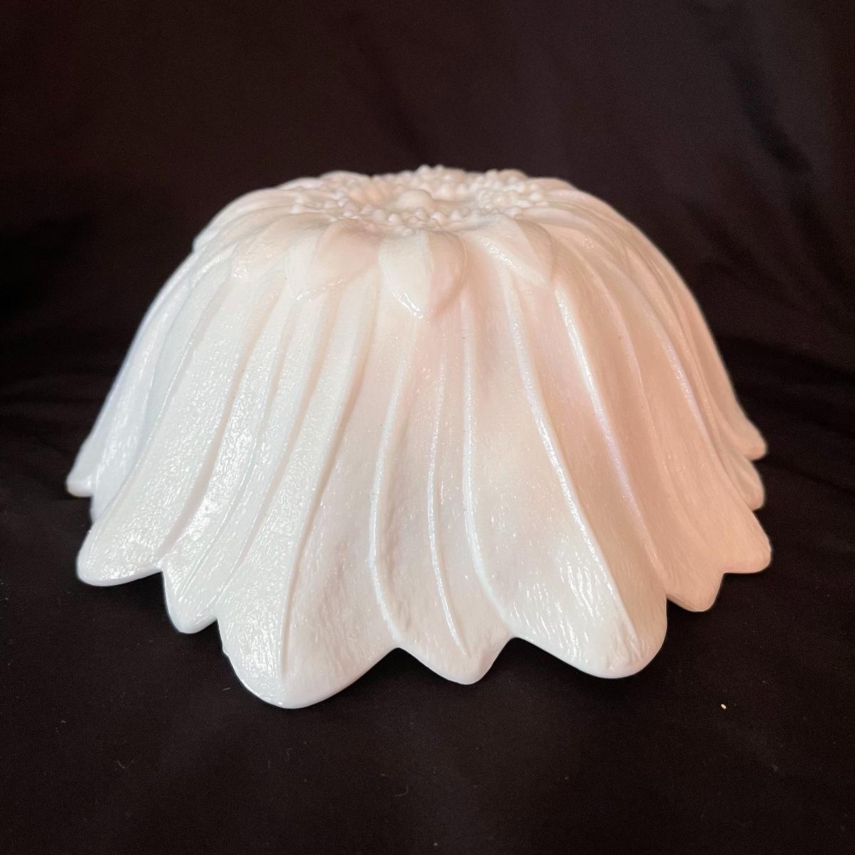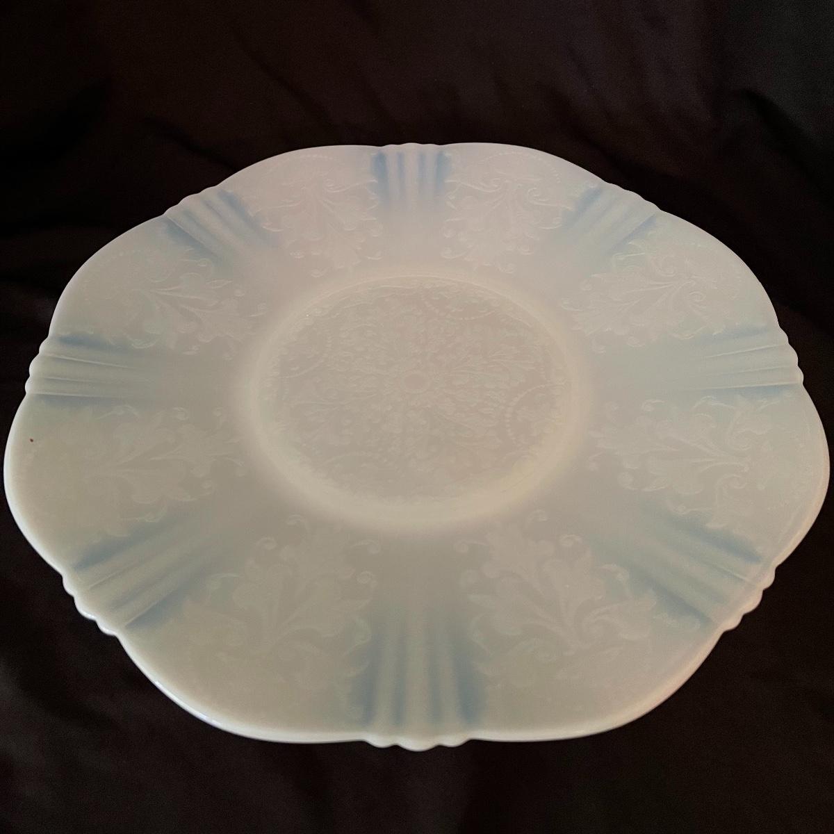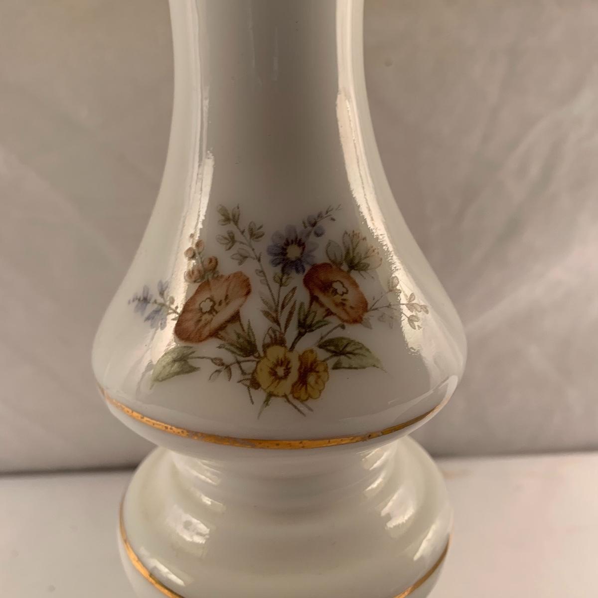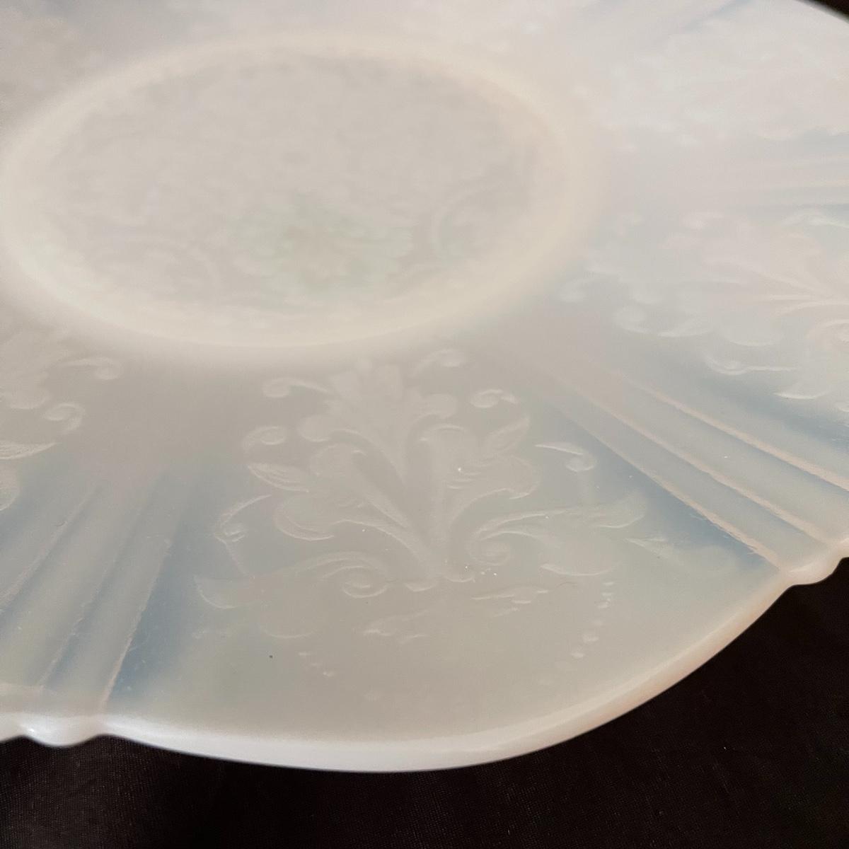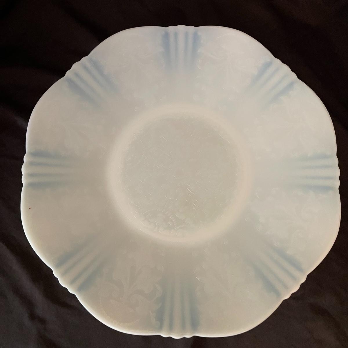 Here we have a lovely assortment of vintage milk glass items. Included is a cake stand, a serving dish, a bowl with a leaf design, and a covered candy dish. This lot also includes a lamp that boasts a beautiful rose motif, gold trim, and a cute shade decorated with pom poms. The light is in working condition and measures 21.5” tall.