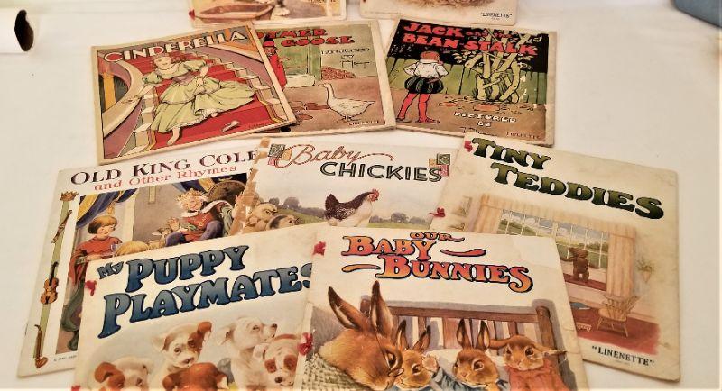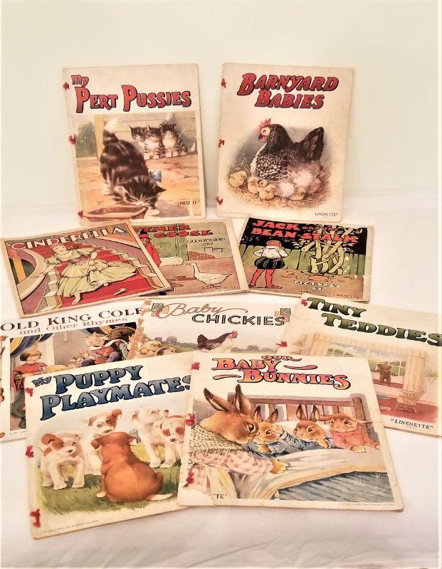 This lot of 10 different children's books - done in "Linnette" for little folks - were published by Samuel Gabriel Sons & Co. Each measures 7.2" x 8.5". Good antique condition. A great addition to any antique children's book collection.