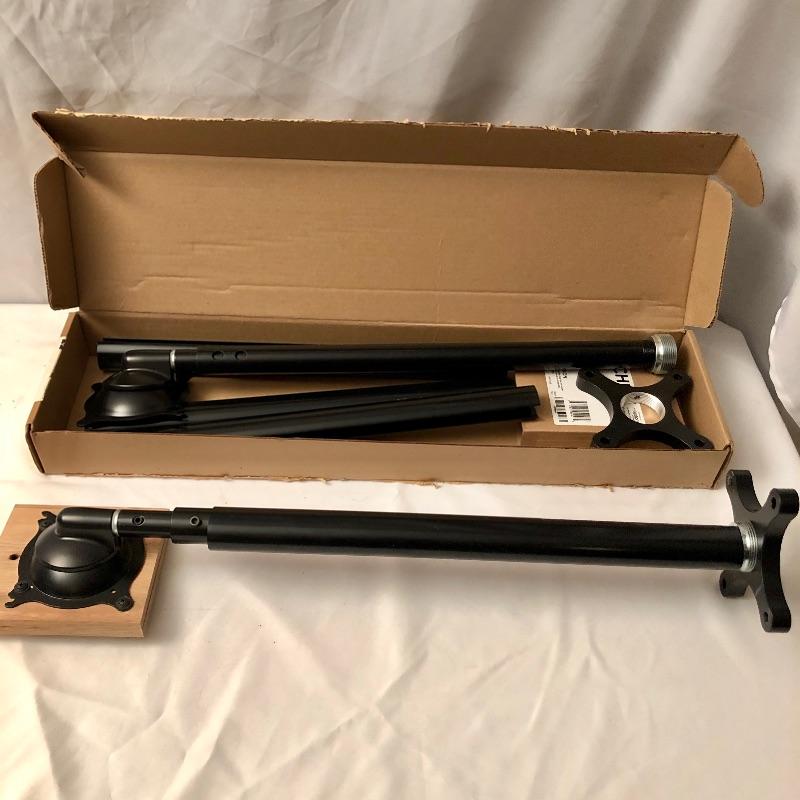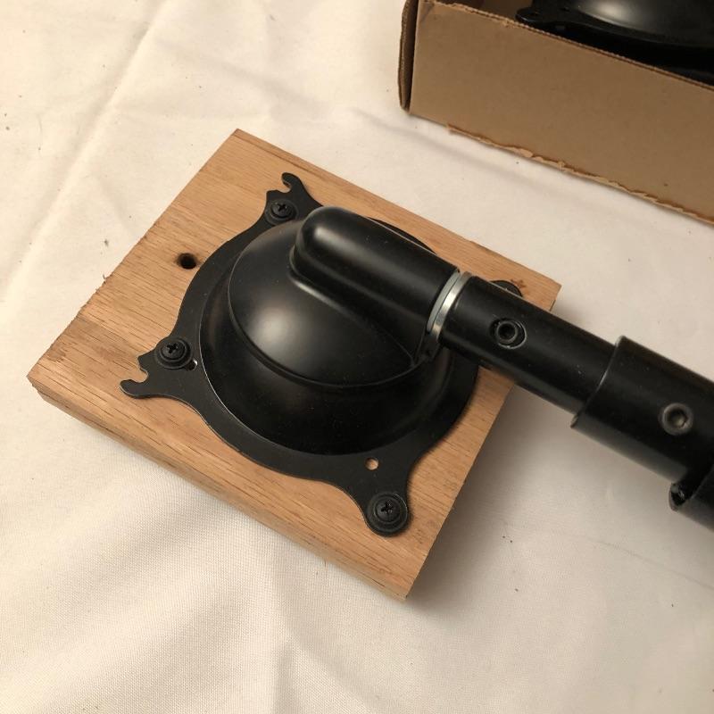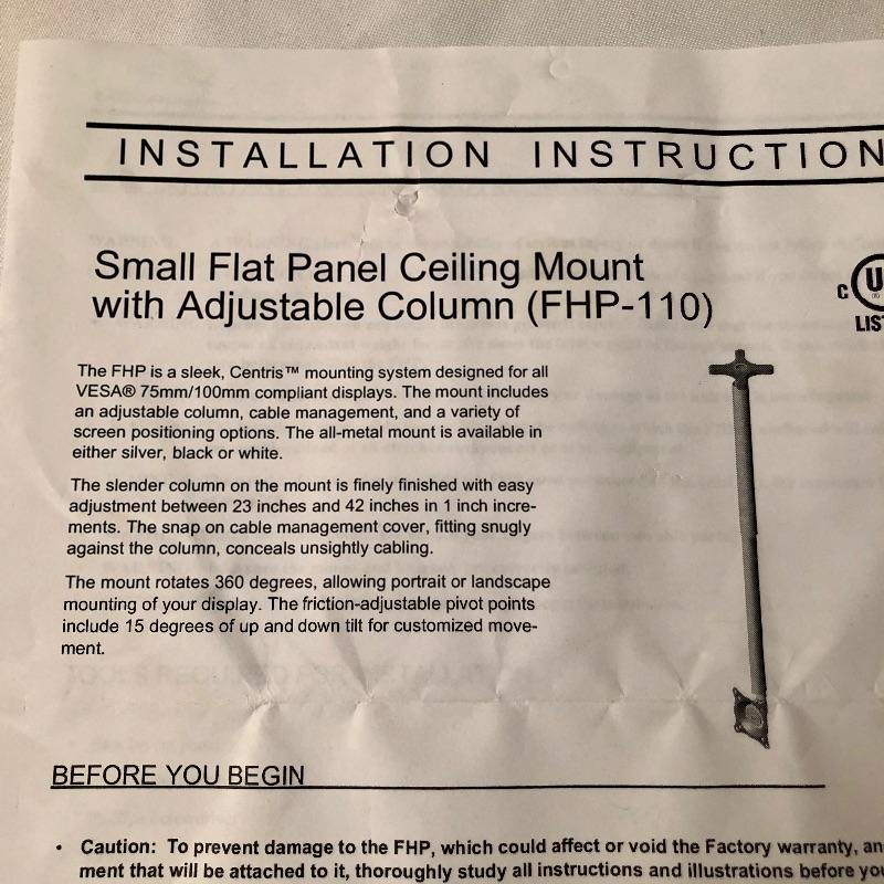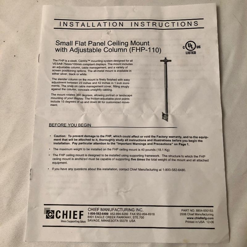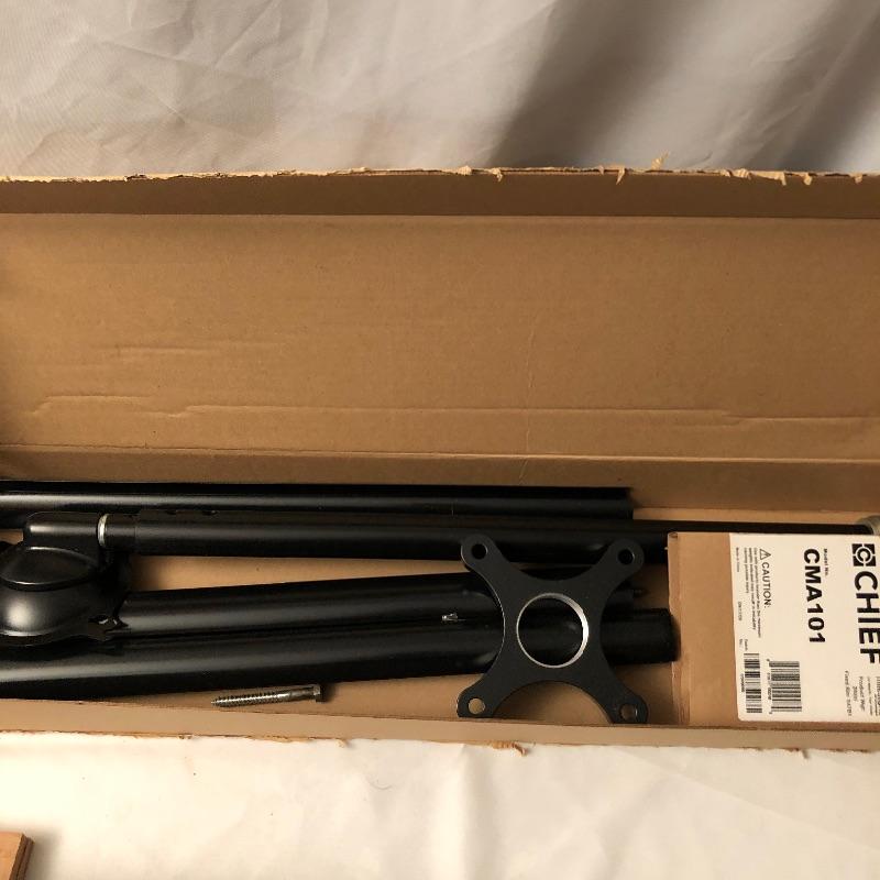 Two adjustable small flat panel ceiling mounts. One had been installed and taken down, the other is still in its box. These mounts hold up to 40 pounds each and rotate 360 degrees allowing for portrait or landscape mounting of your display and also the scope to tilt up or down 15 degrees.