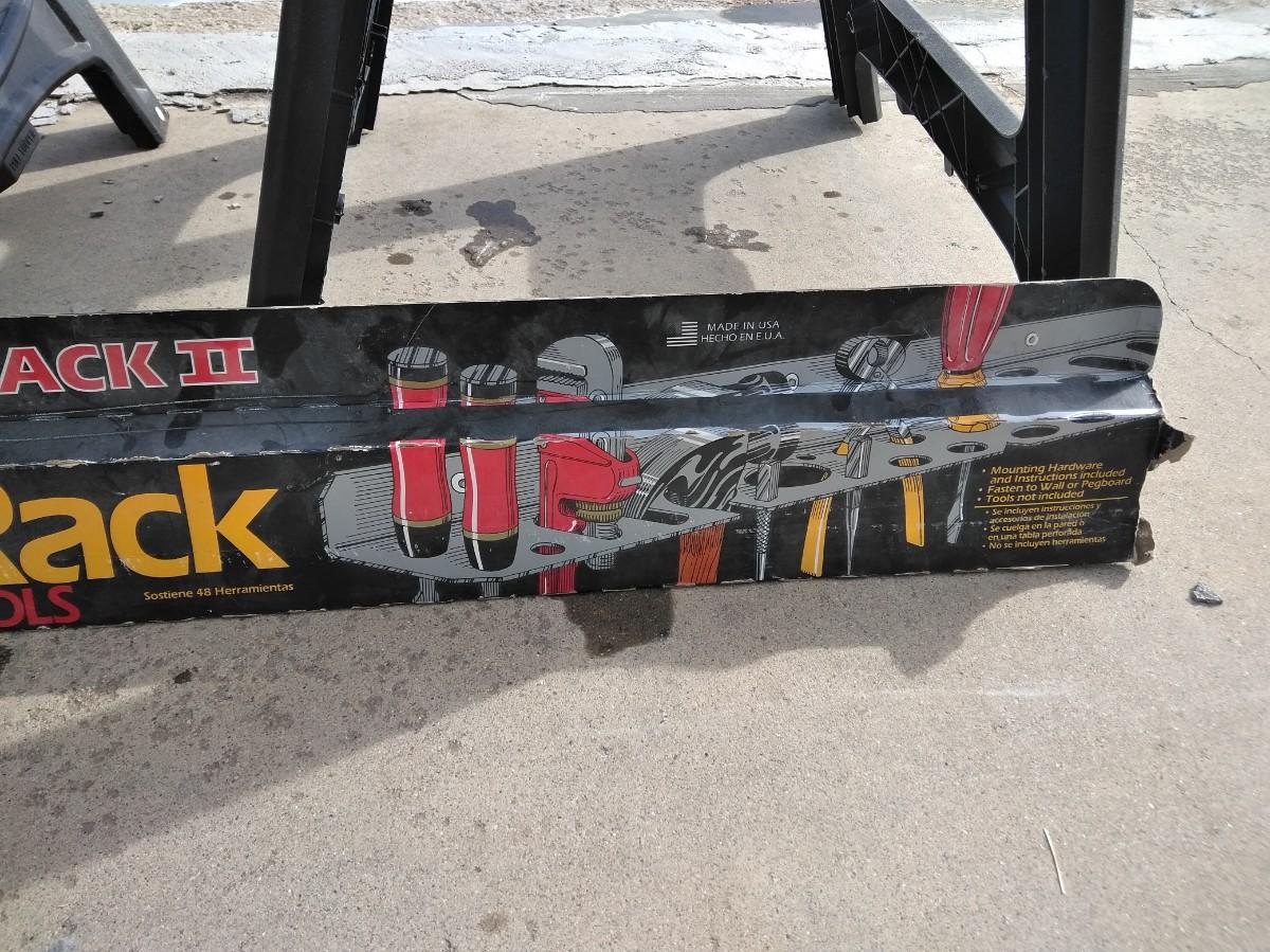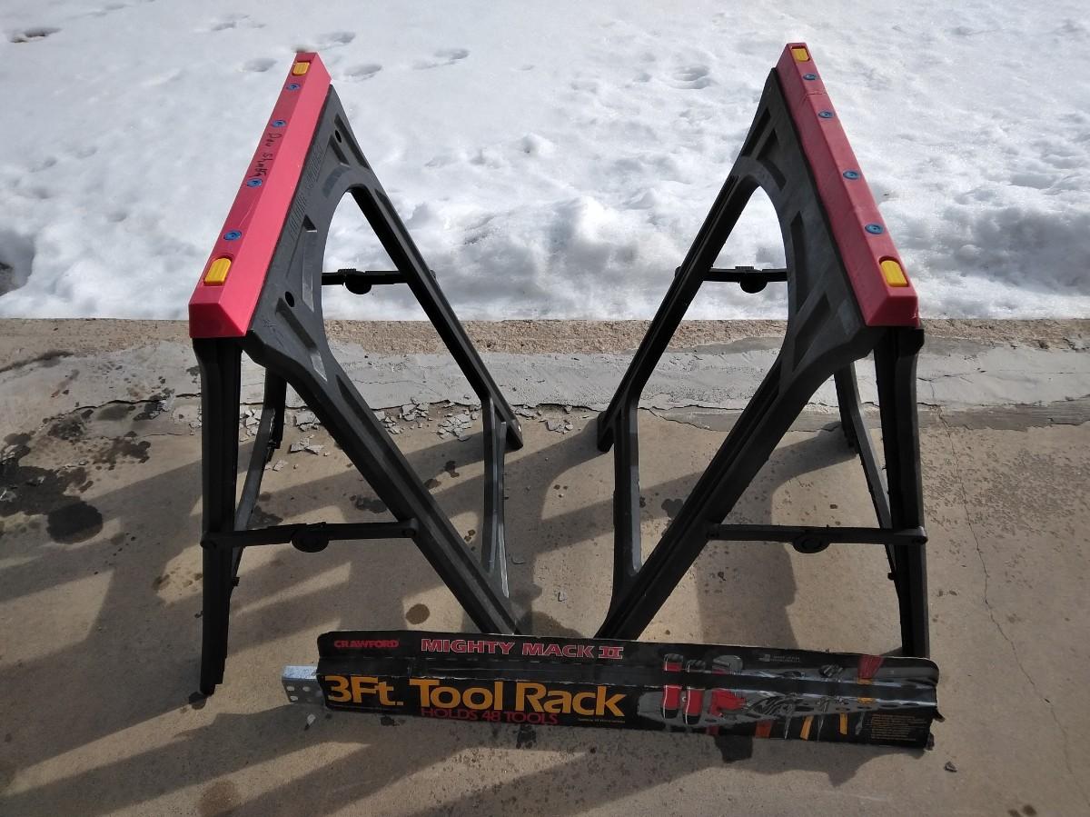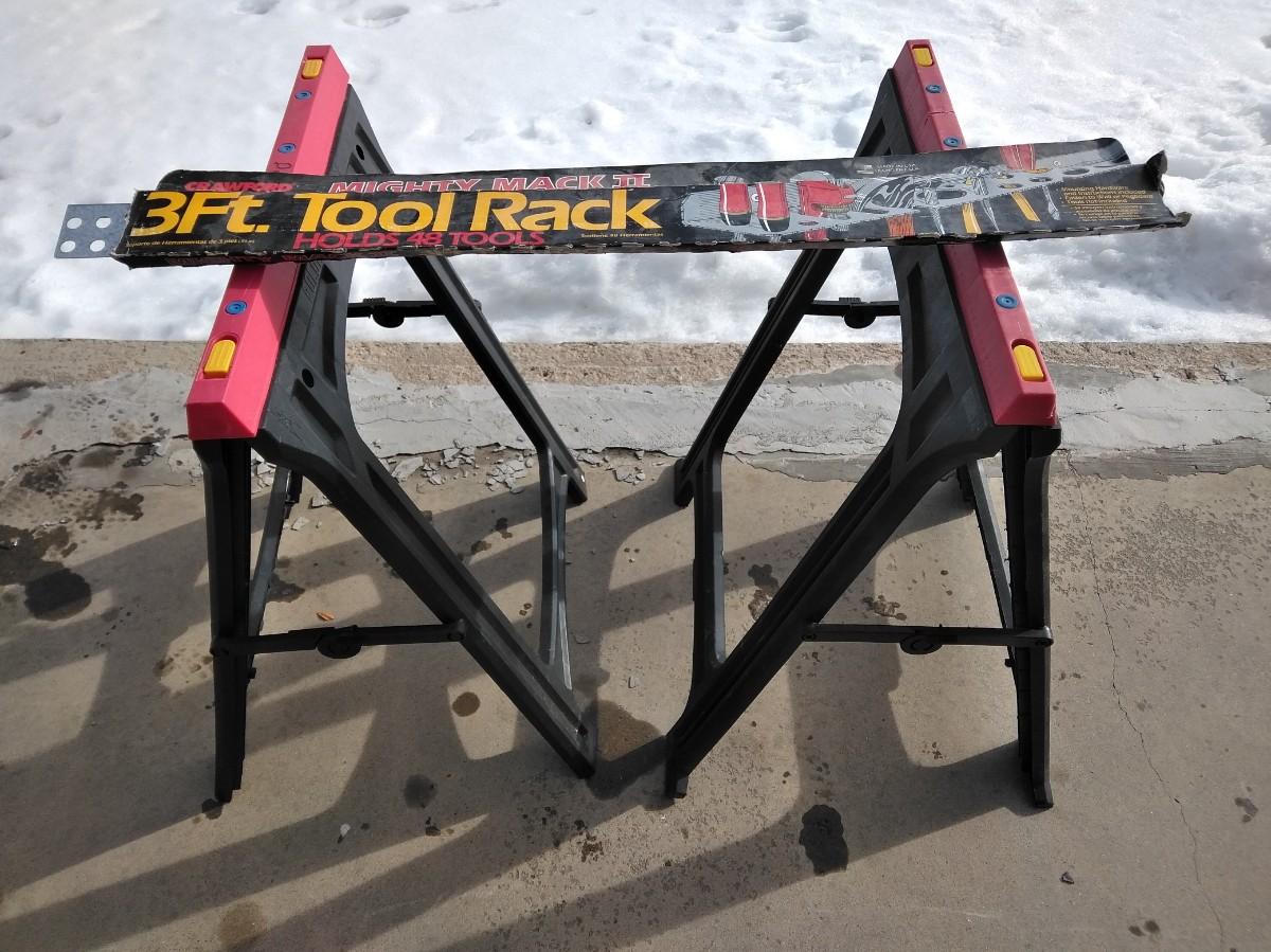 TWO COLLAPSE & STORE SAW-HORSES (one has cut mark) AND A 3 FOOT MIGHTY MACK 2 TOOL RACK HOLDS 48 TOOLS.