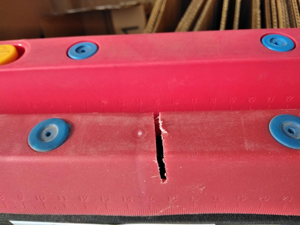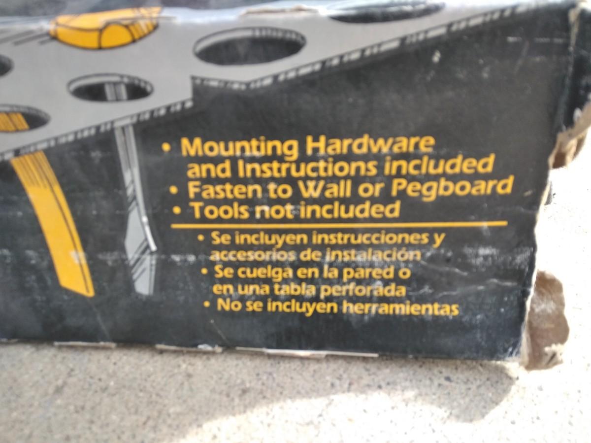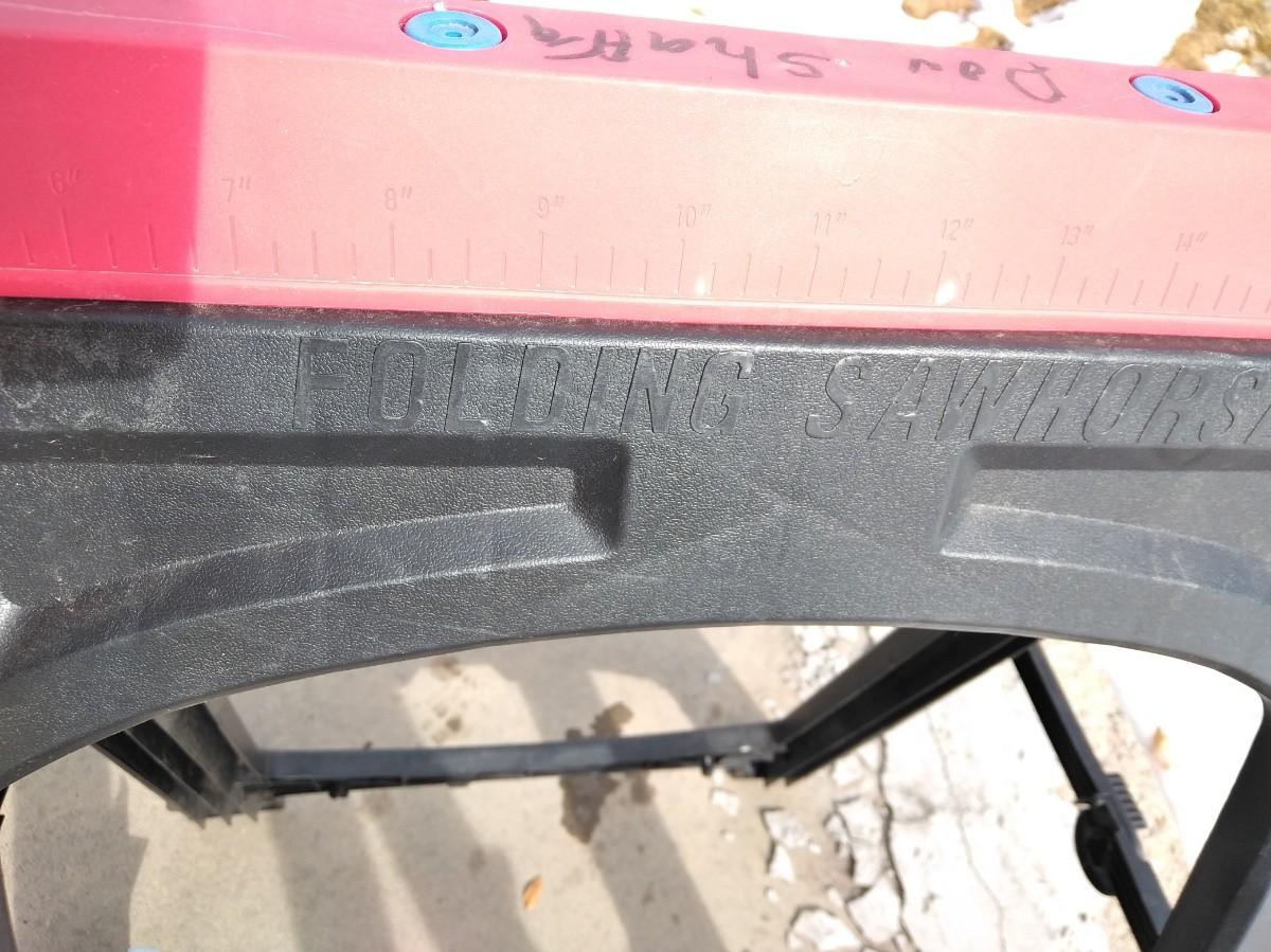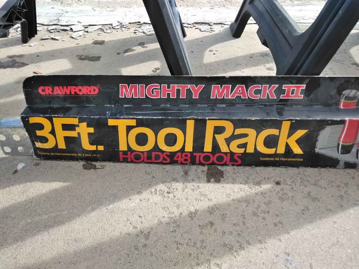 TWO COLLAPSE & STORE SAW-HORSES (one has cut mark) AND A 3 FOOT MIGHTY MACK 2 TOOL RACK HOLDS 48 TOOLS.