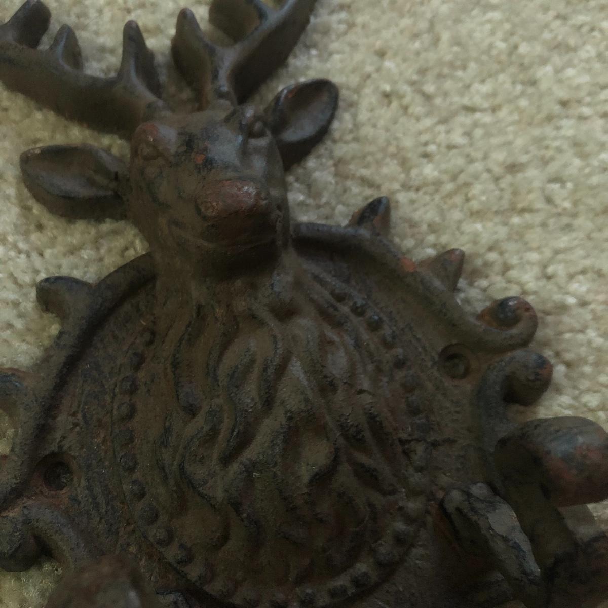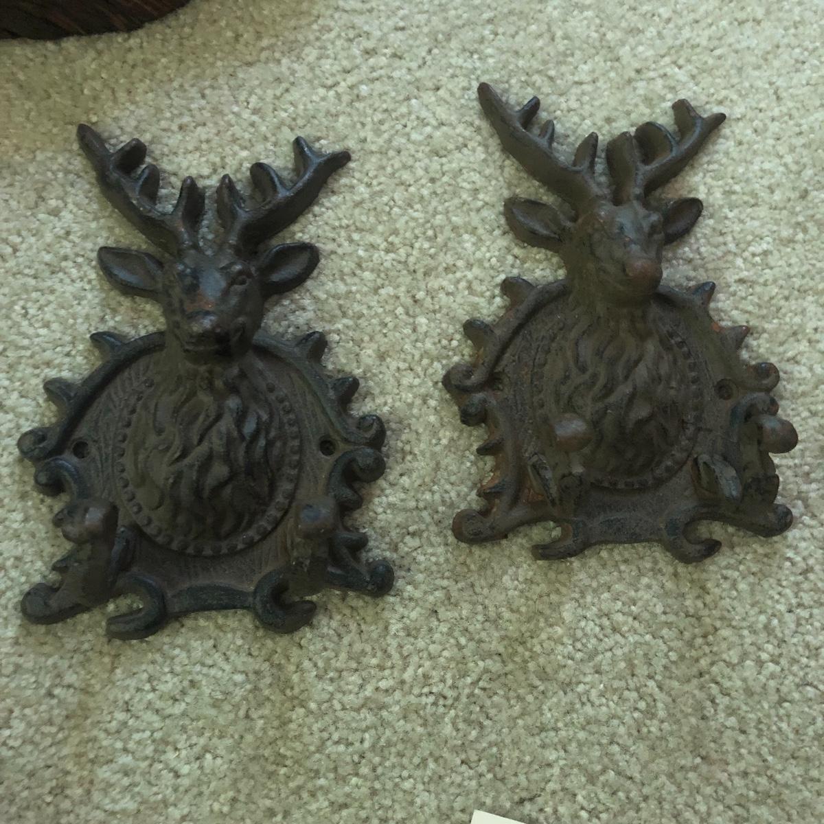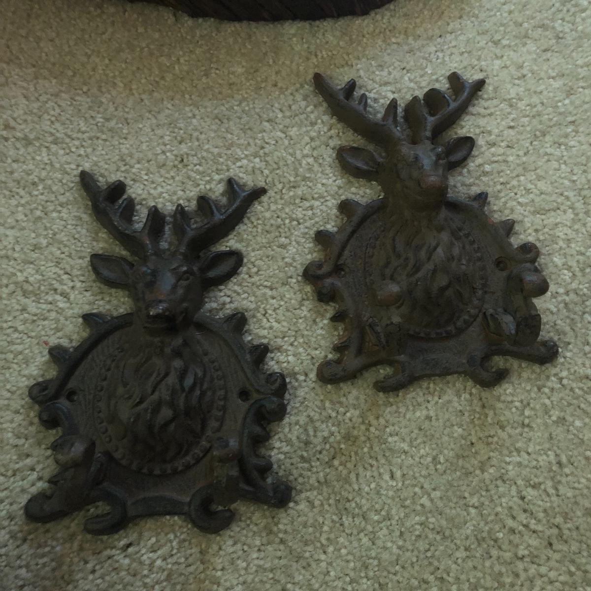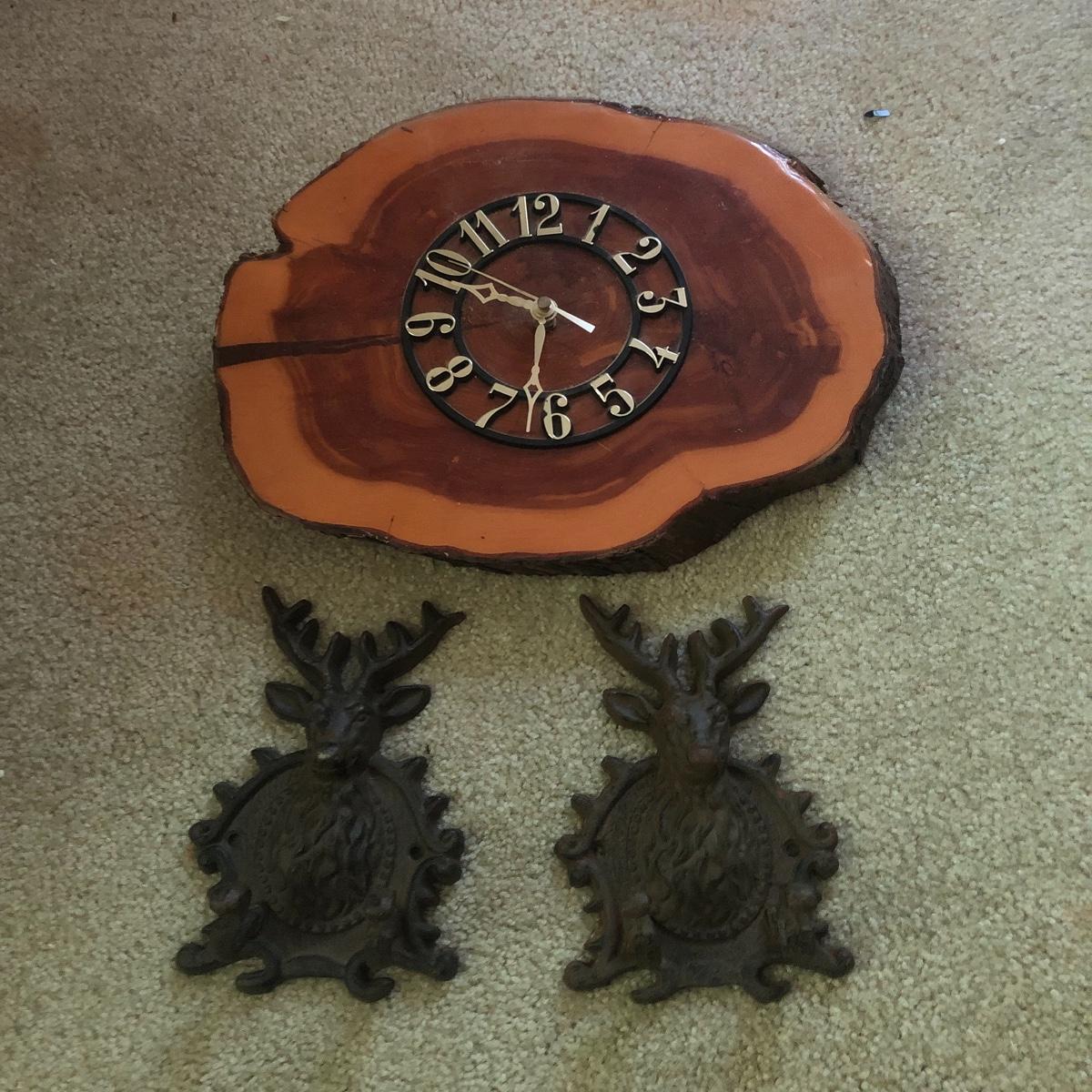 This lot contains two wrought iron elk hangers and a battery operated wall clock. The elk wall hangers measure 5” x 8”. Both of them have holes for hanging on the wall. One has a loose hanger which can be remedied by tightening the screw. The wood. clock measures 14” x 11”. It appears it needs a new battery so was not tested.. Shipping Available.
