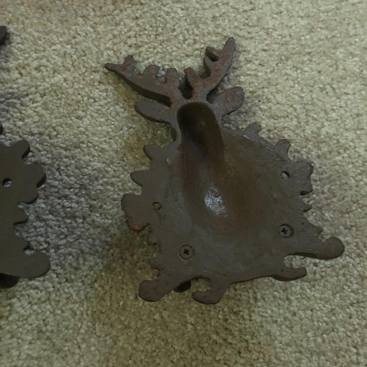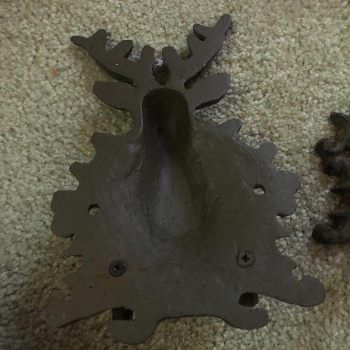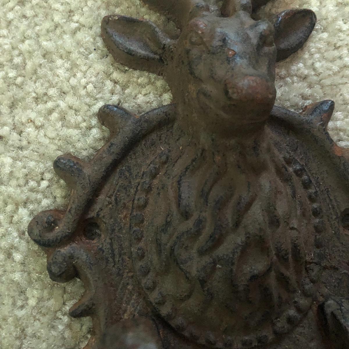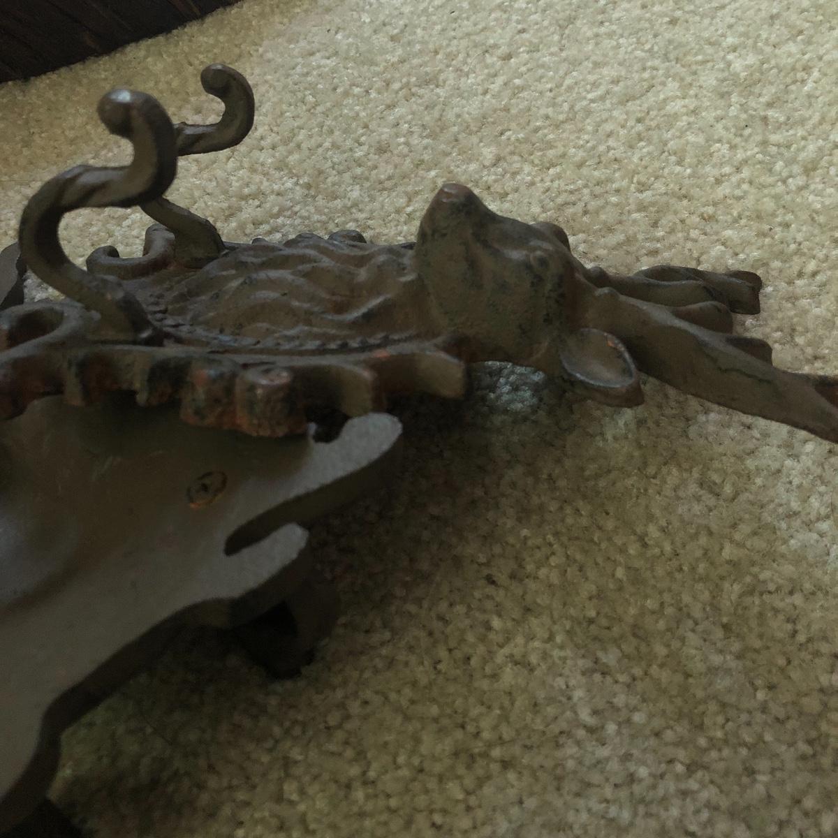 This lot contains two wrought iron elk hangers and a battery operated wall clock. The elk wall hangers measure 5” x 8”. Both of them have holes for hanging on the wall. One has a loose hanger which can be remedied by tightening the screw. The wood. clock measures 14” x 11”. It appears it needs a new battery so was not tested.. Shipping Available.