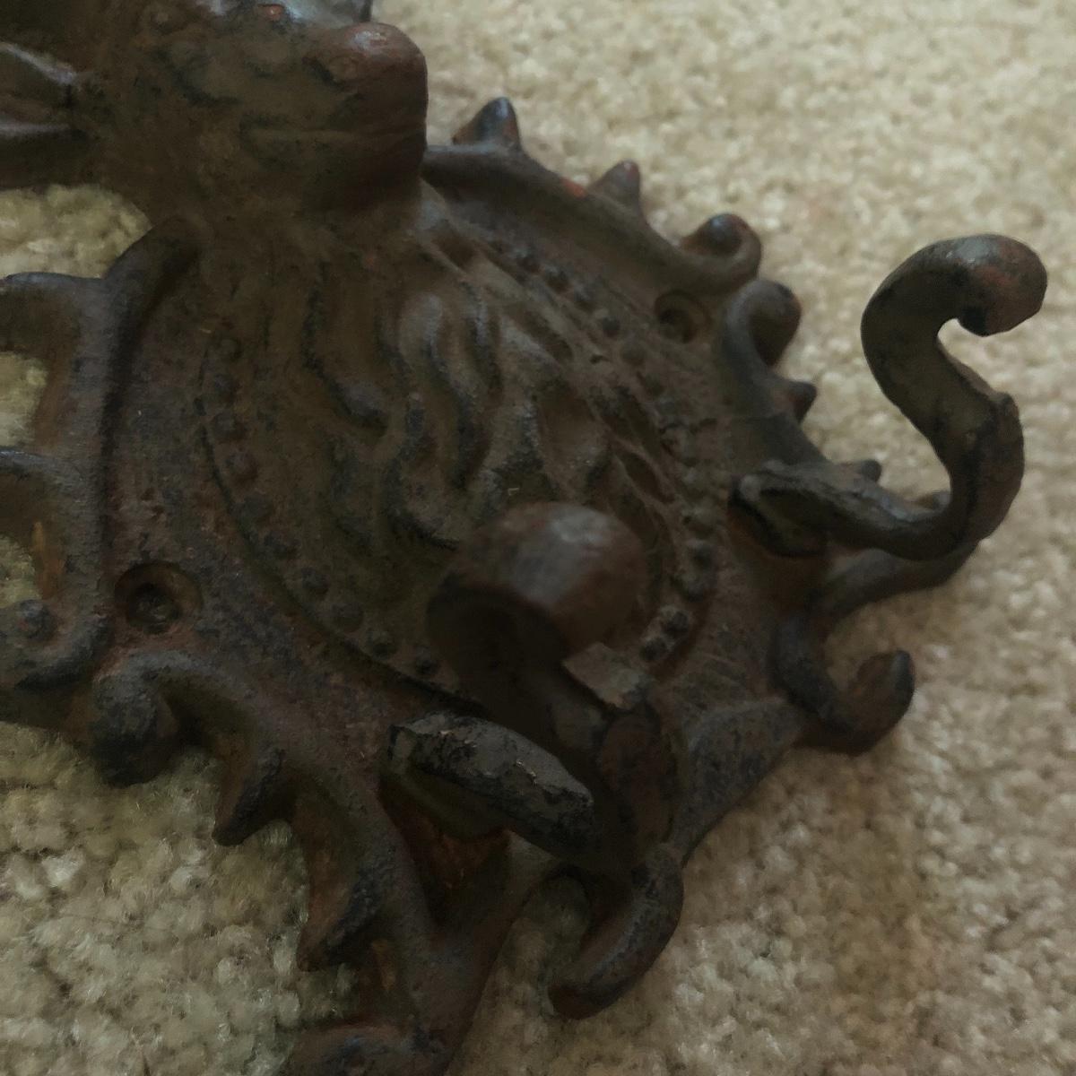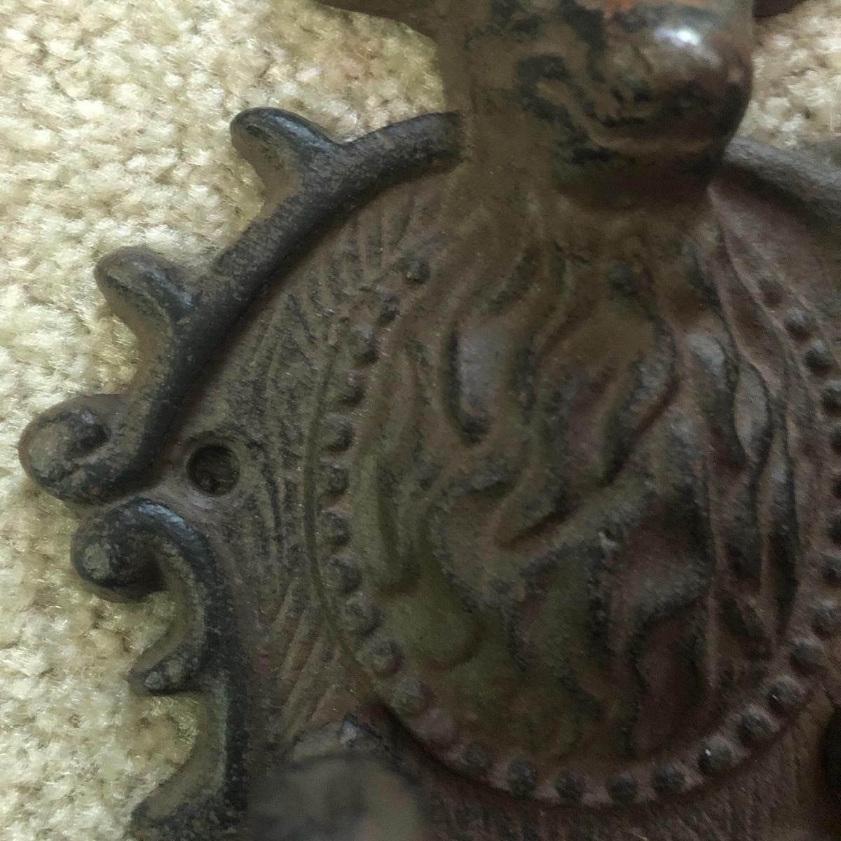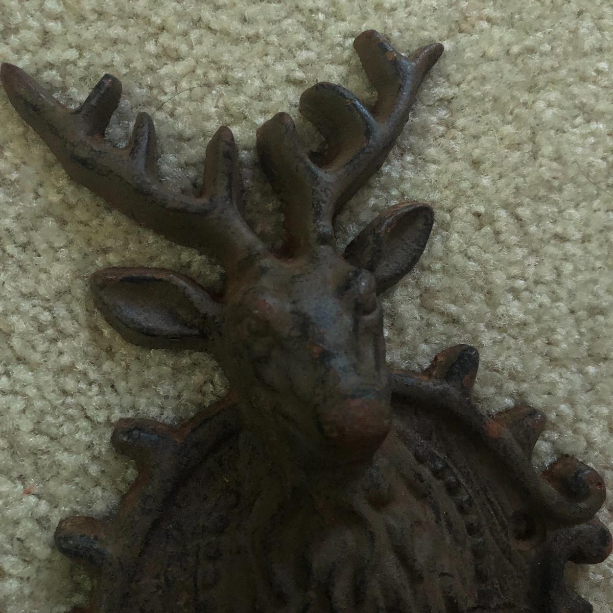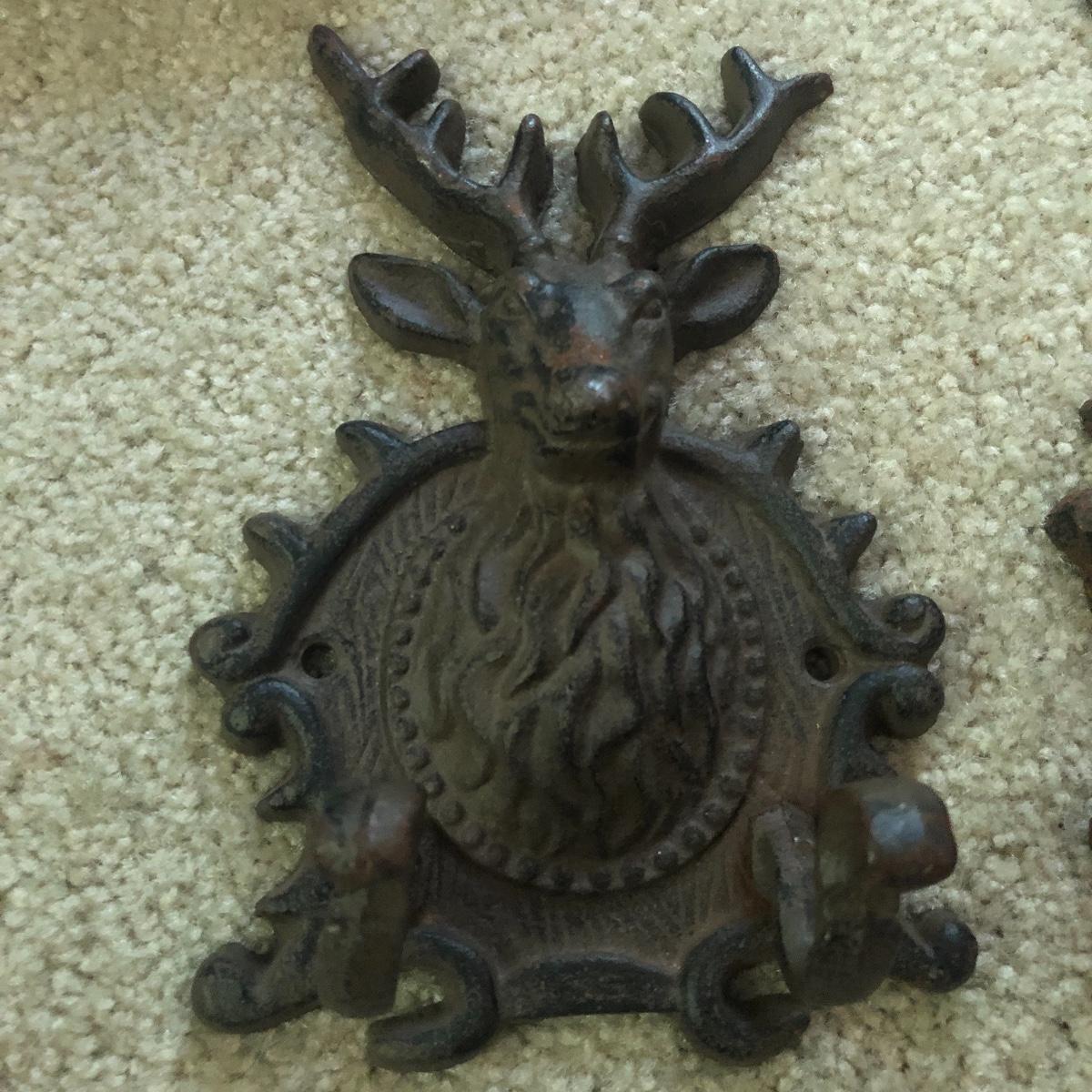 This lot contains two wrought iron elk hangers and a battery operated wall clock. The elk wall hangers measure 5” x 8”. Both of them have holes for hanging on the wall. One has a loose hanger which can be remedied by tightening the screw. The wood. clock measures 14” x 11”. It appears it needs a new battery so was not tested.. Shipping Available.