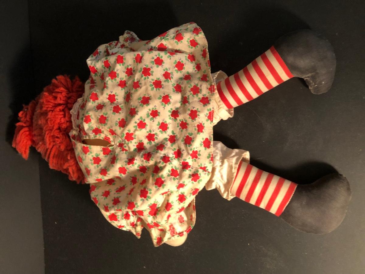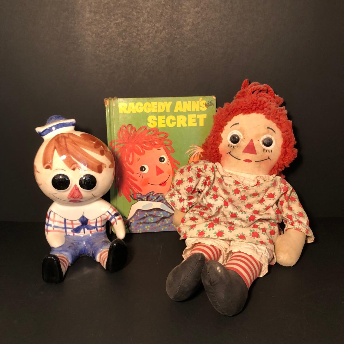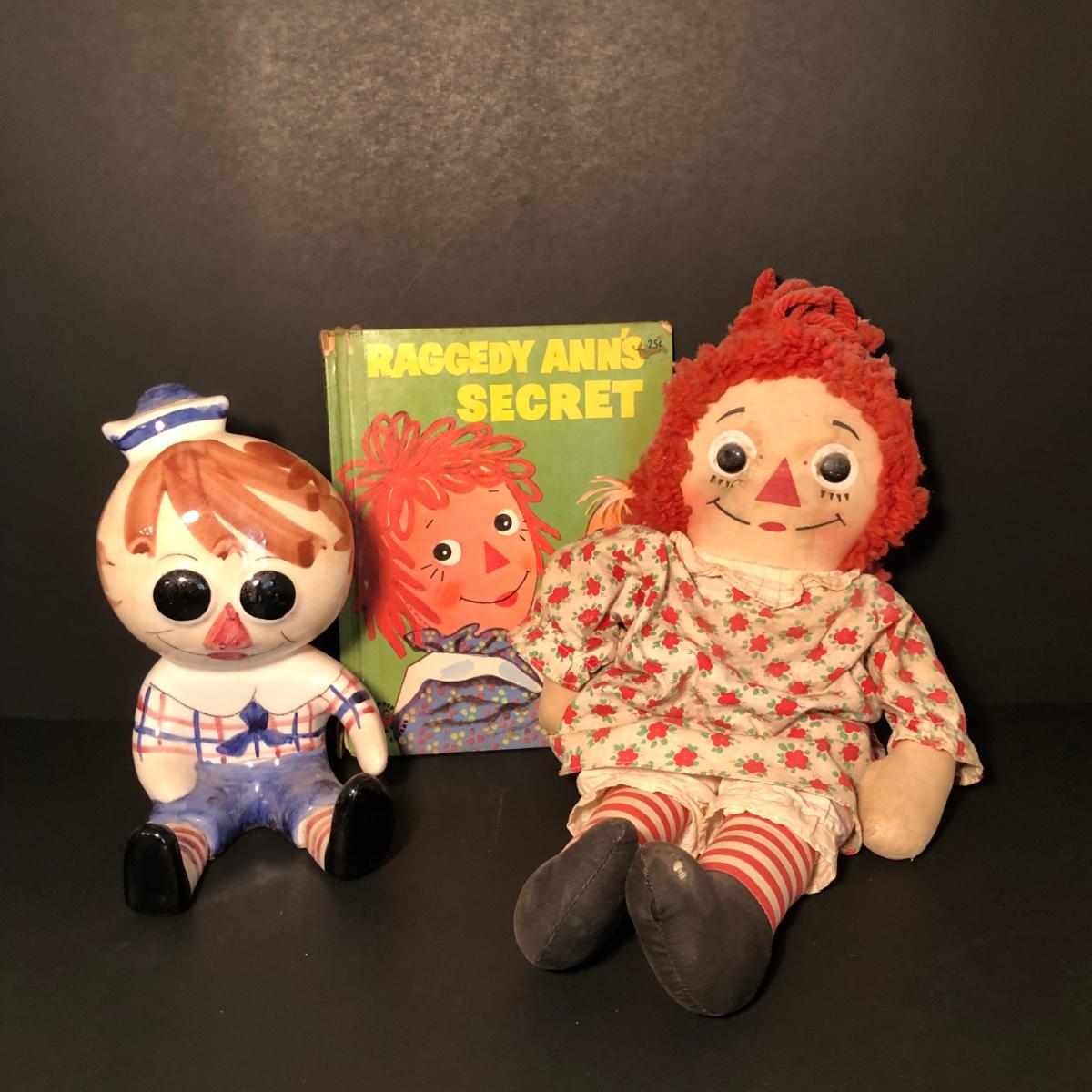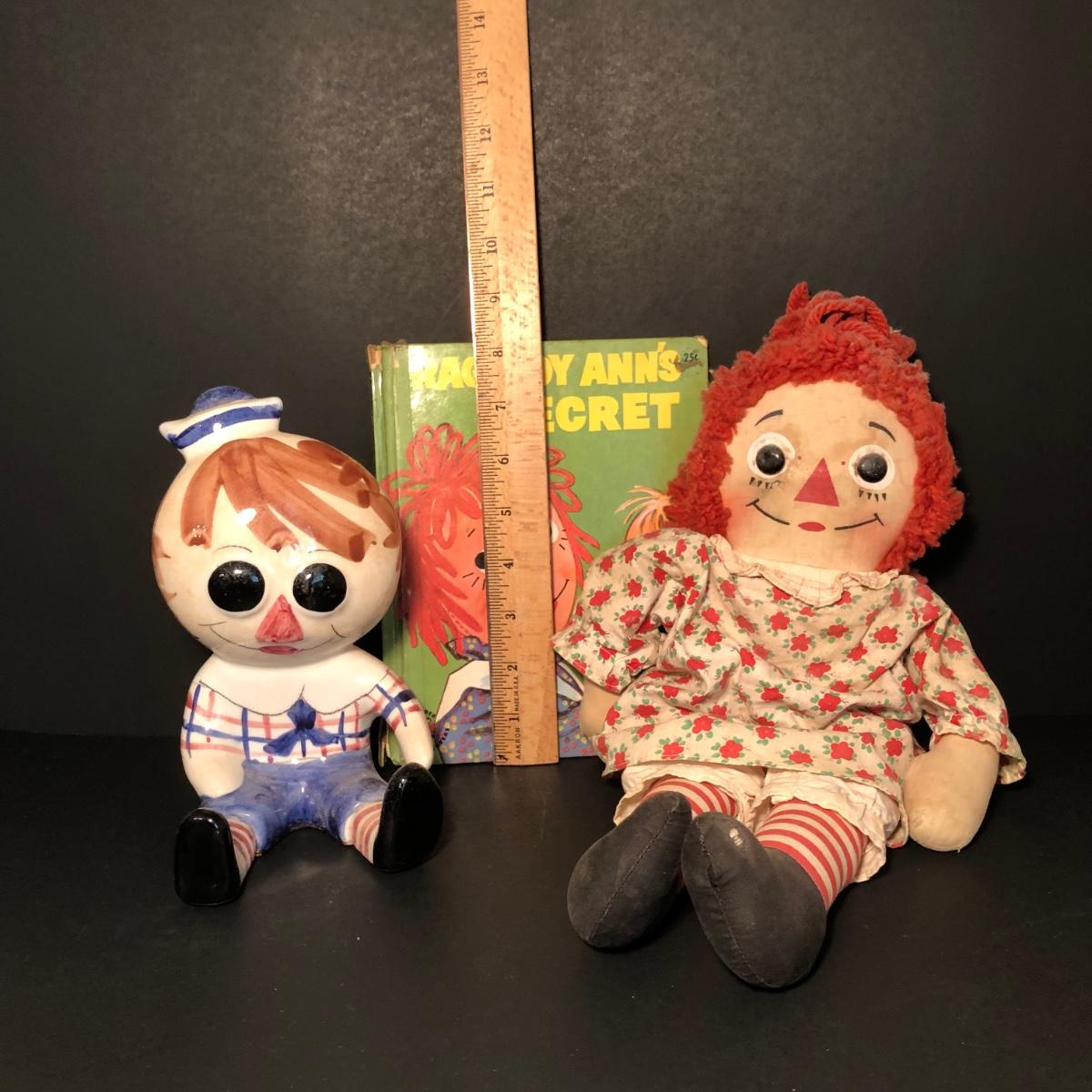 LOT 278F: Vintage Raggedy Ann Doll, Vintage Italian Raggedy Andy Coin Bank & 1959 Raggedy Ann's Secret Book